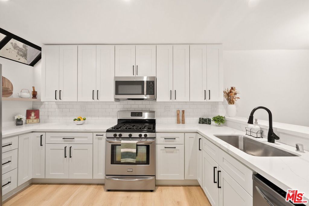 Welcome to this beautifully renovated two story, 2-bedroom, 2.5 bathroom townhome style condo located in the heartbeat of Santa Monica. Experience the perfect blend of effortless coastal living and unbeatable urban convenience in a fantastic location! Nestled on a quiet, tree-lined street in a small modern 8-unit building in one of Santa Monica's most vibrant areas; everything you can possibly need is a short stroll away: If LA driving has got you down park your car for the weekend and enjoy world-class dining and shopping on 3rd St, Main Street and Montana Avenue just minutes away. Stay active with nearby gyms, yoga studios, and bike paths, or unwind at the beach-a mere 10 minute stroll or bike ride! Blocks away from Trader Joe's, Von's, CVS, Santa Monica Library, movie theaters, Farmer's Market, Palisades Park and more! Inside, you'll find new wide-plank flooring in a light oak finish, a bright newly remodeled open kitchen, with ample cabinetry, stainless steel appliances, quartz countertops, tile backsplash and recessed lighting. The spacious living room is anchored by a cozy Venetian Plaster fireplace and opens to an expansive outdoor patio, perfect for entertaining and relaxing evenings under the stairs. Upstairs, the light-filled primary suite boasts a custom closet, dual vanity, and private bath with a second bedroom and separate full bathroom nearby. A tucked-away in unit laundry area, Ecobee thermostat, central HVAC, tankless water heater and smart entry lock complete the home's conveniences. Additional highlights include plenty of storage with an oversized hallway closet and two private storage cabinets in the community garage. 2 separate parking spaces (not tandem), pet friendly. Conveniently located near freeway access and the Metro Expo line for easy connectivity to greater Los Angeles; Situated in top rated Roosevelt and Lincoln school districts. This property is a rare find with its pefect blend of style and comfort ready for you to make it your own. This is truly Westside living at its best!