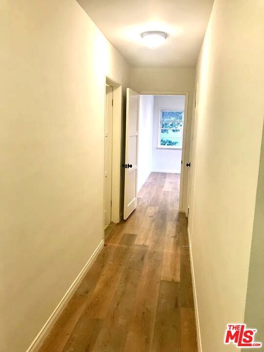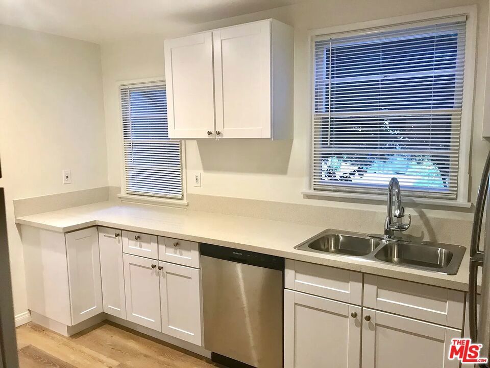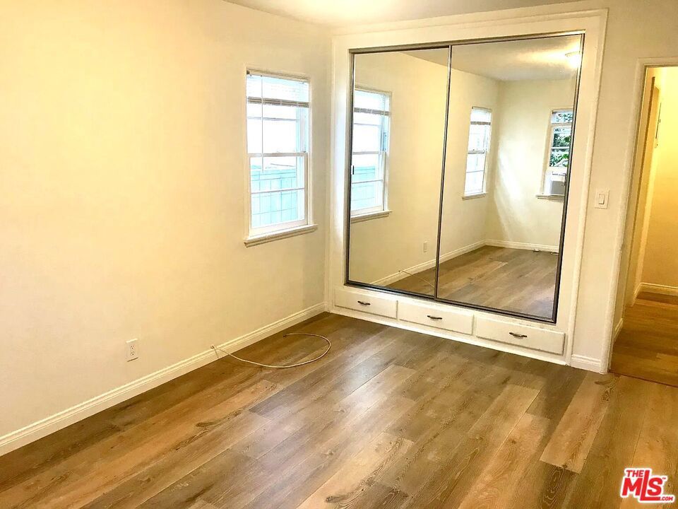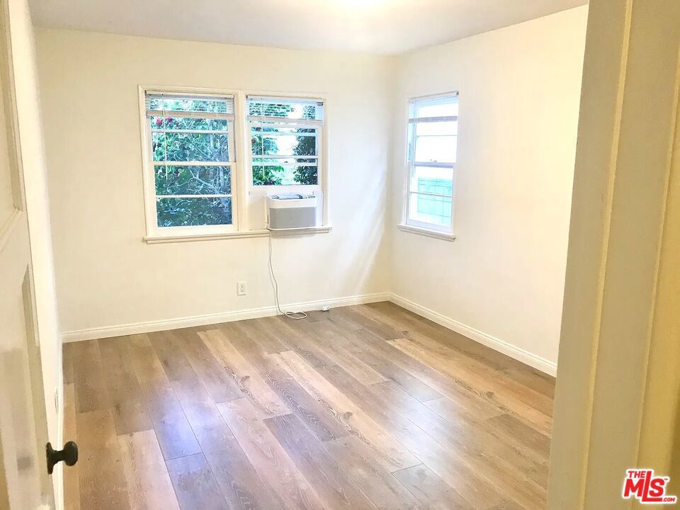 Prime North of Wilshire. Lower unit of triplex, spacious one-bedroom, one-bathroom in prime location. Hardwood floors, newly remodeled bathroom just completed, stainless appliances (dishwasher, microwave, range, fridge), recessed lighting, window shades and drapes. Eat-in kitchen, A/C, inside access to attached laundry and attached enclosed private electric garage with remote and storage. Unit opens up to beautiful shared courtyard. Private setting, unique opportunity. Walk to Montana Ave. restaurants and shops. Roosevelt Elementary and Lincoln Middle schools. Available now.