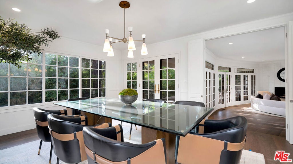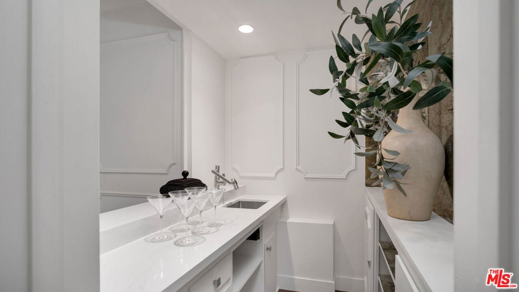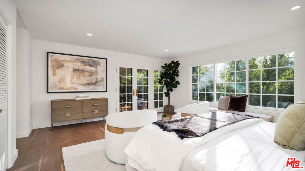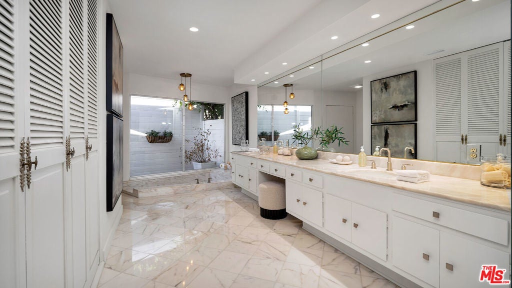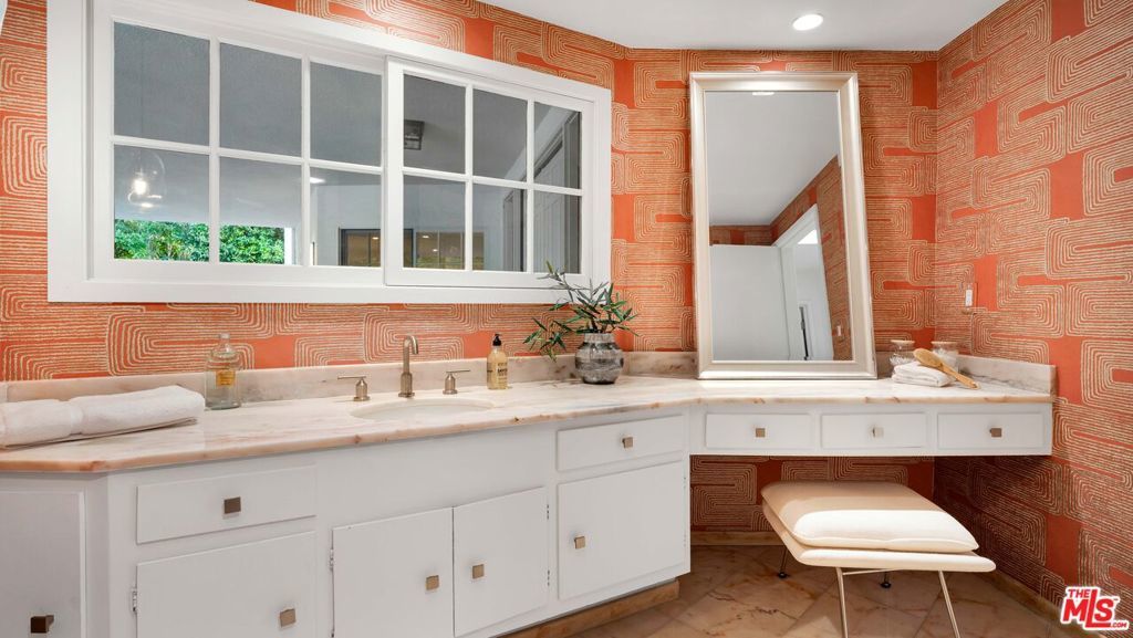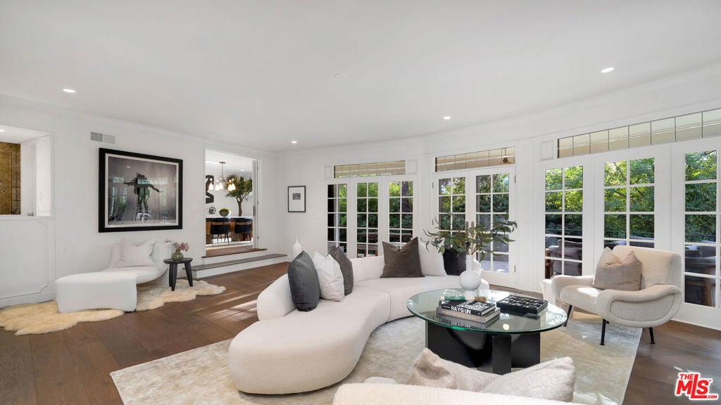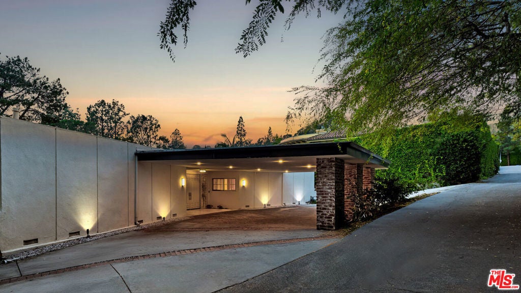 Tucked into one of Angelo Drive's most coveted enclaves, this masterfully renovated mid-century residence blends classic 1960s architecture with elevated contemporary upgrades, thoughtfully integrated to preserve the home's mid-century character. Set on a secluded drive just moments above Sunset Blvd, the property offers unmatched privacy and tranquil treetop outlooks.Beautifully reimagined, the approx. 3,400 SF floor plan includes 4 bedrooms and 4 refined baths, with expansive, sun-filled living spaces framed by restored French doors and oversized windows. A deep wraparound balcony connects the living room, dining room, and primary suite, creating a seamless indoor-outdoor flow. The sun-washed chef's kitchen features a generous stone-topped island, premium stainless appliances, custom cabinetry, and a sunlit breakfast nook. The primary suite opens directly onto the terrace and enjoys serene garden views and a spa-inspired bath with dramatic stone finishes, large walk-in shower, and a deep step-down soaking tub. Curated upgrades throughout include new flooring, renovated bathrooms, designer lighting, refreshed finishes, and improved systems. The grounds include mature landscaping, a spacious terrace for dining and lounging, and a wide motor court with covered parking. A refined, mid-century retreat in one of BHPO's most discreet pockets-offering privacy, architectural charm, and effortless access to Beverly Hills, Holmby Hills, and top-rated Warner Avenue Elementary.