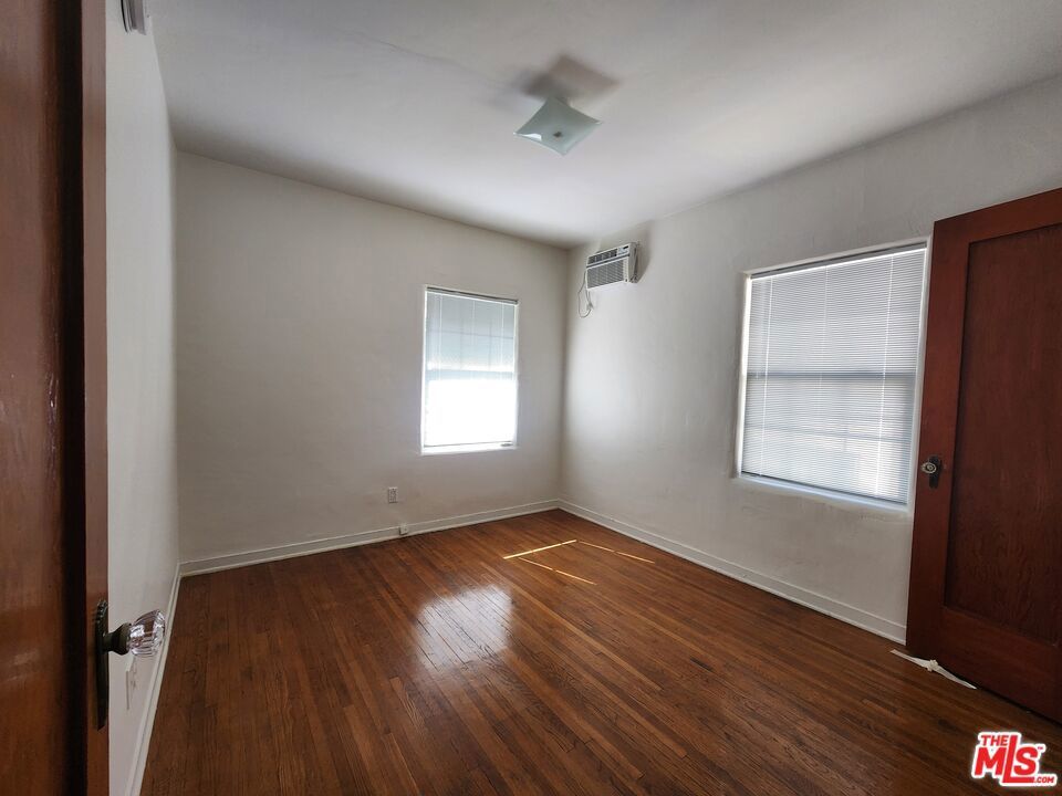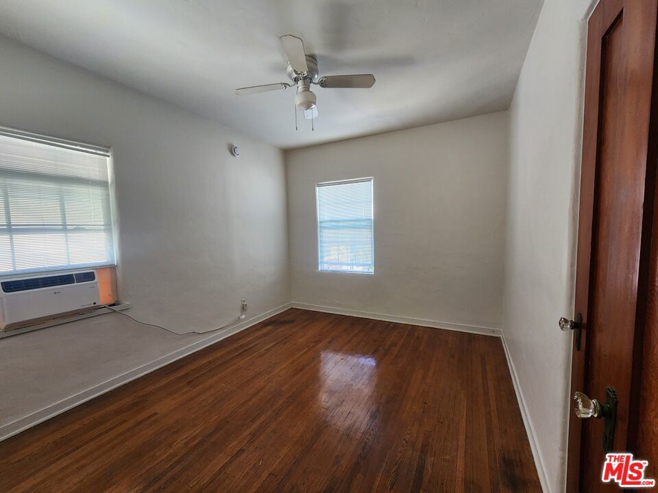 Quiet, private, and filled with natural light. Charming, rare detached 2BR/1 BA upper unit with no shared walls and windows on all four sides. Privately located above the garage. Beautiful unit with vintage character: hardwood floors, double-pane windows, bright living room, formal dining area with attractive built-in china cabinet, and linoleum floor in kitchen. Linen cupboard and drawers in the hallway. Bathroom with separate shower stall, new tile flooring and newly glazed bathtub. Gas wall heater, ceiling fan and two AC units. Private washer and dryer in garage (for use by this unit only). Prime West Hollywood location near Fairfax & Santa Monica Blvd, walking distance to Whole Foods, cafes, restaurants, gyms, Plummer Park, and transit. A peaceful standalone residence in the center of it all. Shown by appointment only. No pets, No smoking; credit score over 675.