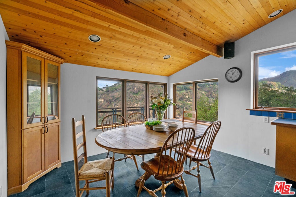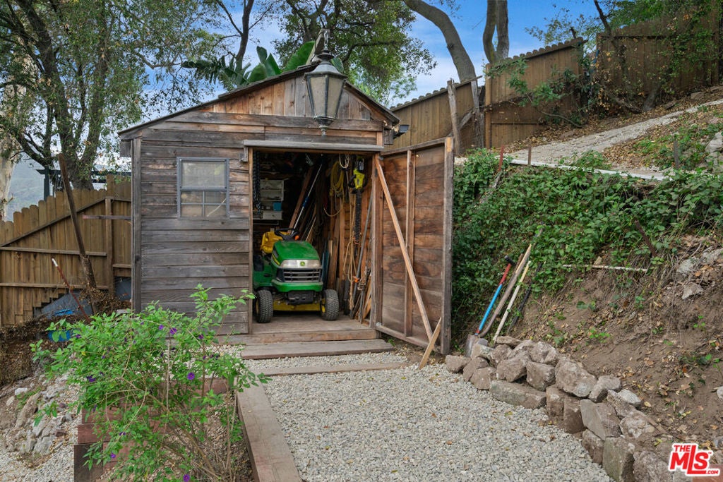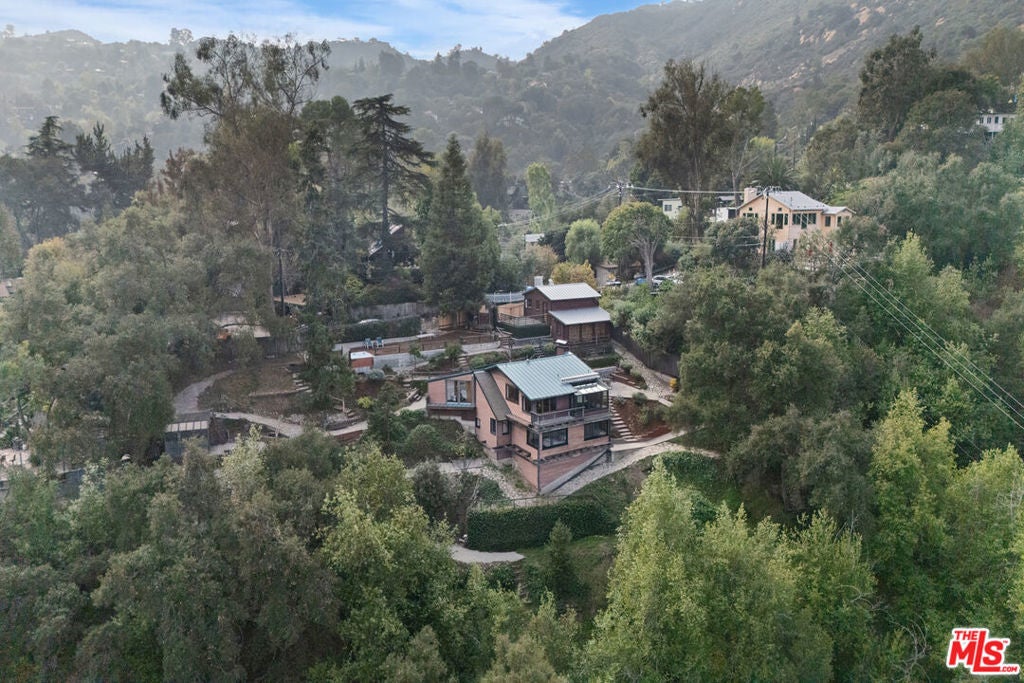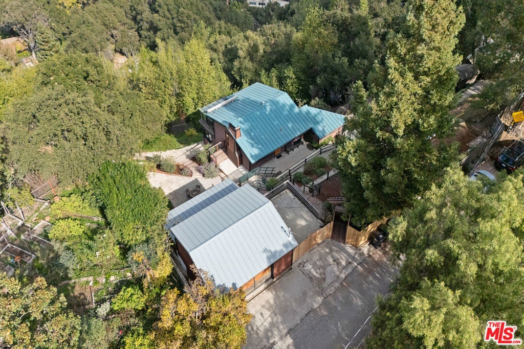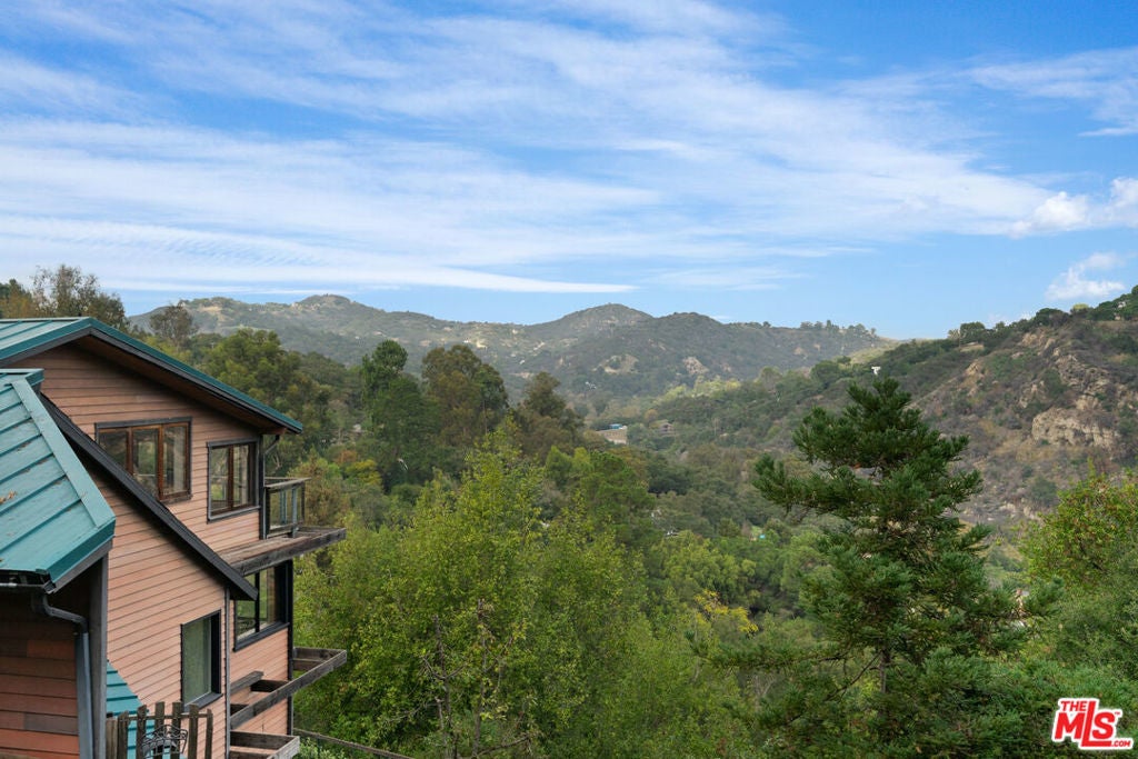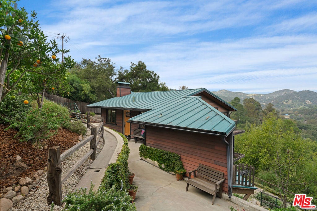 First time on the market in over 30 years, this lovingly remodeled and privately located former hunting lodge has some of the best views in Topanga. Located in Fernwood and situated on 4 lots totaling nearly 2/3 of a secluded acre, this metal-roofed home is thoughtfully landscaped with natives, Mediterranean, and drought-tolerant plantings. Enter through the dramatic main-floor living area, with kitchen, living, and dining rooms, and a versatile den/3rd bedroom. Spacious living room has vaulted ceilings, wood floors, and a gas fireplace with an electric starter. Open kitchen lets you enjoy the views while cooking, and friends can gather at the long bar. There are slate floors, custom cabinetry, a GE monogram refrigerator, and a Thermador range and dishwasher. All rooms have far-reaching views, and the convertible den has a glass ceiling allowing you to look up to the clouds. Main-level bath has a claw-foot tub, where you can relax and soak in the views. Lower level features two bedrooms where you wake up to a colorful sunrise, a unique bathroom with a river-rock-lined shower, laundry area, and open family area. Separate light-filled studio is a great creative space away from the main house, wired for internet, and is the perfect spot for your morning asanas and afternoon workspace.Outdoors, you can wander through the yard unseen by neighbors, on the rock pathways to the many sitting areas, the upper-level Sundance hot tub with mountain views, and a tree house. The well-maintained yard features colorful natives, fruit trees, and stately mature trees. Harvest your own fruit with orange, pomegranate, apricot, and cherry trees, and blackberry bushes. The house comes with tools and equipment to maintain your new property, including a small tractor for getting around the yard.Located on a quiet cut-de-sac, there is a fenced entry, plenty of parking, with a two-car garage, separate gated parking area, and additional parking out front.
