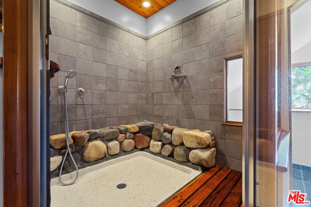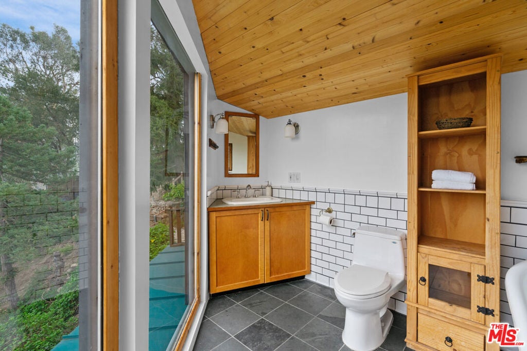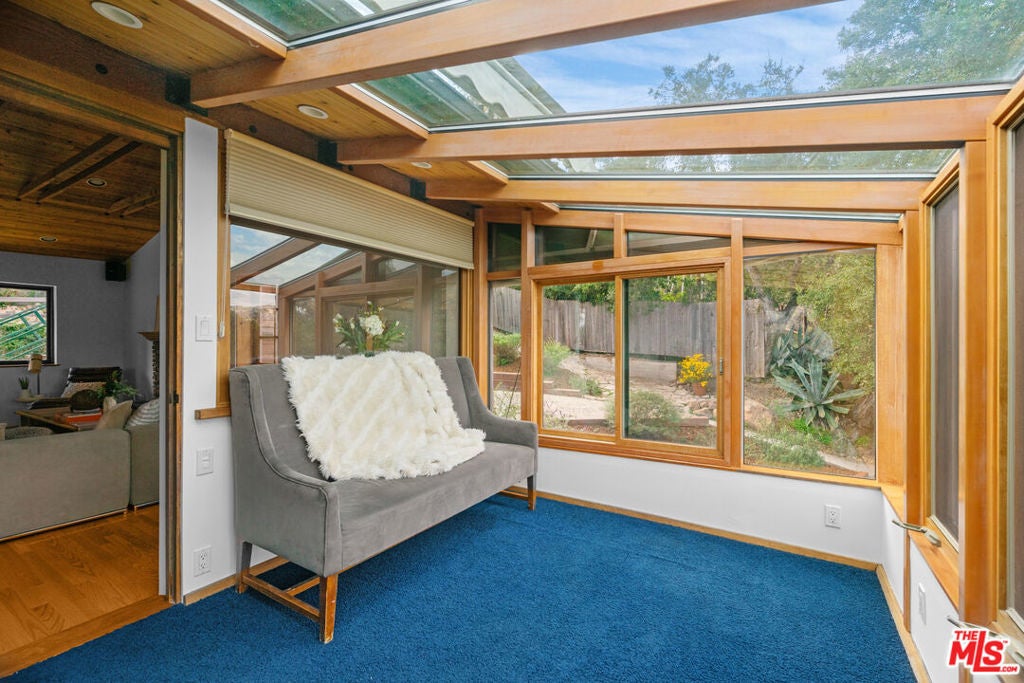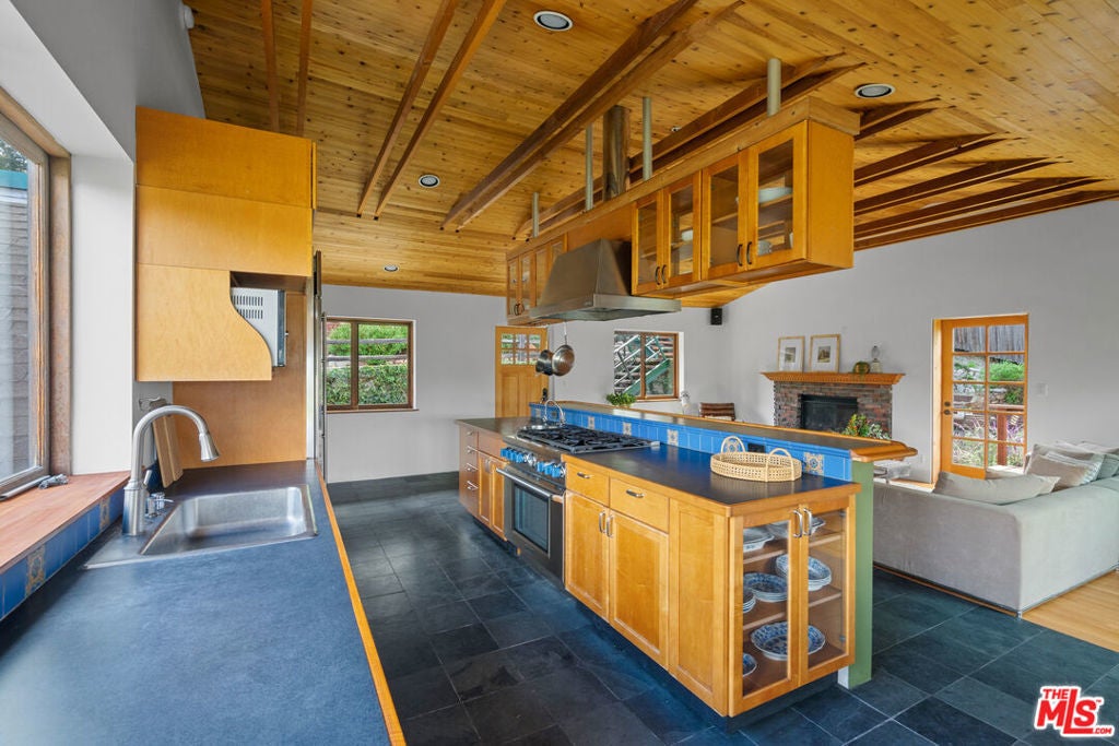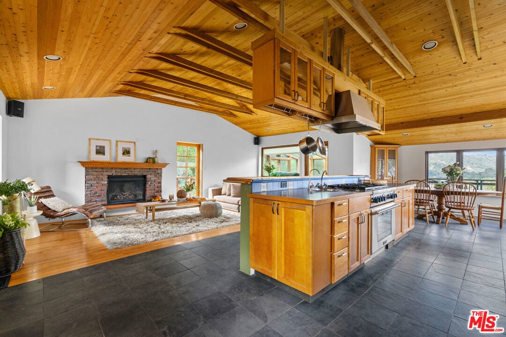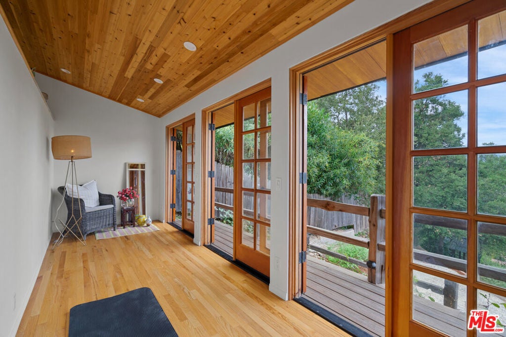 First time on the market in over 30 years, this lovingly remodeled and privately located former hunting lodge has some of the best views in Topanga. Located in Fernwood and situated on 4 lots totaling nearly 2/3 of a secluded acre, this metal-roofed home is thoughtfully landscaped with natives, Mediterranean, and drought-tolerant plantings. Enter through the dramatic main-floor living area, with kitchen, living, and dining rooms, and a versatile den/3rd bedroom. Spacious living room has vaulted ceilings, wood floors, and a gas fireplace with an electric starter. Open kitchen lets you enjoy the views while cooking, and friends can gather at the long bar. There are slate floors, custom cabinetry, a GE monogram refrigerator, and a Thermador range and dishwasher. All rooms have far-reaching views, and the convertible den has a glass ceiling allowing you to look up to the clouds. Main-level bath has a claw-foot tub, where you can relax and soak in the views. Lower level features two bedrooms where you wake up to a colorful sunrise, a unique bathroom with a river-rock-lined shower, laundry area, and open family area. Separate light-filled studio is a great creative space away from the main house, wired for internet, and is the perfect spot for your morning asanas and afternoon workspace.Outdoors, you can wander through the yard unseen by neighbors, on the rock pathways to the many sitting areas, the upper-level Sundance hot tub with mountain views, and a tree house. The well-maintained yard features colorful natives, fruit trees, and stately mature trees. Harvest your own fruit with orange, pomegranate, apricot, and cherry trees, and blackberry bushes. The house comes with tools and equipment to maintain your new property, including a small tractor for getting around the yard.Located on a quiet cut-de-sac, there is a fenced entry, plenty of parking, with a two-car garage, separate gated parking area, and additional parking out front.