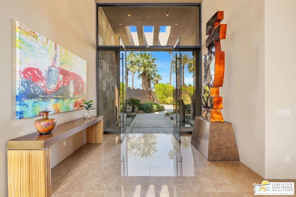 A SHOWCASE of scale, style, and spectacular indoor/outdoor living in Rancho Mirage, this 5-bedroom, 5.5-bath desert contemporary estate with a detached casita sits on 1.12 acres and features tall ceilings, floor-to-ceiling glass, and panoramic mountain views from nearly every room, with multiple outdoor living areas including a south-facing infinity pool and spa, outdoor kitchen and bar, covered patio, and spacious pool terrace designed for effortless entertaining. Art collectors will appreciate the soaring ceilings and gallery-style walls, entertainers will love the seamless indoor/outdoor flow, car enthusiasts will enjoy the gated motor court and three-car garage, and everyone benefits from the 63-panel solar system offering impressive energy efficiency. A formal entry framed by elegant fountains sets the tone and leads to a dramatic living room with a striking fireplace, destination-style wet bar, and folding glass walls that open completely to the outdoors. Adjacent dining room, with its oversized wine refrigerator, sits beside the chef's kitchen featuring a sous-chef sink, dual refrigerators and dishwashers, two convection ovens, a warming drawer, counter seating, and a casual dining area that opens to a large great room with panoramic views and sliding glass doors creating a true indoor/outdoor experience. The Primary Ensuite offers high ceilings, mountain views, direct pool terrace access, dual walk-in closets, and an oversized spa-like bath with split vanities, soaking tub, and walk-in shower, plus an adjoining executive office with custom built-ins, fireplace, and outdoor access. Junior Ensuite Two sits off the main hall with generous bath and walk-in closet, Junior Ensuites Three and Four are privately positioned in their own wing, and the detached casita (Junior Ensuite Five) enjoys grounds views along with two entrances, private patio, kitchen, spa-style bath, and walk-in closet.