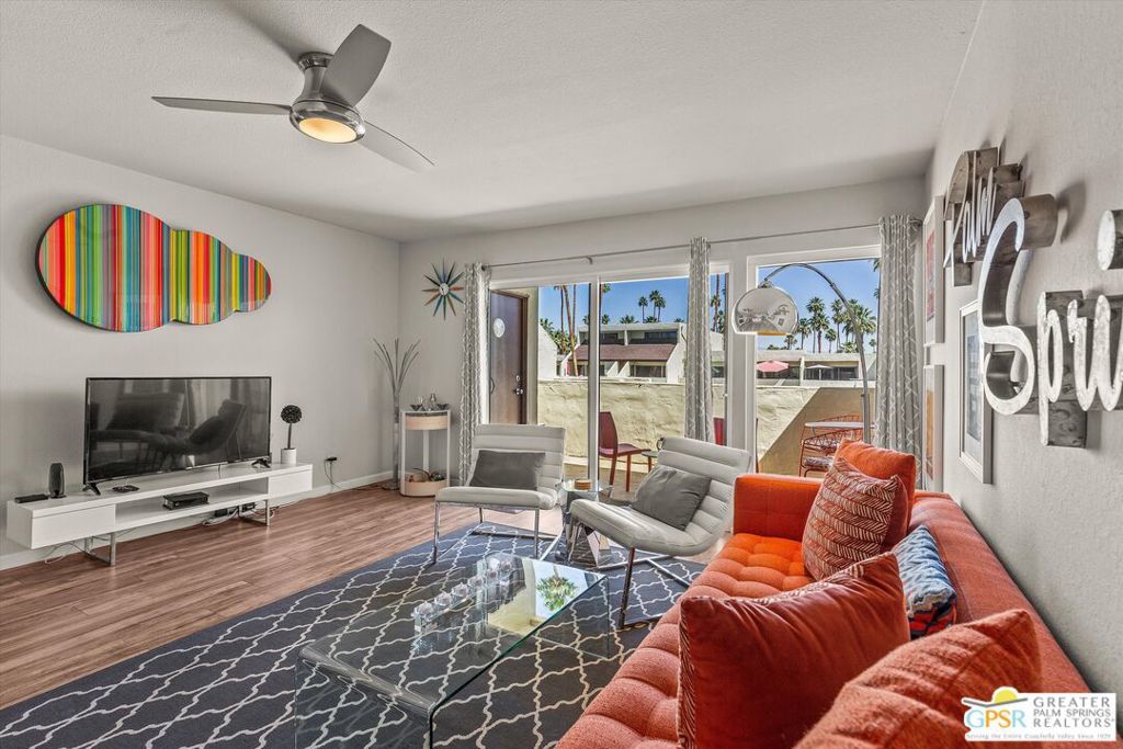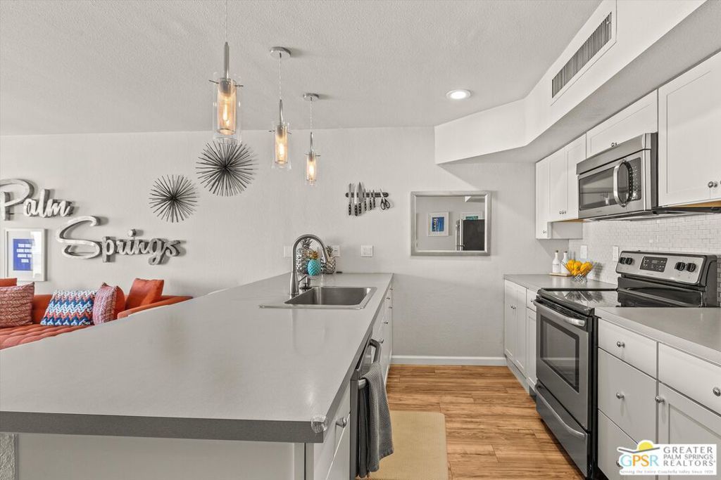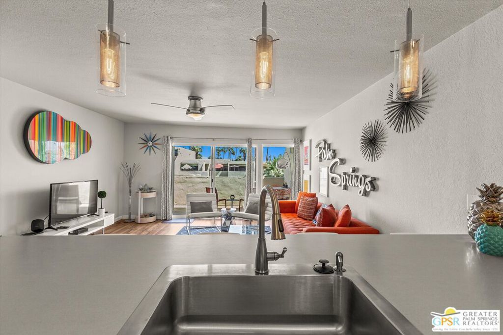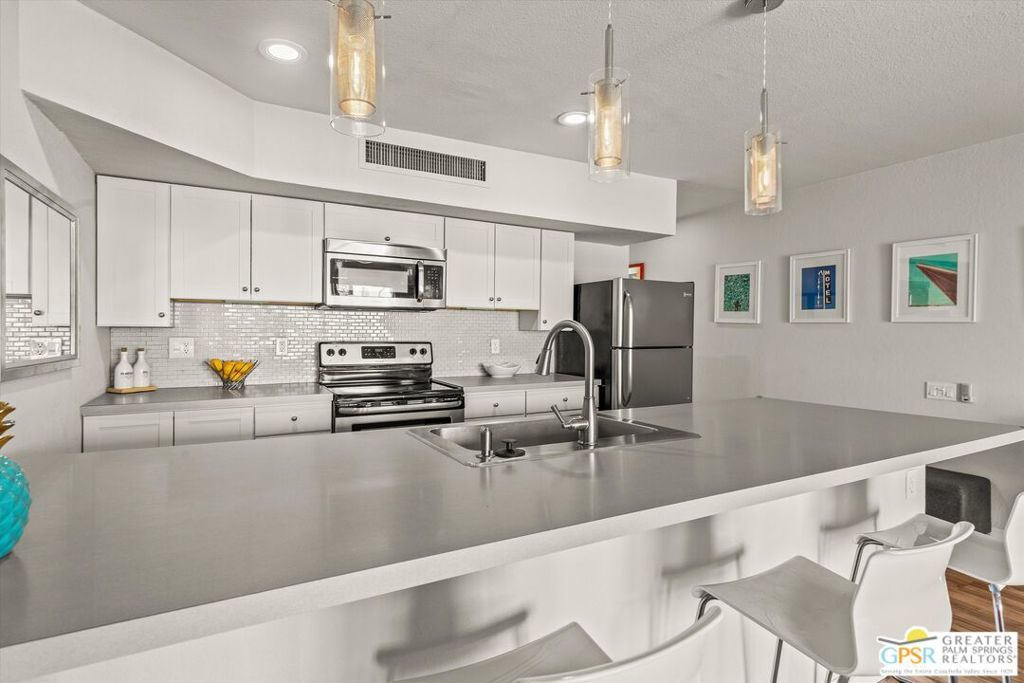 Live the carefree and fashionable Palm Springs lifestyle at this furnished turnkey condo with gorgeous mountain, pool and park views. Offering an outstanding location in the resort community of Smoke Tree Racquet Club, the single-level design was reimagined down to the studs in 2017 and now features on-trend upgrades throughout approximately 775 square feet. Entertain, relax and dine in an open living and dining area that flows to a private and sunny balcony overlooking the resort's central park and enormous swimming pool one of the largest in Palm Springs. A remodeled open-concept kitchen features white cabinetry, a peninsula breakfast bar, full tile backsplash, a trio of contemporary pendant lights, and stainless steel appliances. Custom tile shines in the bath and complements an upgraded vanity and circular mirror, while the bedroom is spacious and private. Wood-look plank flooring, custom paint and window treatments, and contemporary furnishings lend timeless style throughout. Designed by visionary Palm Springs architect Hugh Kaptur, Smoke Tree Racquet Club is home to lighted tennis and pickleball courts, lush landscaping and a dog park. Smoke Tree Village is right across the street and features shops, restaurants, Ace Hardware and Ralphs Fresh Fare Supermarket. Downtown Palm Springs is moments away, miles of hiking trails are nearby, and Palm Springs International Airport makes it easy to enjoy this turnkey condo as a vacation getaway or a full-time residence.