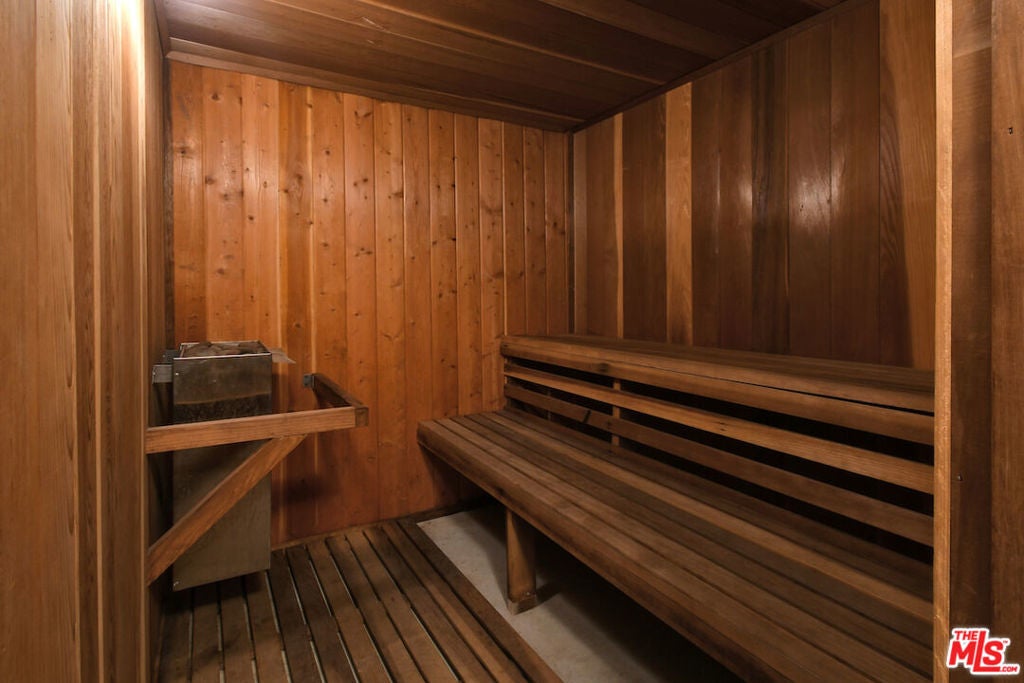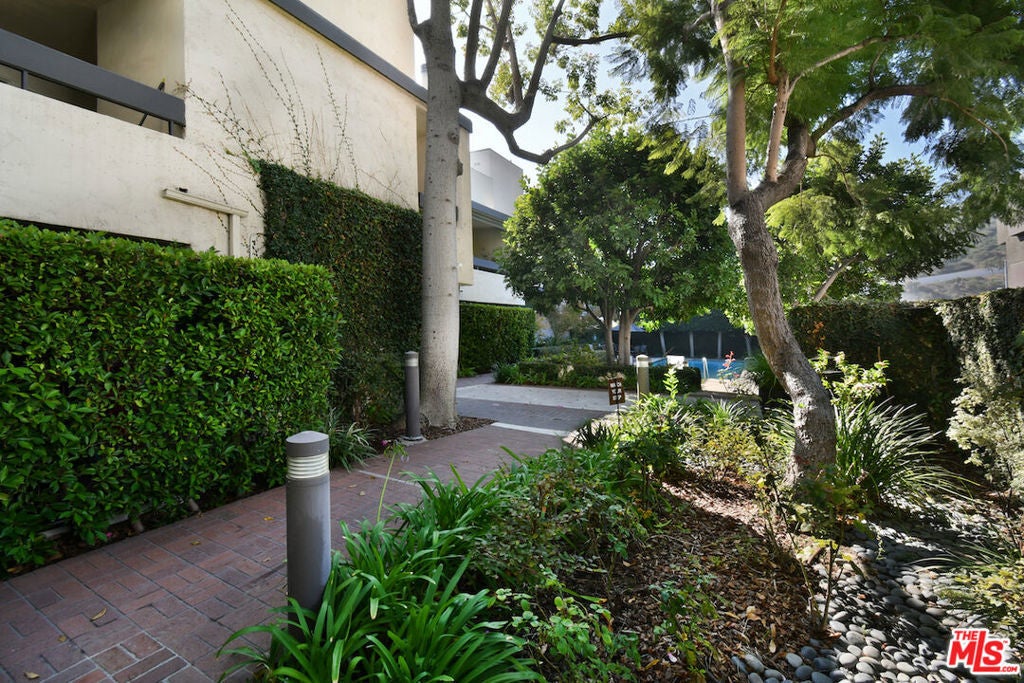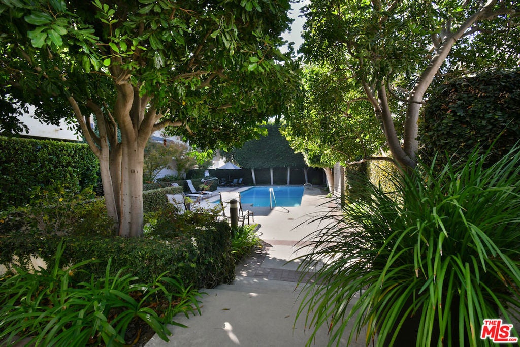 Welcome to Bel Air Courtside Condominiums, an exclusive 16-unit building surrounded by greenery and offering beautifully landscaped grounds, a swimming pool, and a rooftop tennis court. Private patio courtyard entry opens to the front porch and patio. From the courtyard, a glass front door leads into the inviting living space with multiple sitting areas, a mantled fireplace, hardwood floors, wet bar, and sliding glass doors to the front patio. The kitchen includes a breakfast area, glass front cabinets, pantry, and opens to the formal dining room. Thoughtful floor plan to enjoy everyday living or entertaining guests. There are two en-suite bedrooms, including the primary bedroom with a walk-in closet and spacious bathroom featuring double sinks, a large soaking tub, and separate shower. Both bedrooms have glass doors that open to a large backyard patio and garden with a fountain. Additional features include great storage space and extra closets throughout, indoor washer and dryer area, and a guest half bathroom. Elevator or stairs lead to side-by-side parking spots with a personal EV charger. A unique place to call home in a great Bel Air/Brentwood location near the Getty Museum. Easy access to everything!