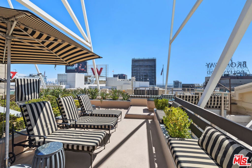 Furnished and loft-style, this vibrant 1BD/1BA home in the historic Lofts at Hollywood & Vine offers open-concept living with French windows framing dazzling views of Vine Street and the Hollywood skyline. A spacious private bedroom includes an en-suite bath with double-faucet trough sink, large walk-in shower, and separate water closet, while the sleek European kitchen features high-end Viking appliances. Modern decor - including a convertible West Elm sectional sofa - and the privacy of an end unit with only one shared wall enhance the sense of space and comfort. The building provides a 24-hour doorman, a stunning rooftop deck with panoramic city views, and a community BBQ area, all in an unbeatable location across from the Hollywood & Vine Metro, next to the Pantages Theatre, and moments from Trader Joe's and Equinox. A turnkey opportunity offering stylish urban living in one of Hollywood's most iconic buildings.