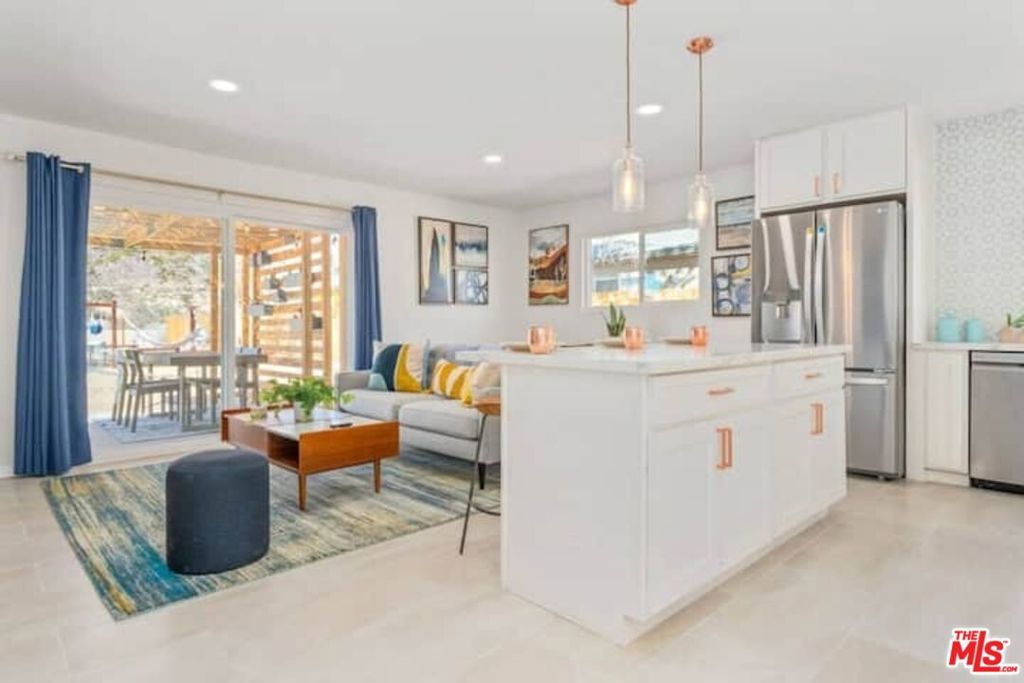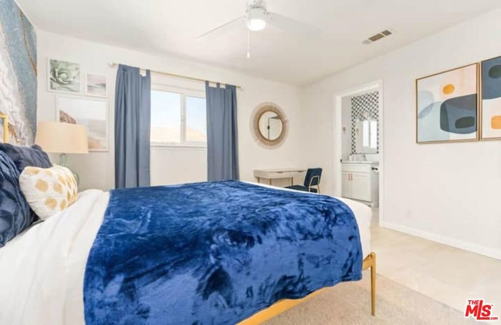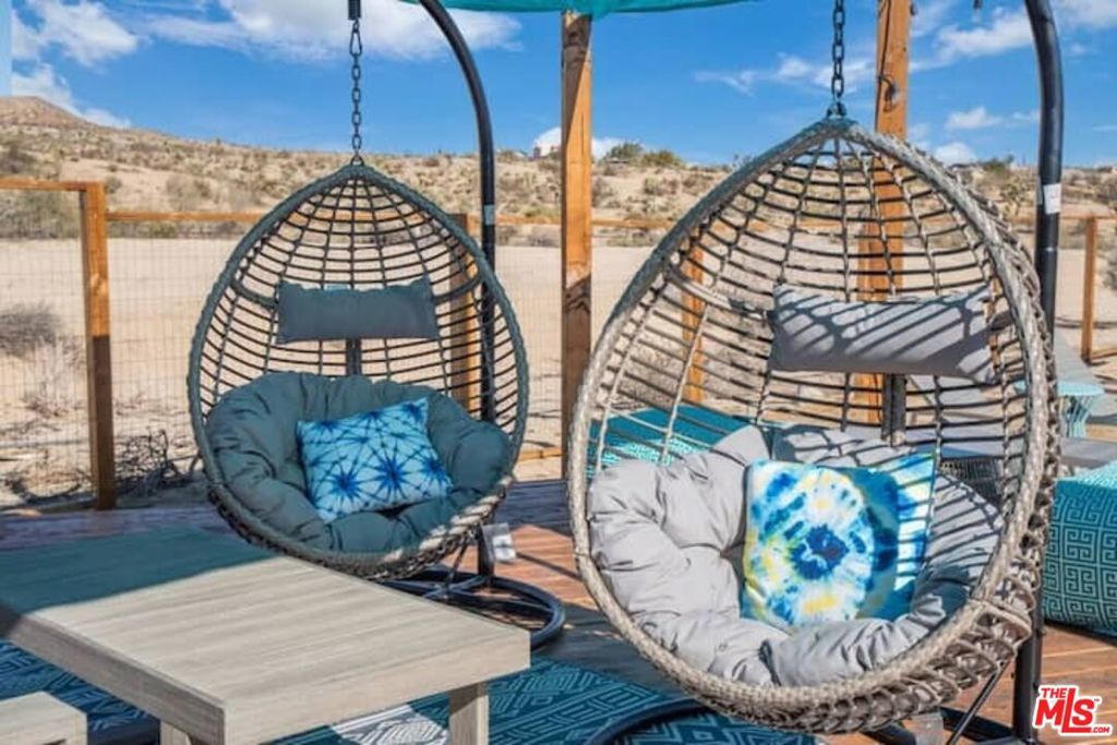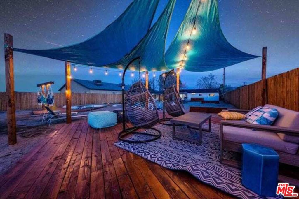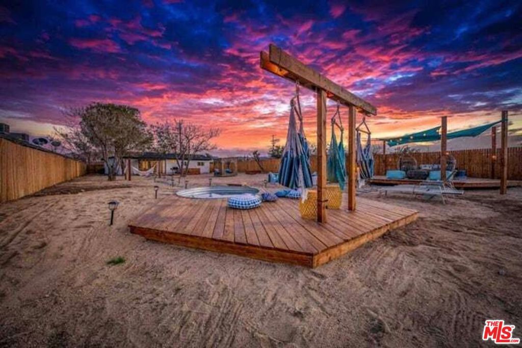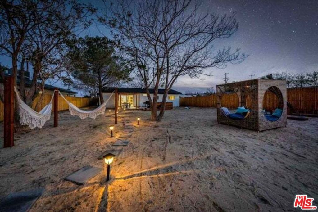 Welcome to Dusty Dunes, a thoughtfully designed desert sanctuary that perfectly blends modern comfort, high-end style, and the serene natural beauty of Yucca Valley. Tucked away on a fully fenced lot with sweeping mountain views, this beautifully upgraded home features three spacious bedrooms, two bathrooms, and an exceptional garage-converted game room with skee-ball, air hockey, shuffleboard, and a striking star-lit skylight that creates a truly immersive entertainment experience. Inside, the home offers a bright open layout with curated design elements, central heating and cooling, high-speed internet, and a 55" 4K smart TV, while the chef-inspired kitchen boasts premium Cafe appliances and all the essentials for elevated living. Outdoors, the property transforms into a private resort-like retreat with multiple lounging areas, hammocks, swings, a shaded dining patio, horseshoes, a fire pit for stargazing, an outdoor daybed, and a relaxing hot tub perfectly positioned to take in the mountain vistas. With easy paved-road access, ample parking, and a convenient location just minutes from town and a short drive to Joshua Tree National Park, the home strikes the ideal balance between seclusion and accessibility. As a proven high-performing short-term rental grossing over $65,000 annually, this home offers exceptional potential as a full-time residence, vacation getaway, or income-producing investment property - delivering a complete lifestyle experience that captures the magic of the high desert.