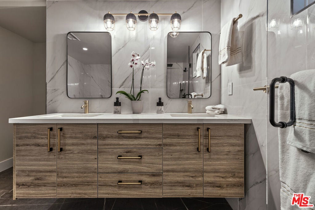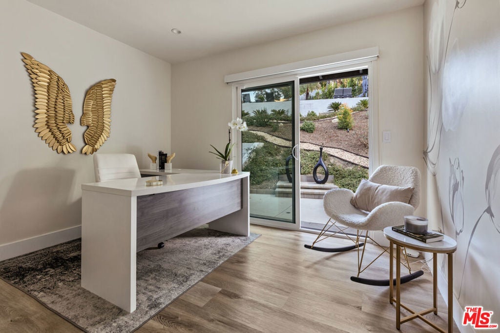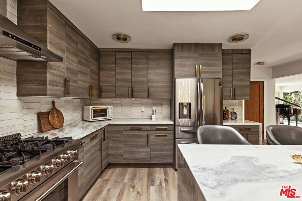 This exceptional single-story mid-century modern home in Woodland Hills sits on over half an acre along coveted Natoma Ave., where the street meets scenic hiking trails and the elevated setting provides privacy along with sweeping views of the hills and valley. Inside, double doors open to sun-filled spaces enhanced by expansive windows and skylights, leading to an open-concept living area designed for both style and comfort. The chef's kitchen features high-end appliances, a generous waterfall island, and refined finishes, flowing seamlessly into the living and dining areas anchored by a custom wine bar. The spacious primary suite offers a peaceful retreat with a walk-in closet and spa-like bath, while three versatile secondary bedrooms capture natural light and beautiful views. Outside, the resort-like backyard becomes an unforgettable highlight, complete with a sparkling pool, cascading waterfalls, ample lounging and gathering zones, multiple vantage points, a fire pit, bocce court, and lush landscaping is an ideal setting for effortless indoor-outdoor living and memorable entertaining.