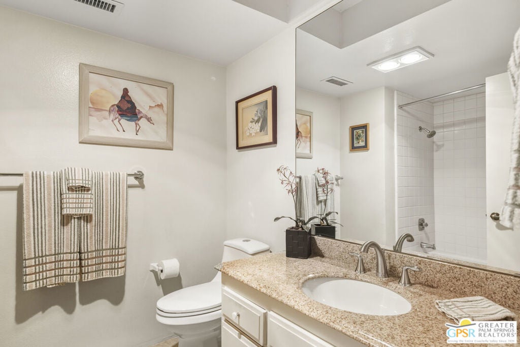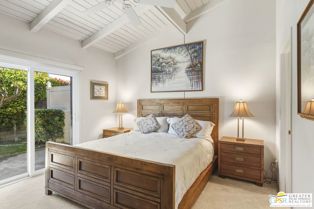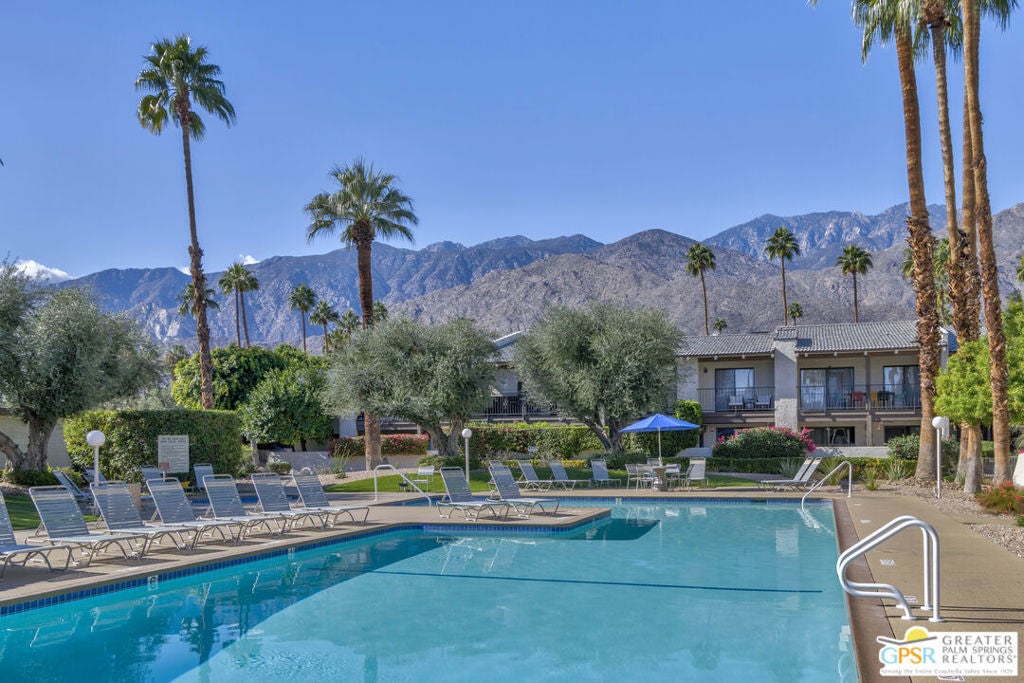 This sought-after single-story condo is located in one of the few Palm Springs gated developments on FEE LAND you OWN. Rancho La Paz is located within minutes of several popular destinations including Koffi, The Ace, Purple Room, The Saguaro, Mr. Lyons and public golf. This TURNKEY FURNISHED 2-bedroom, 2-bath unit offers 1,174 sq. ft. of cozy comfort. The condo itself is a single-story villa unit with no one above you. It features vaulted wood ceilings in the Living/Dining Area and Primary Bedroom creating and open and airy environment. The kitchen has been updated with granite counters and newer appliances and has a convenient laundry closet. Both bedrooms offer en-suite bathrooms and the Primary Bedroom is enhanced with a large walk-in closet. There is a partially covered private patio accessible from both the Living/Dining Area and Primary bedroom with a grassy area perfect for a pet. All the original glass windows and doors have been replaced with energy efficient ones. There is assigned carport parking for one vehicle. Rancho La Paz amenities include three sparkling pools and spas, tennis and pickle ball courts and a dog run. Rentals are allowed with a 30 day minimum.