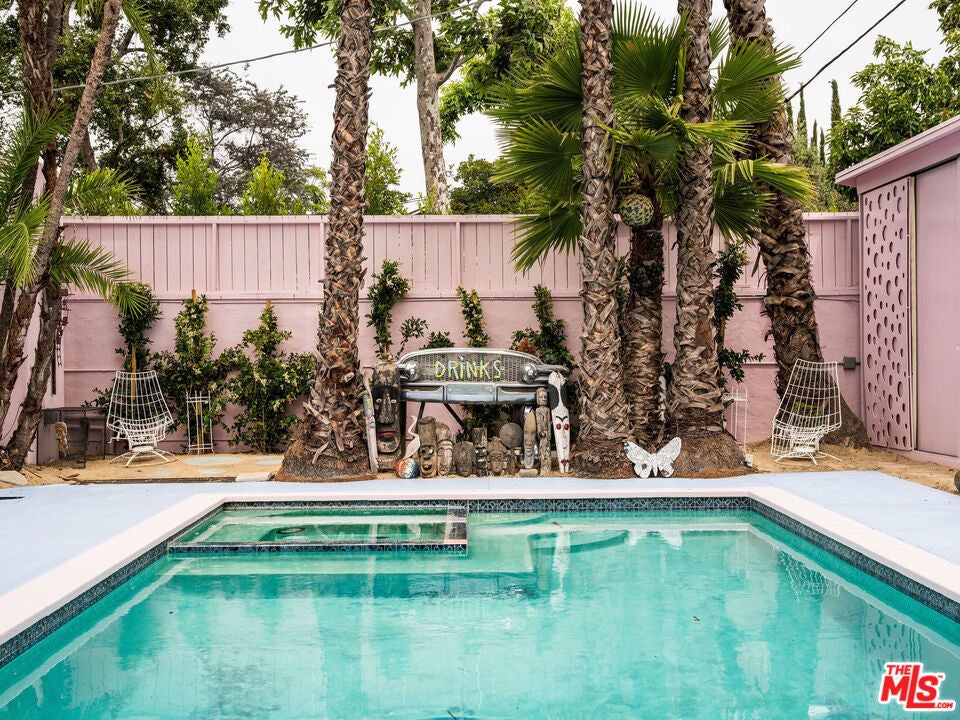 Presenting an excellent opportunity for the modern collector, Hollywood history buff, or developer/builder/end-user: An original portfolio piece by American architect William Kesling, known for designing a historic collection of homes in the Streamline Moderne style (a subtype of Art Deco aptly dubbed "ocean liner" style by the French) throughout Los Angeles. Given its close proximity to studios, there's no surprise that it was originally used as a party haven for Hollywood's tastemakers, but that was just the beginning. In 1980, this iconic residence was purchased by two-time Grammy-winning, Emmy- and Tony-nominated songwriter and art director Allee Willis, and the rest is nothing short of music history. Willis gave the architectural diamond its baby pink hue, but otherwise preserved its original identity while performing a complete restoration. Here, the former Motown Records dreamer would host lavish gatherings and themed jamborees which quickly became notorious throughout Hollywood's social circles, her exclusive guest list including the likes of Cher and Joni Mitchell. The home would also serve as the birthplace of her vast body of work, resulting in a long list of smash-hit songs such as "September" and "Boogie Wonderland" by Earth, Wind & Fire, "Neutron Dance" by The Pointer Sisters, and "I'll Be There for You," the indelible theme song of NBC's hit television show Friends. Over the years, she welcomed legendary recording artists and collaborators to the on-site state-of-the-art music studio (James Brown, Bob Dylan, and Cyndi Lauper are just a few). With an insatiable desire to create, she also sculpted and painted numerous art pieces. Willis was also an avid collector, adorning her home with countless pop culture treasures from the 1950s, '60s, '70s, and '80s. Of her penchant for throwing parties, Willis notably once said in an interview, "I always had a music career, an art career, set designer, film and video, technology. The parties really became the only place I could combine everything." Her storied festivities have been covered in publications as diverse as People, Life, The New York Times, The Wall Street Journal, and Rolling Stone. Beneath towering palms, the '50s-inspired grounds feature a bowling-ball garden, private sand beach, and newly built poolside shower for the modern reveler.