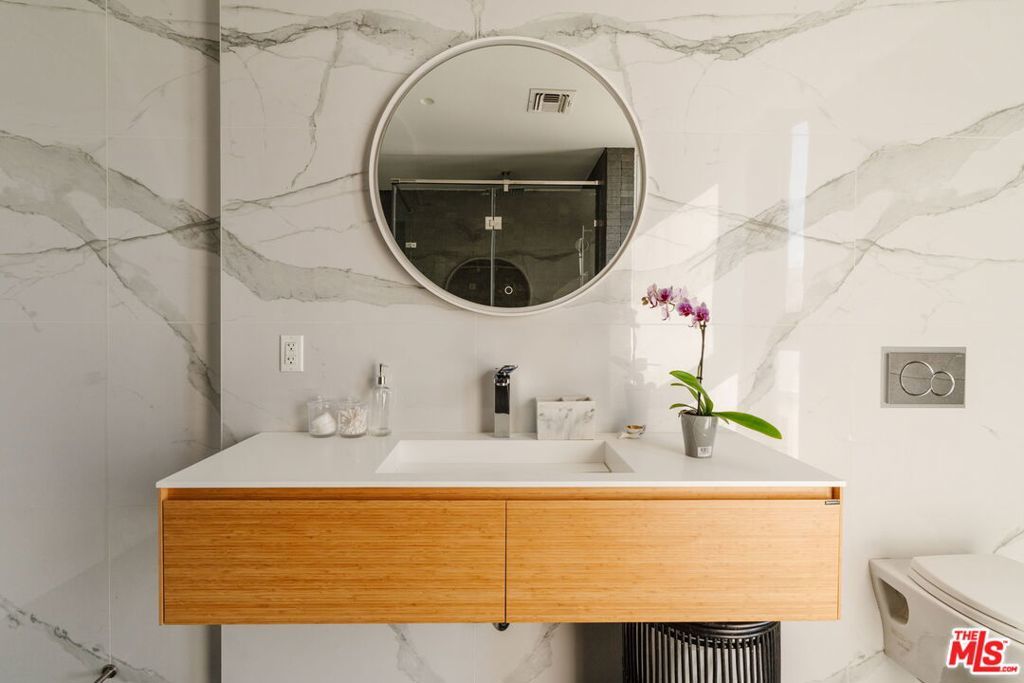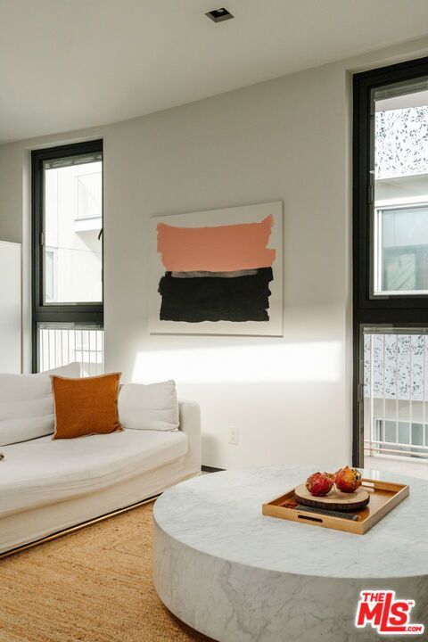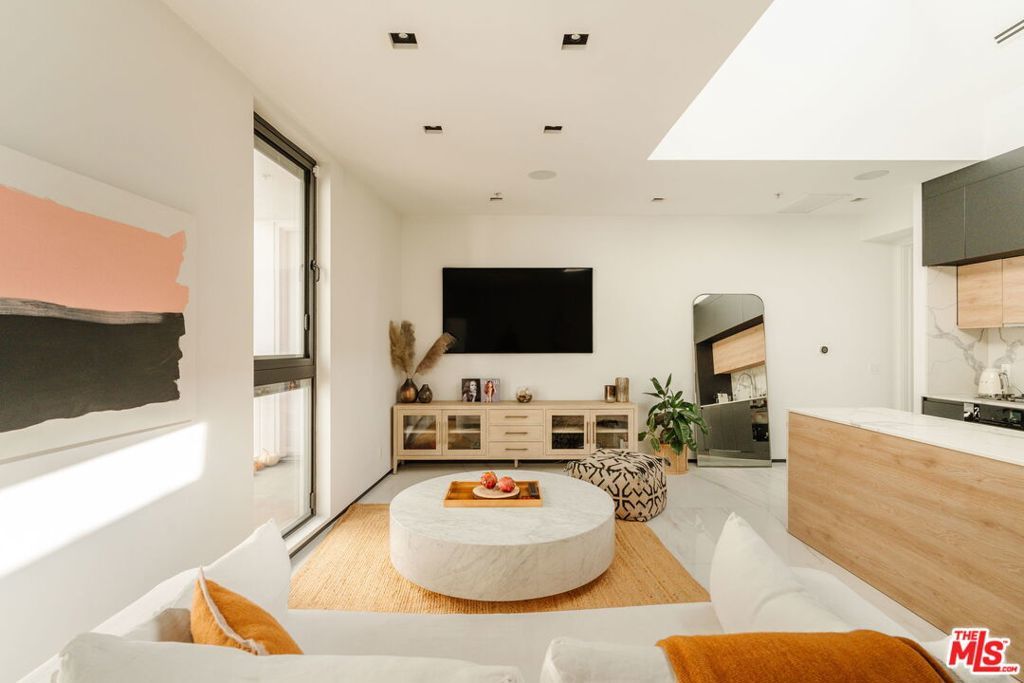 Designed by Lorcan O'Hearlihy Architects, this boutique penthouse is part of an eight-residence collection in one of Los Angeles' most iconic neighborhoods. Completed in 2019, the home pairs minimalist design with a palette of large-format Italian tile and European white oak, while a private rooftop terrace provides a rare vantage overlooking the city. Anchored by a striking double-height skylight, the primary living space is drenched in natural light from above. The open kitchen grounds the residence in a sleek, modern aesthetic with matte black European cabinetry, a waterfall-edge island, and a suite of fully integrated Miele appliances. Throughout the home, trimless recessed lighting is subtly embedded within the nine-foot ceilings, maintaining a clean, uninterrupted profile. Triple-glazed, floor-to-ceiling windows with integrated Venetian blinds line the living room, offering a streamlined finish and premium thermoacoustic performance. In the bedroom, European white oak floors complement a custom-grade wardrobe-style closet set behind white glass sliding doors. The dual-access bath is enveloped in matte black Italian porcelain, featuring a floating Corian-topped vanity, an expansive frameless glass shower, and en suite laundry. A 600 square-foot private rooftop terrace extends the home upward, offering sweeping, unobstructed views over West Hollywood. With a south-facing exposure, it is bathed in sunlight from morning to evening and perfectly positioned for spectacular sunsets. Moments from the Sunset Strip and Melrose Place, the residence sits near many of the city's most celebrated restaurants, shops and design destinations. Sunset Tower, Connie and Ted's, Ggiata, and Chateau Marmont are all close by, while the three-Michelin-starred Somni brings one of the country's most acclaimed dining experiences within easy reach. Barry's offers a premier fitness studio in the neighborhood, and both Gelson's and Whole Foods provide everyday essentials just minutes away. This is a rare opportunity to own a stunning luxury penthouse with a large private outdoor space in one of West Hollywood's most desirable locations.