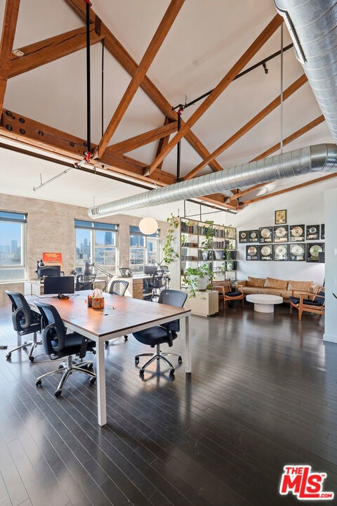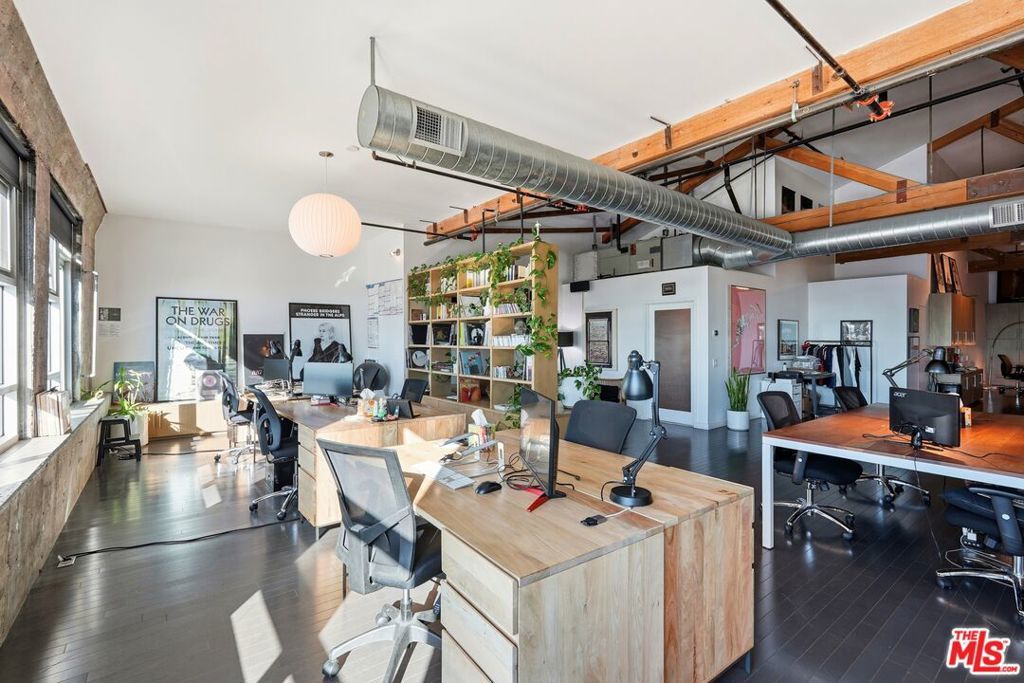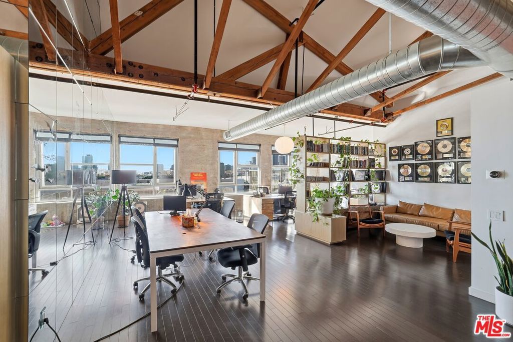 Rare Penthouse live/work loft at Barker Block in the Arts District with stunning DTLA views. With 16 ft high windows with unobstructed city views, this unit provides an unparalleled living experience and could also be utilized as a unique work space. Custom built-in cabinets & bookshelves, hardwood floors throughout, a unique mirrored wall, century-old wood posts & beams and heavy timber ceilings reaching approx 21 ft. The central piece of this space is the open gourmet kitchen w/ SS appliances & Caesarstone countertops, large pantry, and comes with plenty of storage. There are also 2 large bathrooms, one with a built-in washer/ dryer unit. Since this space is a L-shaped floor plan, many lay-outs are possible. Adding a mezzanine is one of those possibilities as well and could create additional live/work space.The building features 24/7 security and front desk, free common area wifi, outdoor lounge with firepit, a stunning resort-style rooftop heated pool with spa and BBQ areas. The fitness center can also be found on the rooftop and provides a working out experience with the best DTLA views! The unit comes with 2 covered parking spaces conveniently located on the fifth floor as well as a storage unit. Lastly the location provides one of the (if not the) best experiences of living in the Arts District. Across from Urth Caffe, the Arts District Park & the LA Cleantech Incubator. It is a short distance to SCIArc, Little Tokyo, Goldline, DASH bus, Zinc Cafe, Urban Radish, Verve cafe, the local dog park and more. Close to public transit and freeways. It's the best of two worlds colliding in a very stylish penthouse unit. Come see for yourself.