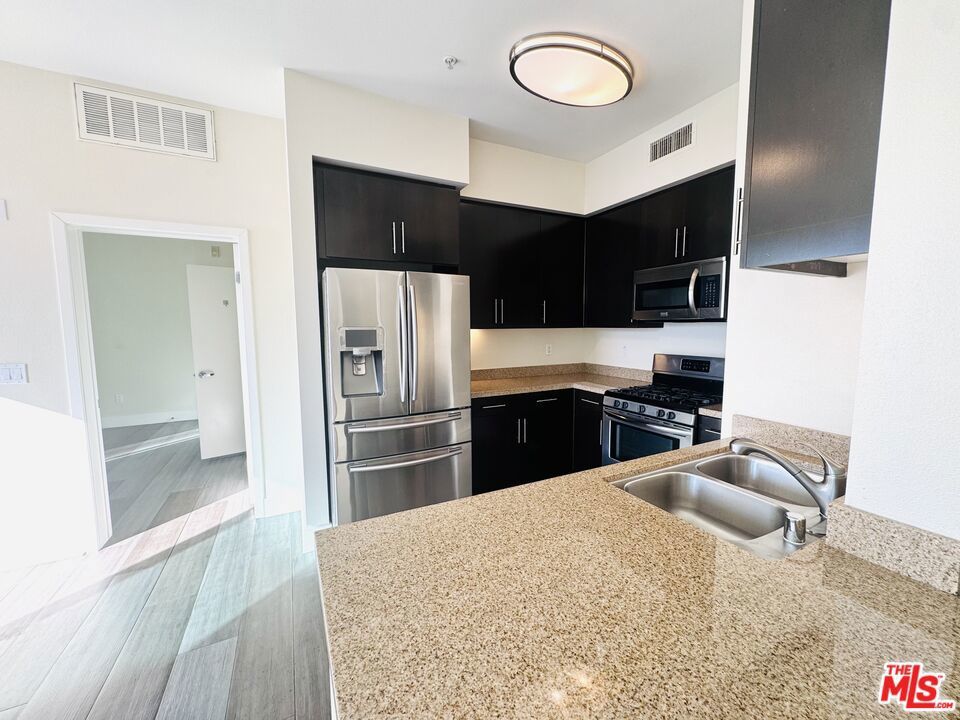 Incredible location at the beach! Beautiful modern top floor 2 bedroom, 2 bath unit in the heart of Santa Monica surrounded by shops and restaurants. Apartment features large balcony overlooking sunny courtyard with floor to ceiling glass doors, open floor plan hard surface flooring, and remodeled kitchen and baths. Kitchen features stainless steel appliances and breakfast bar. Primary bathroom with separate shower and huge soaking tub. Guest suite has pocket door to create the privacy. Central Air and heat. Laundry in unit. Gated underground parking included. Cola Pasta on ground floor of building for convenient access to handmade Italian pasta, coffee, beer wine and casual dining. Only 5 blocks to Ocean Avenue! Walk to The Fairmont, 3rd St. Promenade, Santa Monica Pier, and Arc Light theaters. High end shopping including Tiffany, Louis Vuitton, Bloomingdales and more located just a short walk away at Santa Monica Place! Photos may be of a similar unit.