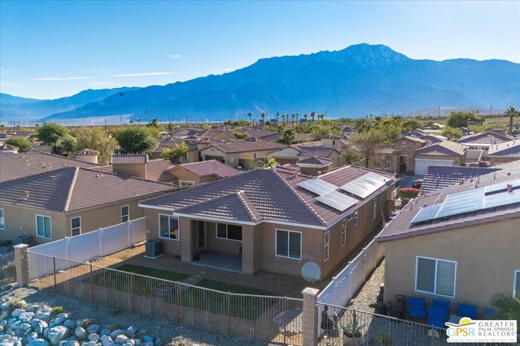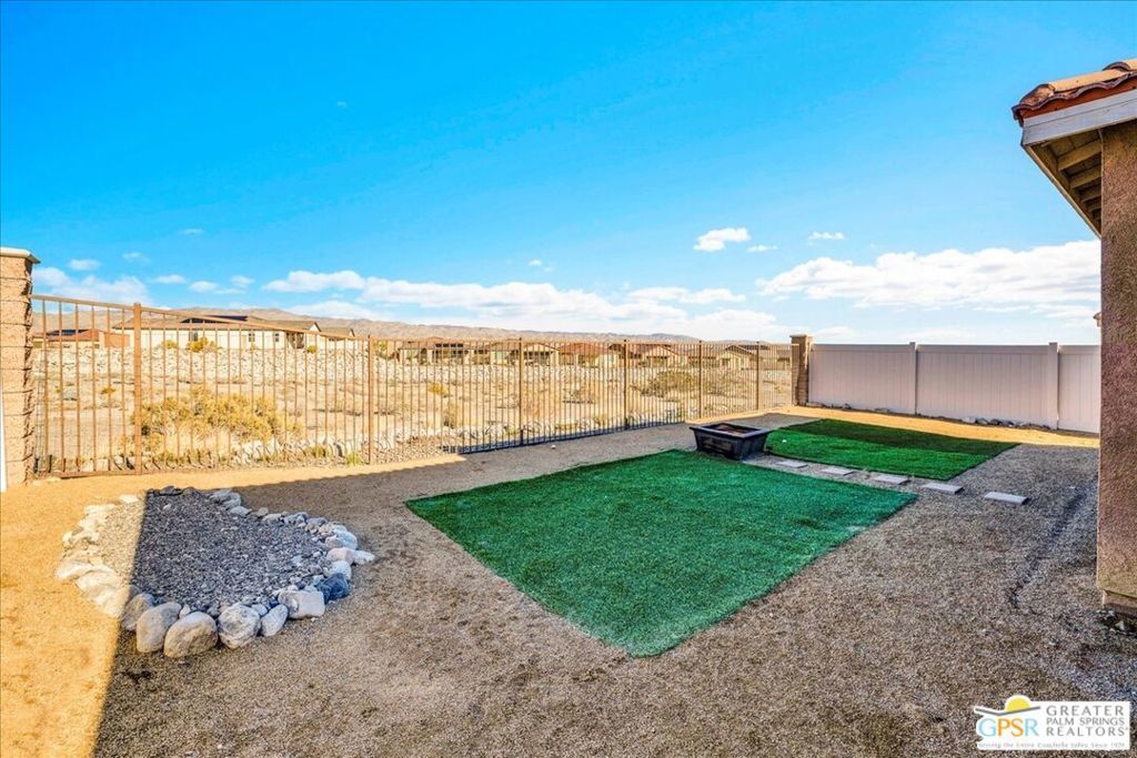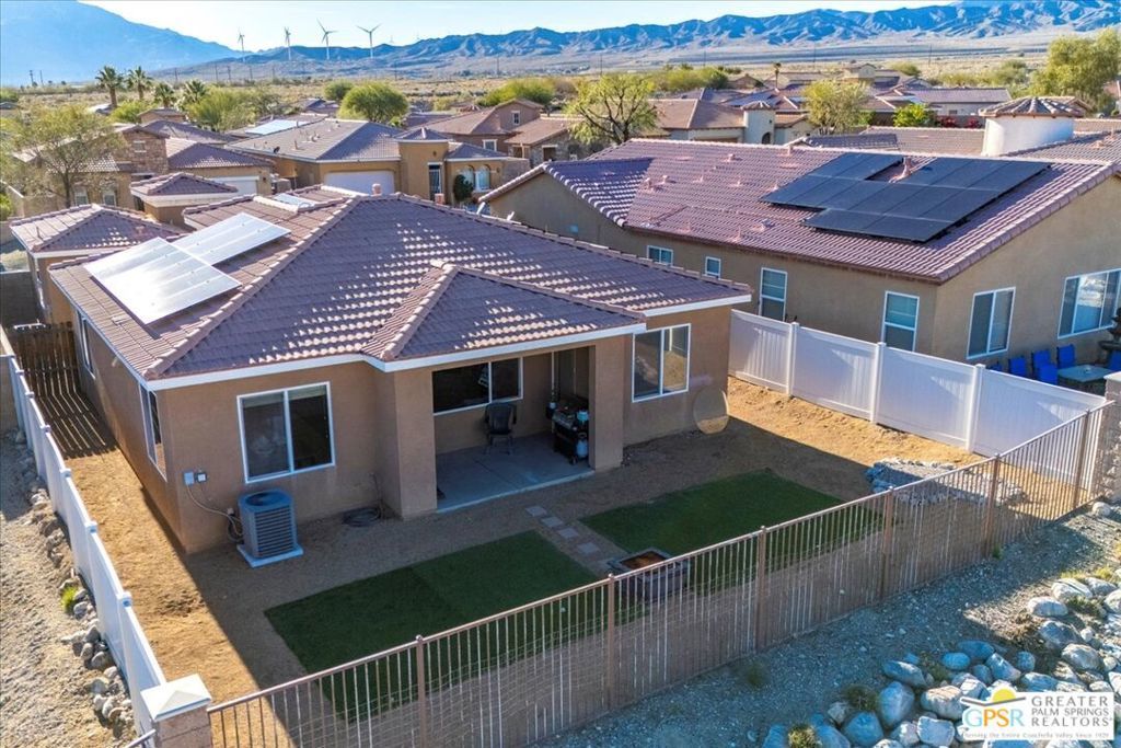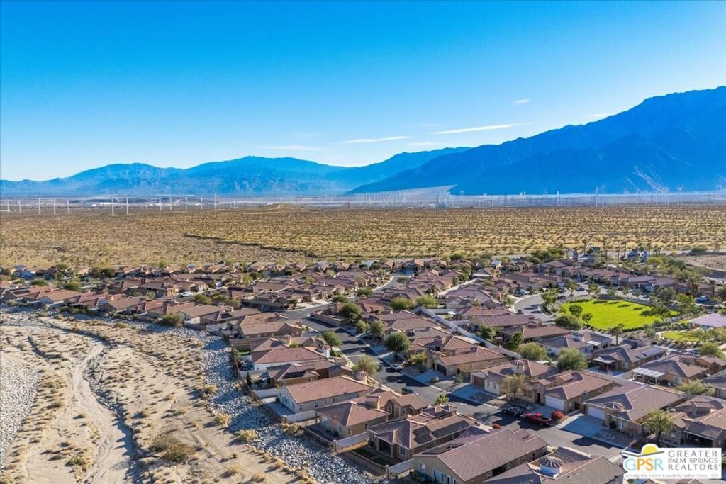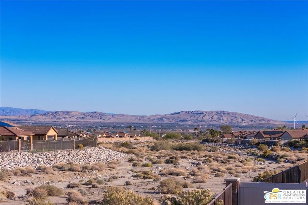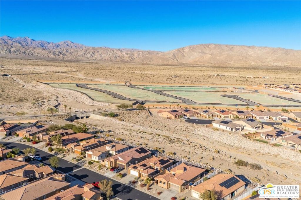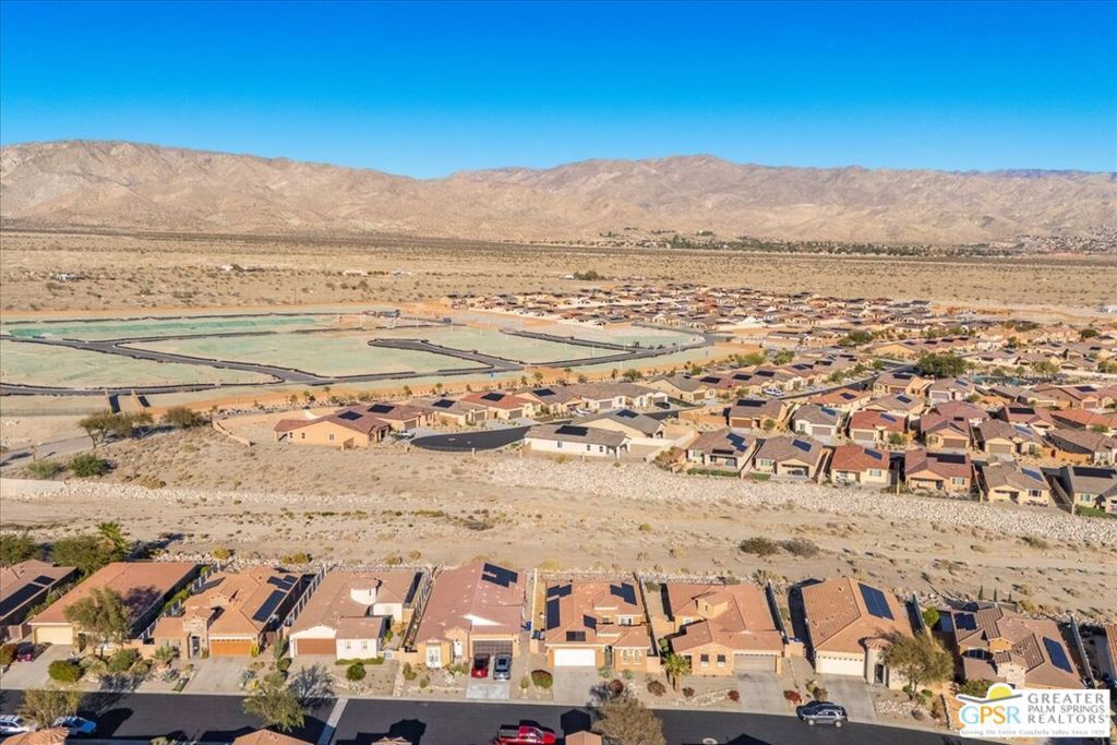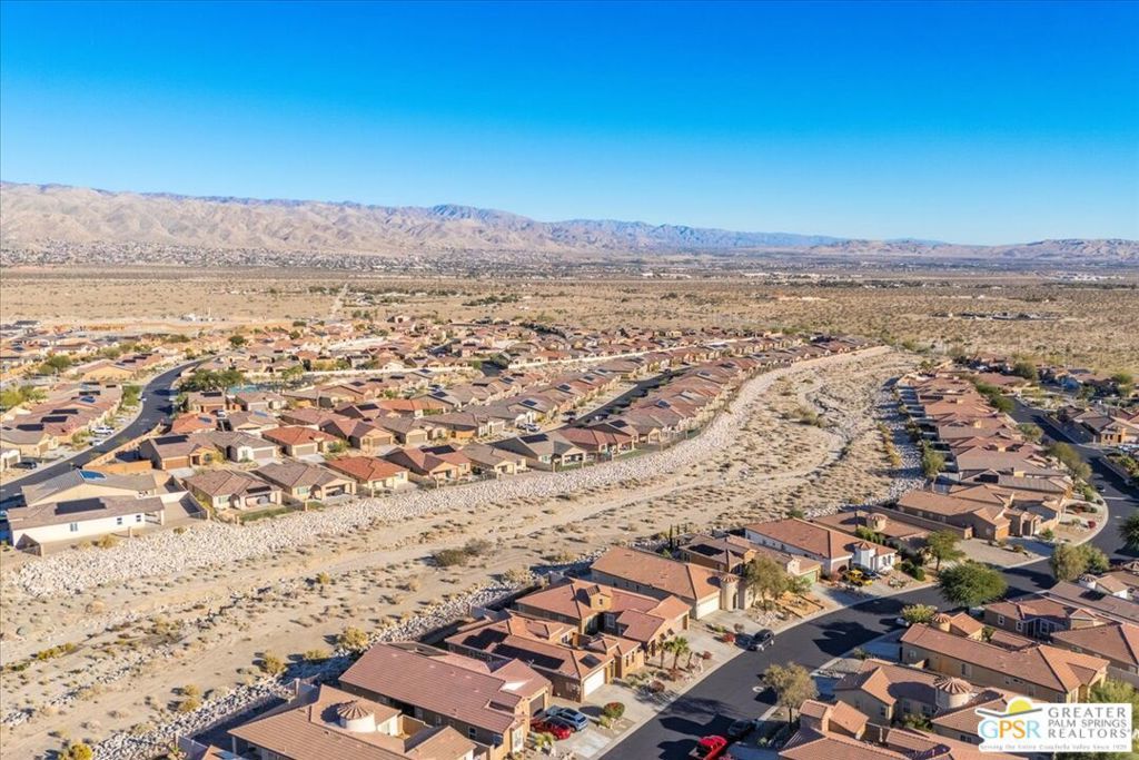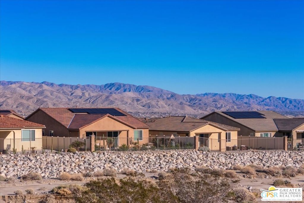 Skyborne is one of the fastest growing communities in Desert Hot Springs, and once you visit you will see why! This is a family-friendly gated community with low HOAs and beautiful common areas. This community offers a mix of part-time and full-time residents who enjoy the peaceful serenity you get once inside the gates, as well as the clubhouse and resort-style pool and spa. This home has 3 bedrooms plus a den, and one of the bedrooms is a detached casita, giving your guests the ultimate privacy when they visit. If you work from home, the casita is also a way to get some quiet and privacy for your home office, and a separation from the main house. There is also a dedicated den in addition to the 3 bedrooms, offering a great spot for a media room or a home office. The living room and kitchen offer a wonderful large space to entertain, with plenty of counter and cabinet space. Outside you have two separate areas - a protected front courtyard that is private and shielded from the afternoon sun or wind, and a backyard that opens up to the wash, allowing for beautiful views and distance from your neighbors. The north-facing layout of the backyard means you can leave your window coverings open all year, even during the hot summer months, and enjoy the natural light. This house also has solar already installed, so you can come enjoy the health and wellness the desert offers, while also harnessing the sunlight to power your home!