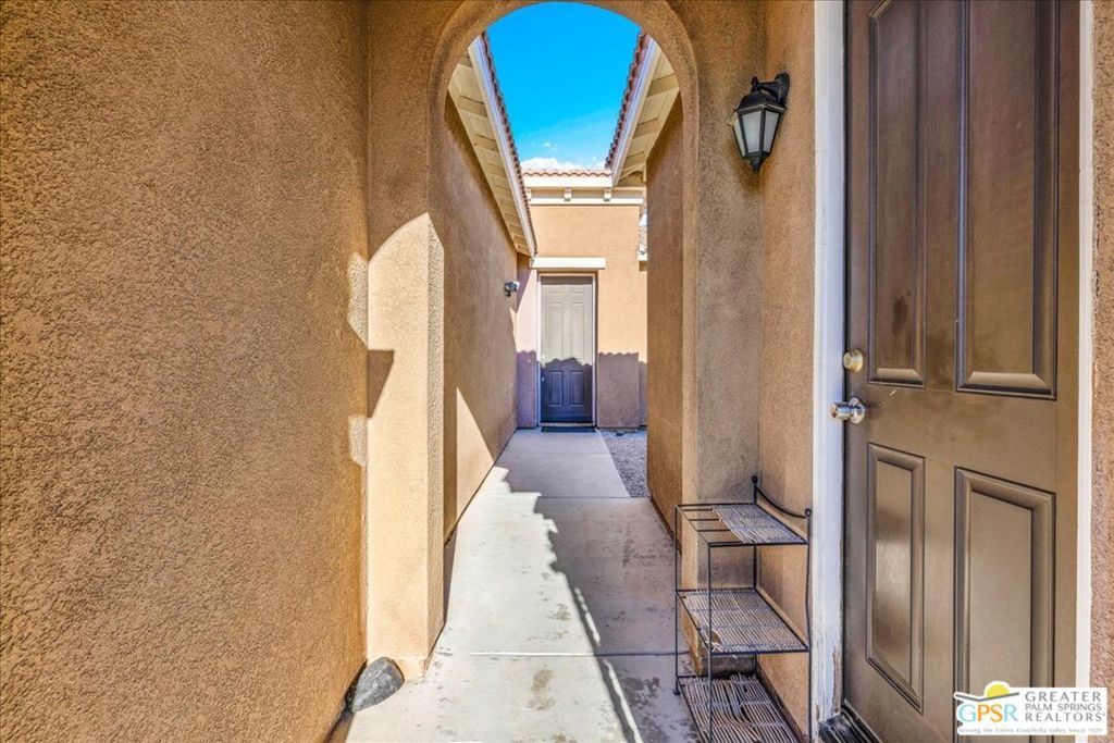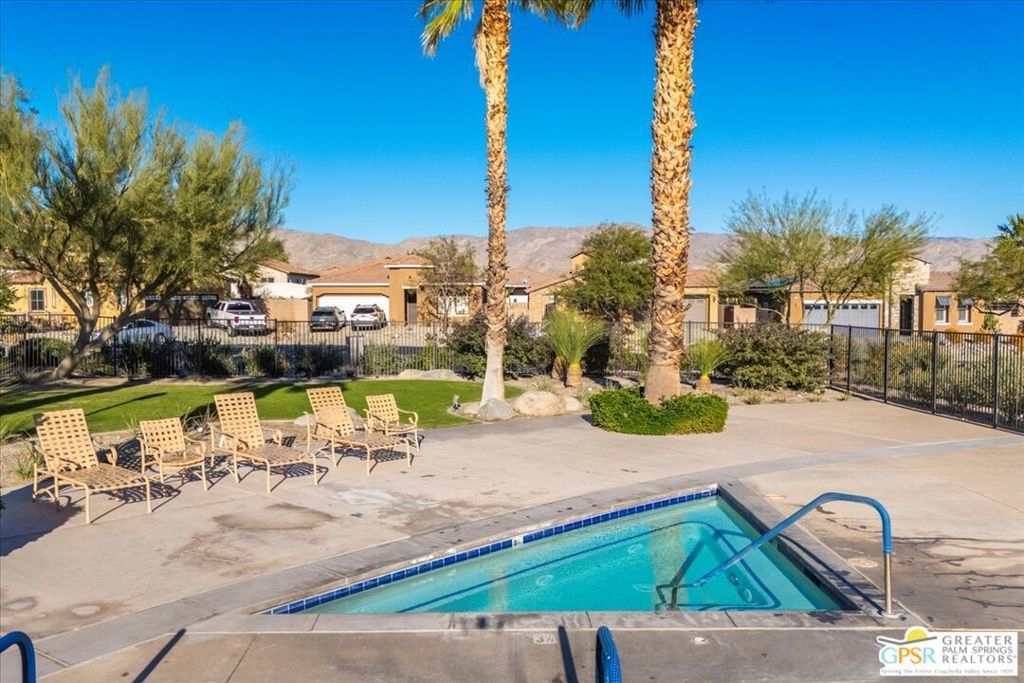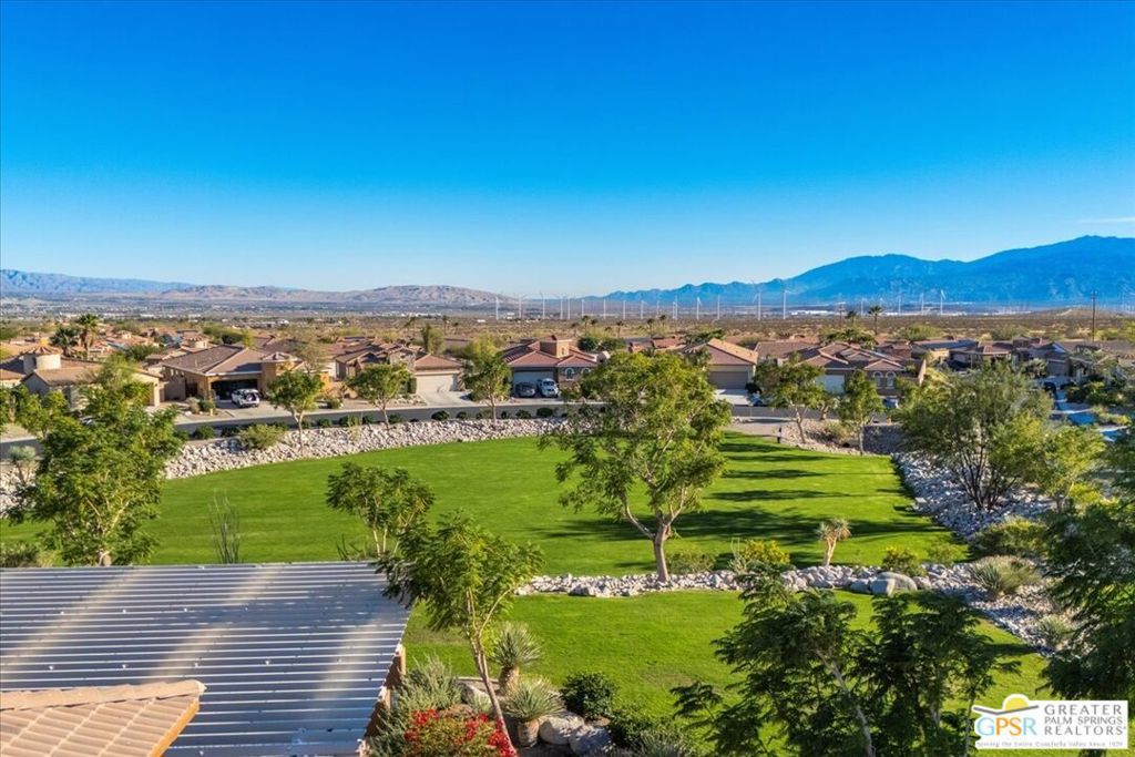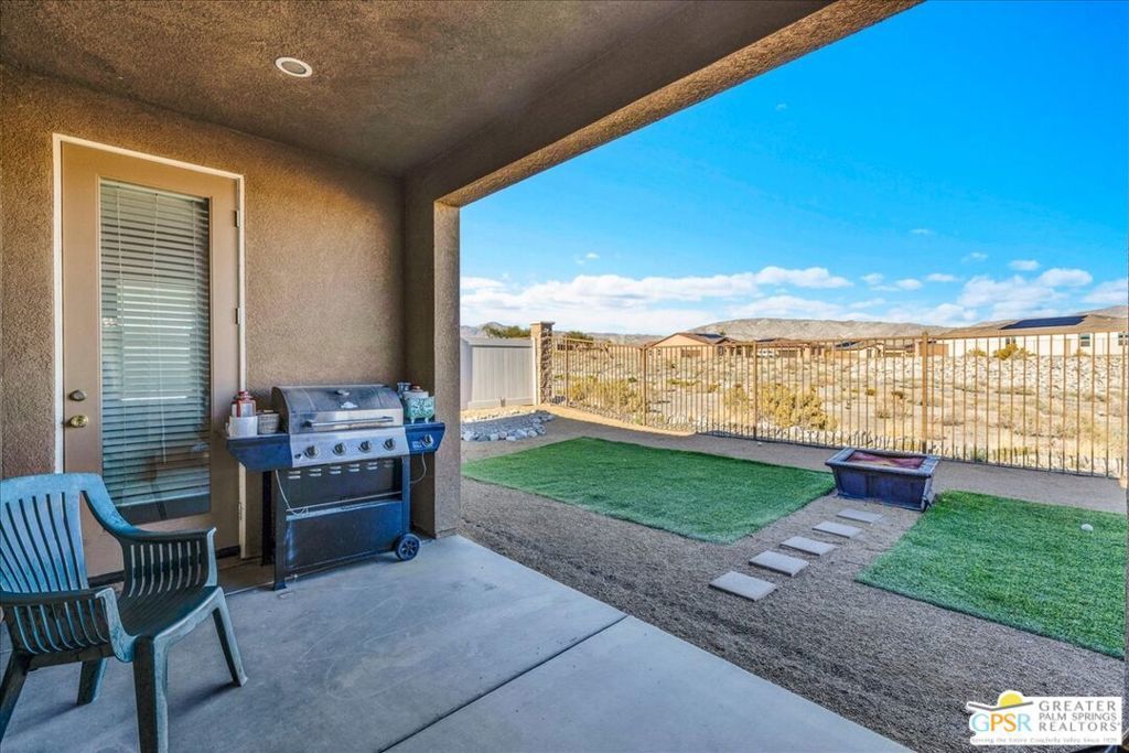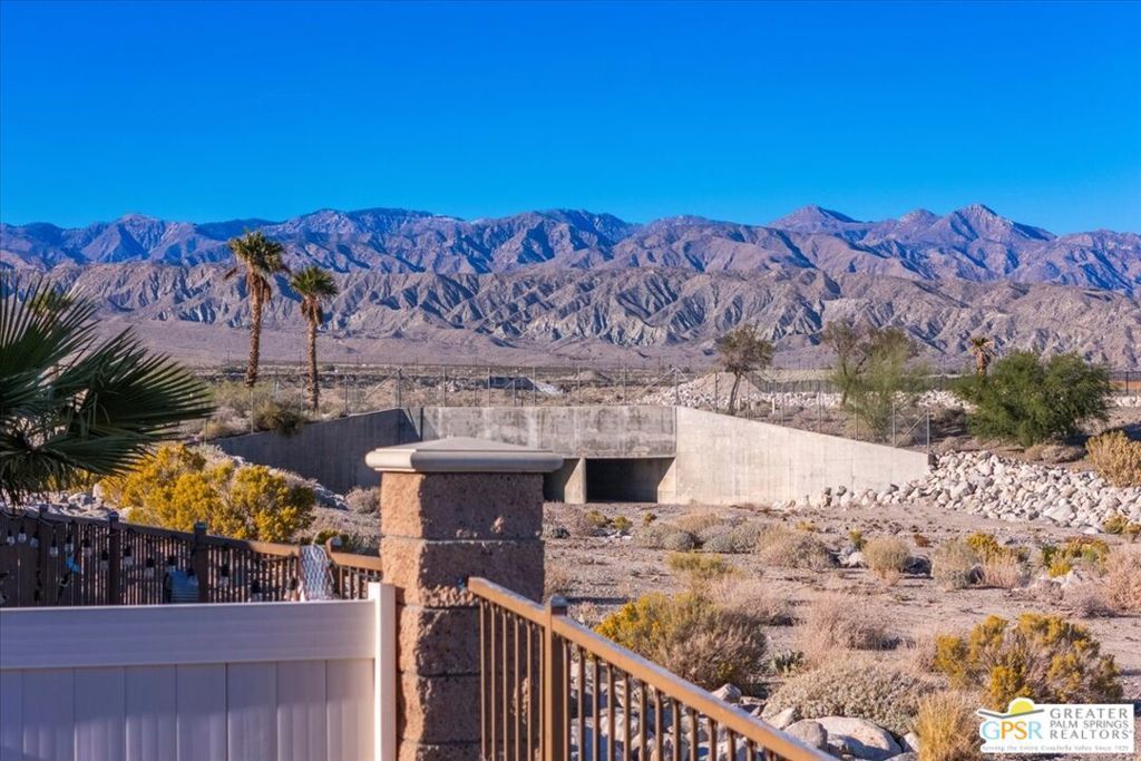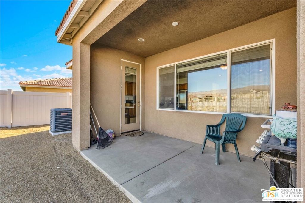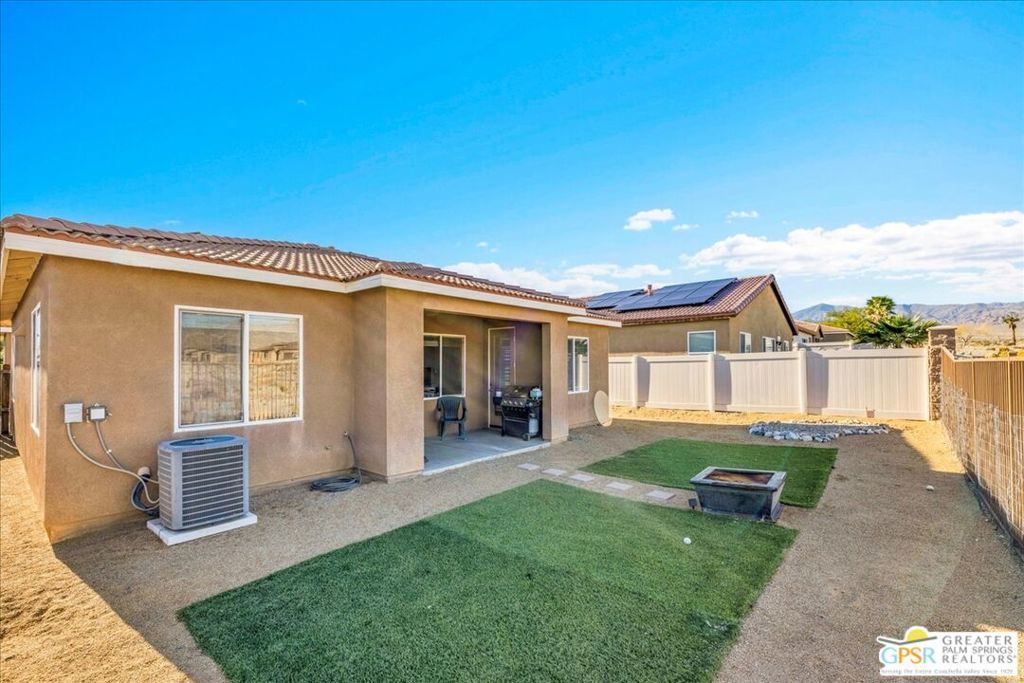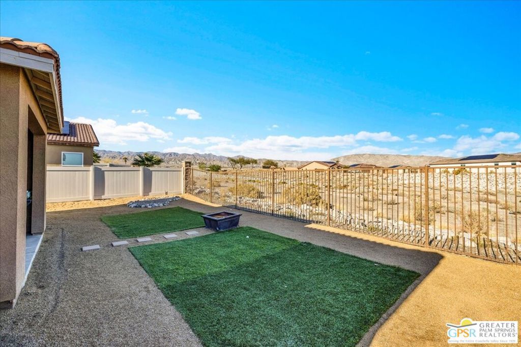 Skyborne is one of the fastest growing communities in Desert Hot Springs, and once you visit you will see why! This is a family-friendly gated community with low HOAs and beautiful common areas. This community offers a mix of part-time and full-time residents who enjoy the peaceful serenity you get once inside the gates, as well as the clubhouse and resort-style pool and spa. This home has 3 bedrooms plus a den, and one of the bedrooms is a detached casita, giving your guests the ultimate privacy when they visit. If you work from home, the casita is also a way to get some quiet and privacy for your home office, and a separation from the main house. There is also a dedicated den in addition to the 3 bedrooms, offering a great spot for a media room or a home office. The living room and kitchen offer a wonderful large space to entertain, with plenty of counter and cabinet space. Outside you have two separate areas - a protected front courtyard that is private and shielded from the afternoon sun or wind, and a backyard that opens up to the wash, allowing for beautiful views and distance from your neighbors. The north-facing layout of the backyard means you can leave your window coverings open all year, even during the hot summer months, and enjoy the natural light. This house also has solar already installed, so you can come enjoy the health and wellness the desert offers, while also harnessing the sunlight to power your home!