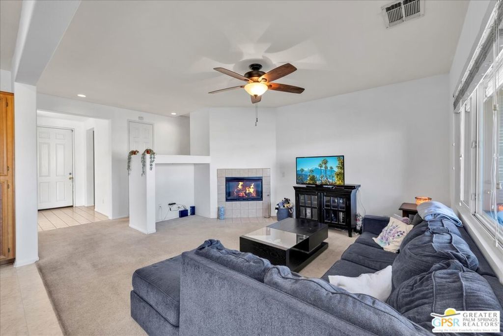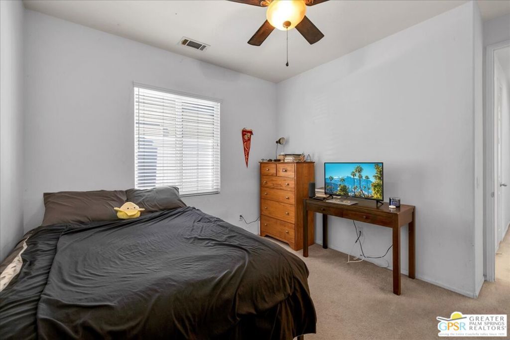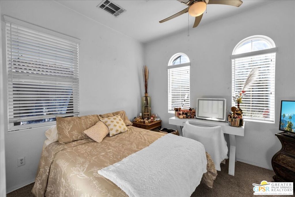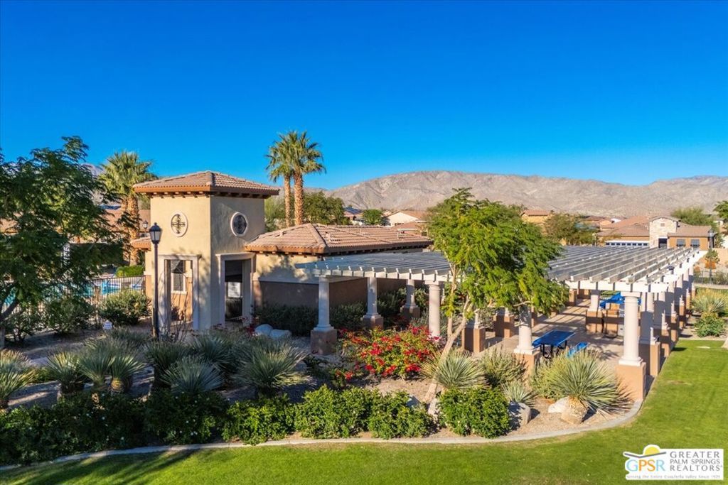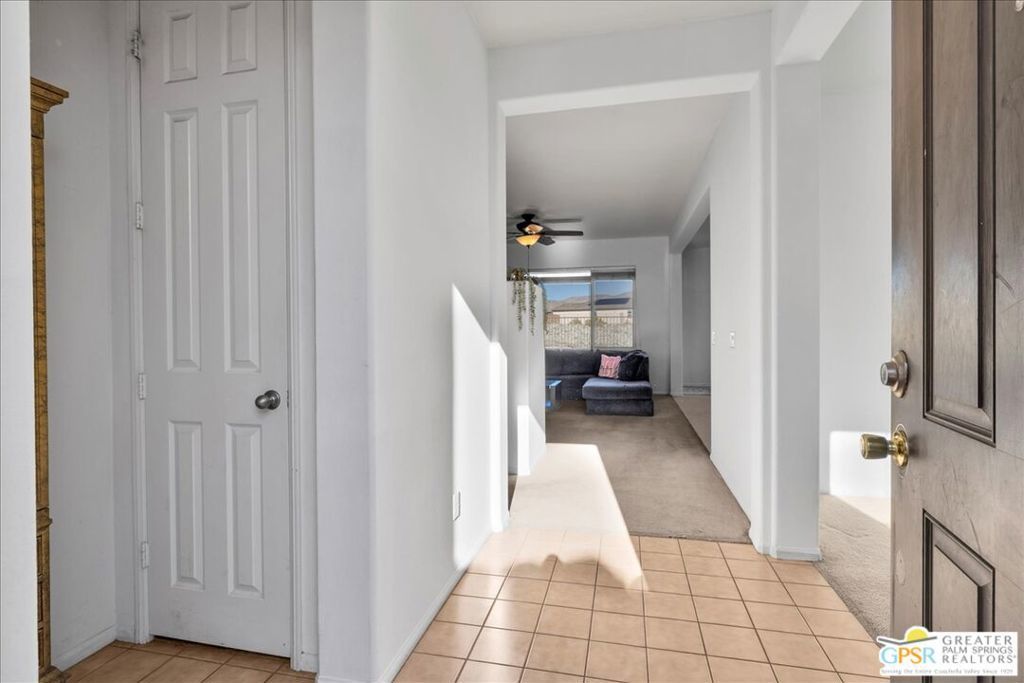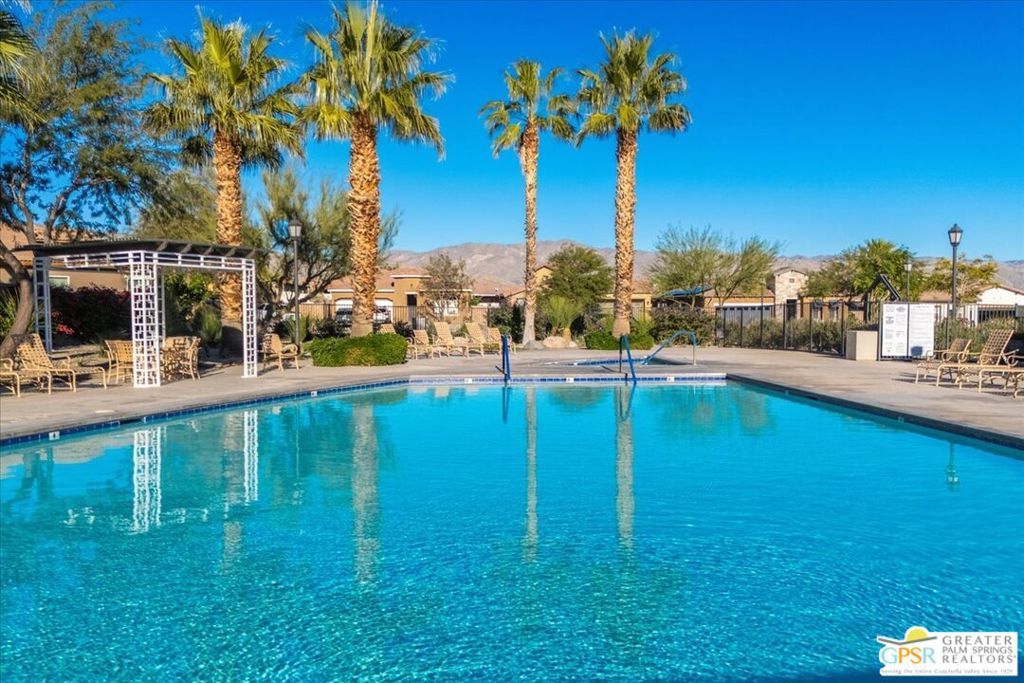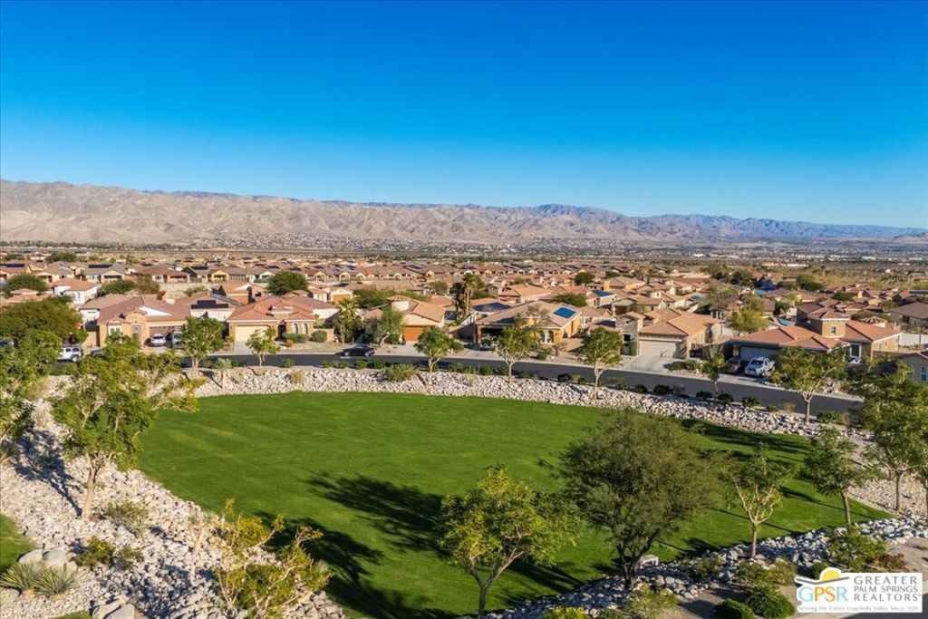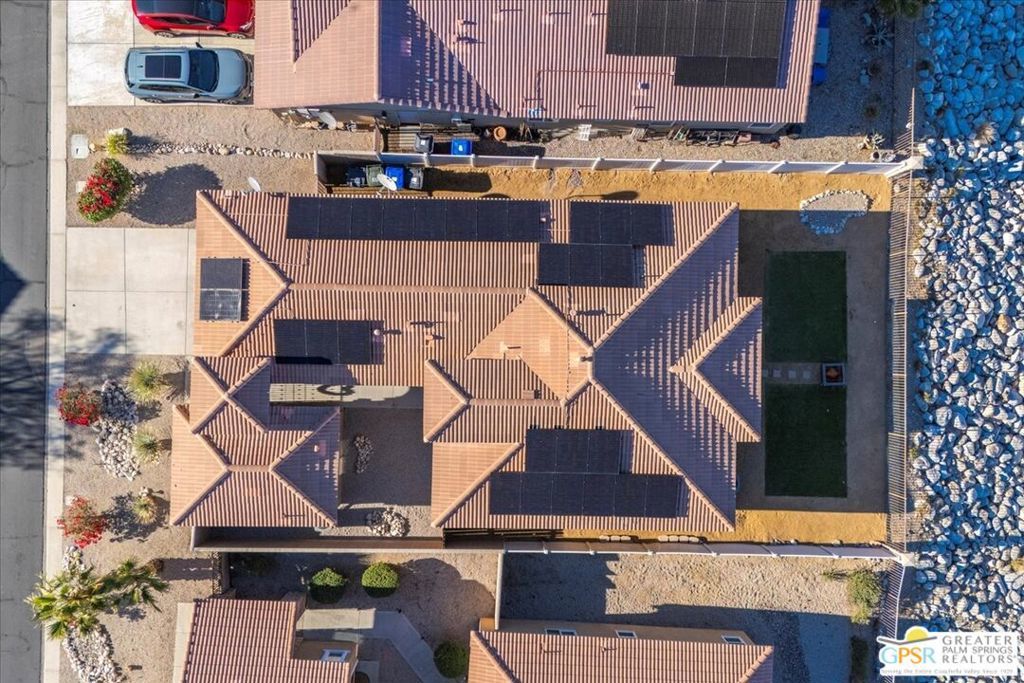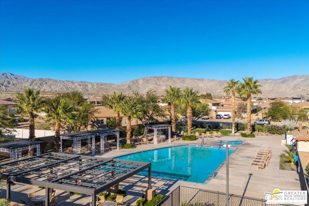 Skyborne is one of the fastest growing communities in Desert Hot Springs, and once you visit you will see why! This is a family-friendly gated community with low HOAs and beautiful common areas. This community offers a mix of part-time and full-time residents who enjoy the peaceful serenity you get once inside the gates, as well as the clubhouse and resort-style pool and spa. This home has 3 bedrooms plus a den, and one of the bedrooms is a detached casita, giving your guests the ultimate privacy when they visit. If you work from home, the casita is also a way to get some quiet and privacy for your home office, and a separation from the main house. There is also a dedicated den in addition to the 3 bedrooms, offering a great spot for a media room or a home office. The living room and kitchen offer a wonderful large space to entertain, with plenty of counter and cabinet space. Outside you have two separate areas - a protected front courtyard that is private and shielded from the afternoon sun or wind, and a backyard that opens up to the wash, allowing for beautiful views and distance from your neighbors. The north-facing layout of the backyard means you can leave your window coverings open all year, even during the hot summer months, and enjoy the natural light. This house also has solar already installed, so you can come enjoy the health and wellness the desert offers, while also harnessing the sunlight to power your home!