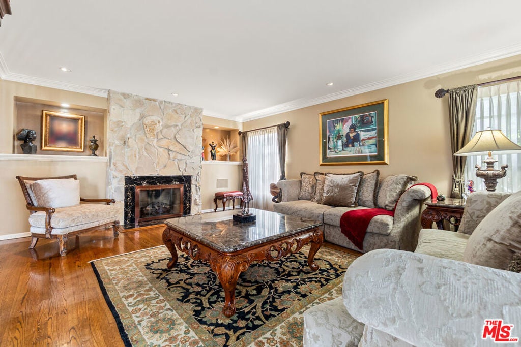 Stunning 2-Story Home in Prestigious Historic View Park A beautifully appointed 4 bedroom, 4 bath residence offering 2,927 sqft of refined living space in the highly sought after Historic View Park neighborhood. The entry showcases gleaming hardwood floors and an elegant stone staircase that gracefully splits to the second level. Downstairs boasts a spacious living room that features a stone fireplace, custom insets with accent lighting, and three large windows that fill the space with natural light. Across the entry, the formal dining room provides an inviting setting for dining and entertaining. The well designed kitchen is equipped with stone countertops, tile backsplash, rich dark wood custom cabinetry with glass front accents, under cabinet lighting, a built-in double oven, and tile flooring. An adjoining eating area offers additional convenience. Just off the kitchen, the laundry room includes matching custom cabinetry and a prep sink, and a powder room. At the rear of the home, the family room features a second fireplace with a wood mantle, lit display insets, and a glass slider leading to the backyard. A downstairs bedroom that is deal for guests or workspace, sits adjacent to a beautifully upgraded bath with wood vanity, stone countertop, vessel sink, and a shower with diagonally set decorative stone tile. Ascend the staircase to a thoughtful upper-level layout: one side leads to the primary suite with its own private bath, while the opposite side offers two additional bedrooms and a hallway bath. One bedroom features direct access to a private patio with rooftop and peek-a-boo mountain views. Another bedroom enjoys a striking view of Downtown Los Angeles from the window. The multi-tiered backyard offers versatile outdoor living, with a partially covered upper concrete terrace and two lower levels combining lawn and hardscape, perfect for relaxing or entertaining. Additional features include recessed lighting throughout most of the downstairs, central heating and air, ceiling fans in all bedrooms, and a two-car garage. Close proximity to Kenneth Hahn State Park, scenic hiking trails, and neighborhood walking paths adds to the home's appeal. Come be the newest neighbor!