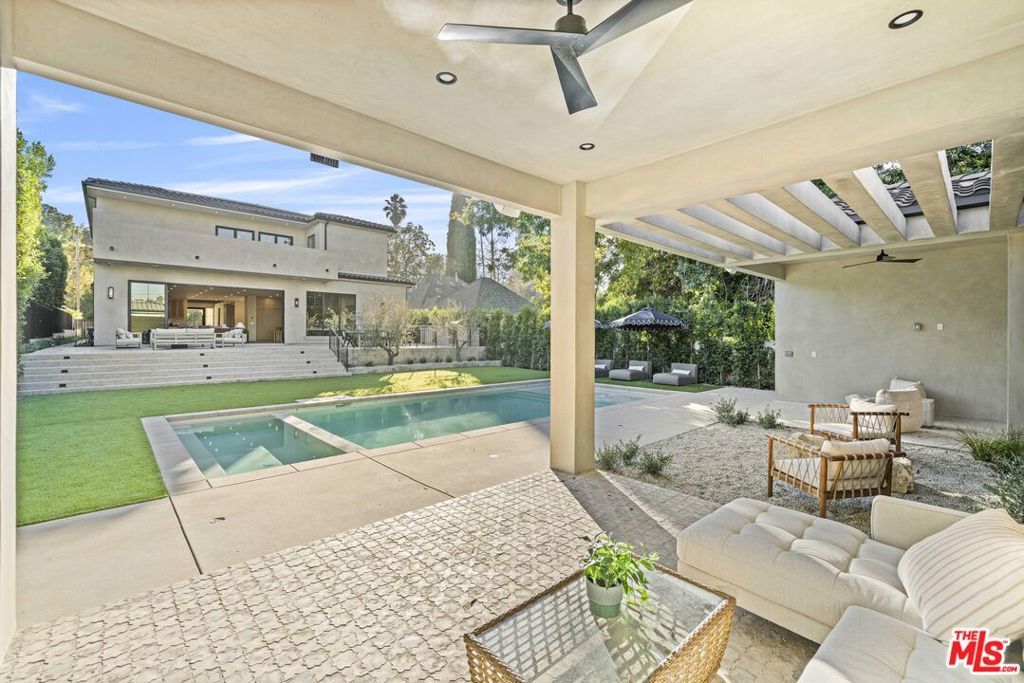 Welcome to Casa Verde, one of the largest and most extraordinary homes ever built south of the Boulevard in Sherman Oaks. Set on an expansive 13,000 sq ft lot, this 5-bed, 7-bath estate blends timeless European influence with high-end contemporary design, featuring hand-applied limewashed walls, a sculptural plaster staircase, and natural light pouring in from every angle. Step through the custom oversized pivot door and you're immediately met with soaring ceilings and a floor plan crafted for true indoor/outdoor entertaining. A large custom bar sits at the center of the home, creating a stunning focal point and seamless flow into the expansive dining area, where floor-to-ceiling sliders open to a private outdoor sanctuary anchored by a limestone fireplace. The chef's kitchen features custom white oak cabinetry, travertine counters, and panel-ready appliances that disappear into the design. A hidden butler's kitchen with its own cooktop, sink, dishwasher, and walk-in pantry keeps prep work tucked away when hosting. The generous family room opens to the oversized backyard with ample patio space, an outdoor kitchen, large pool, two covered cabanas, and a full bathroom. The main floor is completed with a large home theater, office, bedroom and reading nook. Upstairs are 4 additional bedrooms, each with its own en-suite bath and walk-in closet. The oversized primary suite offers a floor-to-ceiling stone fireplace, two balconies, an expansive walk-in closet, and a private bonus room ideal as a yoga studio, nursery, or second closet. The spa-like bathroom features a large zellige-tiled rain shower, freestanding tub with mountain views, makeup vanity, and dual water closets.Tucked in an exceptional walkable pocket, Casa Verde is moments from some of the city's best restaurants and coffee shops, Anajak Thai, Bacari, The Blvd, Cream, and more, as well as The Buckley School. This is a rare opportunity to own a statement property defined by scale, design, and craftsmanship.