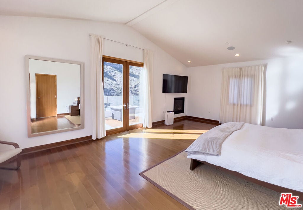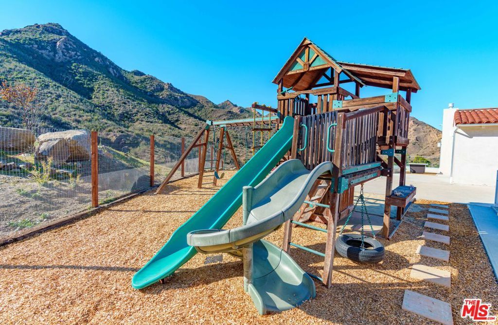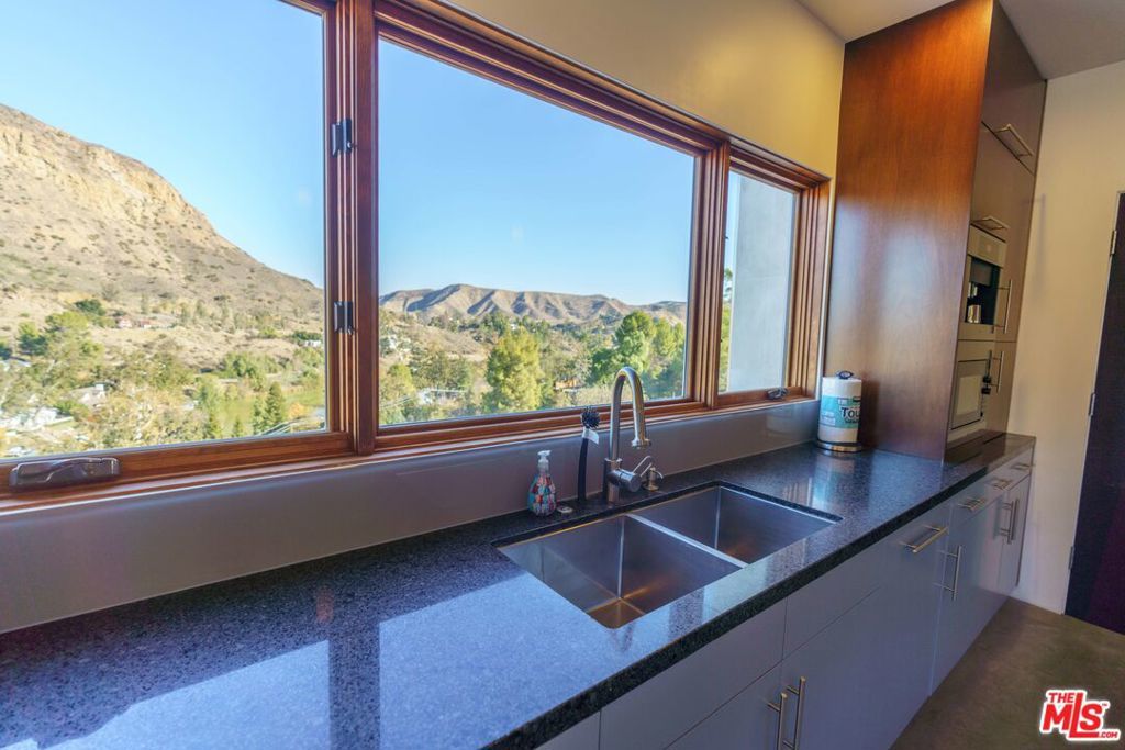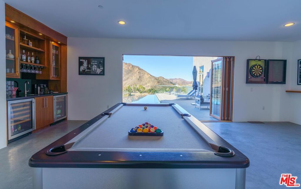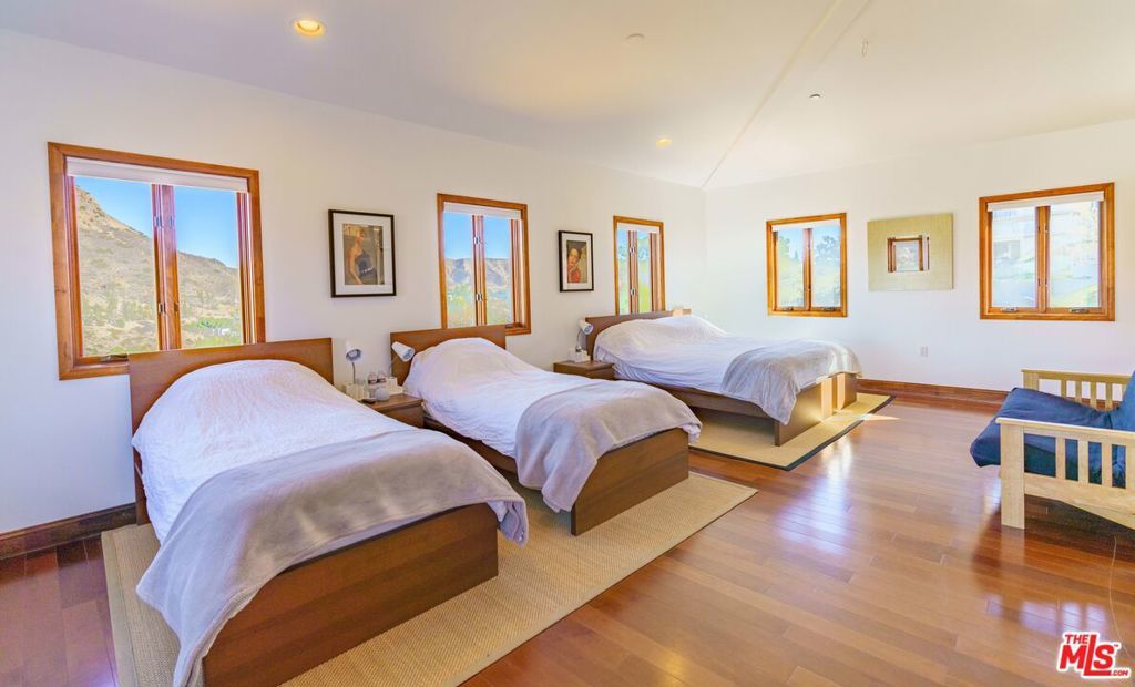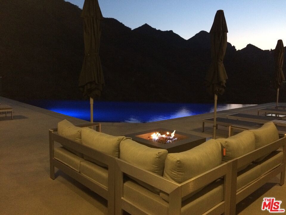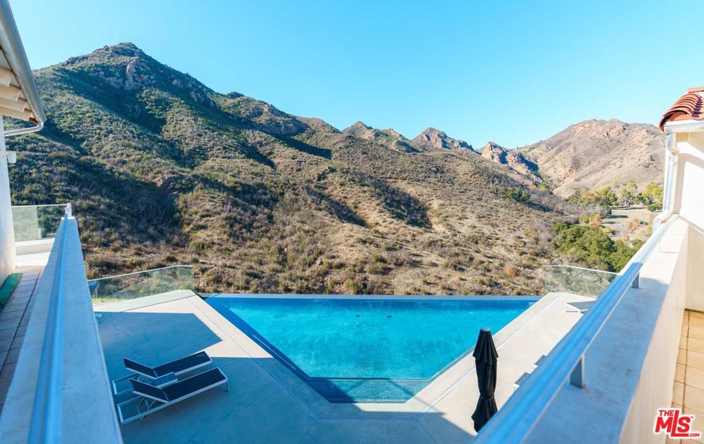 This imposing gated Private Estate sits proudly on its own 5-acre hilltop, and boasts breath taking mountain views from every window! The kitchen overlooks picturesque Malibou Lake while the gorgeous infinity pool appears to flow into a completely private canyon. Located at the very end of a quiet cul-de-sac, this home really does offer peace and tranquility at its finest. Seemingly so far from the madding crowd, it is actually only 12 minutes to the beaches of Malibu and 8 minutes to the restaurants around the 101. And just a mile to the world-class Old Place restaurant and Cornell Winery.The main entertaining level consists of an oversized Foyer, Formal Dining Room, state of the art Kitchen, Games Room with a full bar area and, of course, the Great Room which includes aninformal second dining area. One full and one half bath complete the main level. Soaring ceilings, stone fireplaces and architectural elements make it a truly awe-inspiring setting. Walls of glass fold back to connect seamlessly to the expansive deck and unique triangular infinity pool. Indoor/outdoor living done right! Moving upstairs there are two huge master suites; the primary master with an elegant masterbath and huge walk-in closet, plus an additional oversized bedroom with private bath and walk-in closet. Each master suite has direct access to its own spacious patio.Below the main level is a spacious 4 bed, two bath 'apartment', complete with living/dining roomand galley kitchen. This level can be elegantly separated from the main 'upper' house by use of the smooth slab doors that can seal off the connecting staircase. Each of the lower rooms has direct outdoor access and an incredible view. (A reduced room count can be provided with appropriate price reduction, and for longer lease, aseparate guest house can be included.)