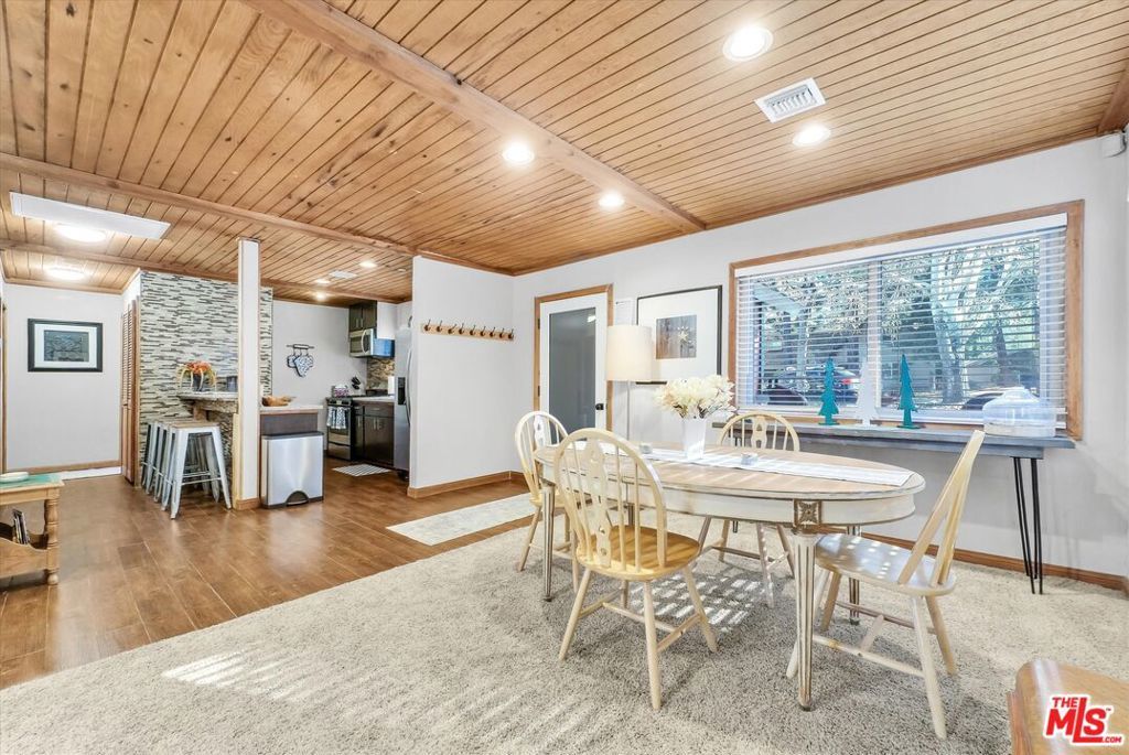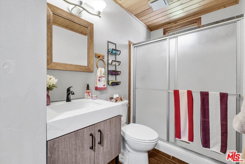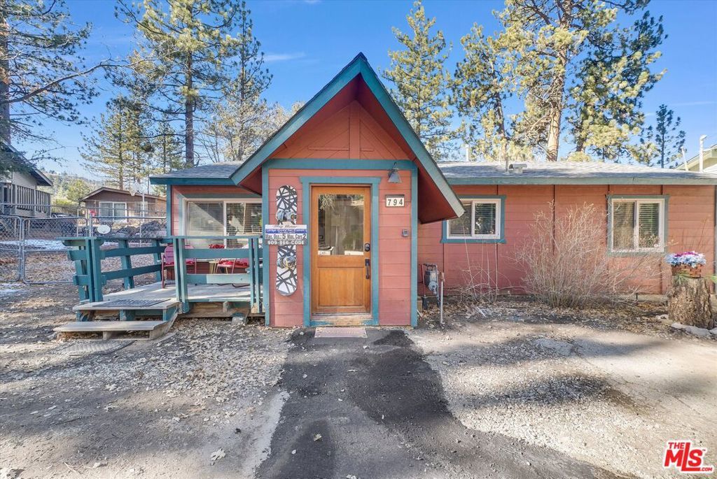 What better location for a vacation rental/weekend getaway then the Summit Estates area of Big Bear Lake neighboring Snow Summit Ski Area Resort! A year-round resort with Winter snow sports like skiing/boarding/tubing and a Summer gathering for mountain biking, hiking and scenic chair rides. First house at the top of the street on St. Moritz Dr., just below Switzerland Dr, a snowball toss to the resort. This is a very sought after location in Big Bear Lake. Situated on a large flat level fenced lot, the expansion possibilities are there to be realized. Circular paved driveway brings you in with room for boat or RV parking on site. Classic Sierra style architecture offers an open floor plan. This cabin is turnkey and ready to go. Cute front porch with wrap around built in seating. Enter thru the wooded "mud room" for seasonal convenience. Ample sized living room with tasteful furnishings throughout. Dining area with corner windows offering light and vistas. Lovely antique table and chairs with room to seat 6. Updated kitchen offers a breakfast bar with seating, granite counters, stainless appliances, & pantry. 2 spacious bedrooms with queen beds. Both bathrooms are lined with pecky cedar for a rustic feel. Lovely solid wood mahogany interior doors and wood ceilings throughout the home. Forced air central heat to keep everyone nice and toasty. Washer/dryer hookups in the stackable closet off the hallway. Exit sliding glass door to back yard open concrete patio with seating and BBQ. Fully fenced rear yard with raised deck and outdoor spa. Raised deck has built in seating and room for dining, as well as a bubbly spa/hot tub. This is an excellent investment opportunity to own a home in a year-round resort, that has the potential to pay for itself, as well as generate income. Just in time for the coming Winter Season.