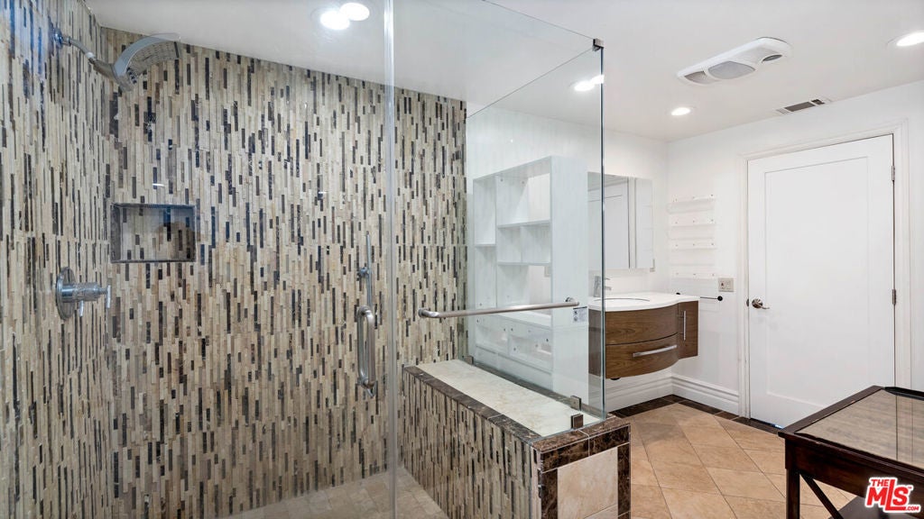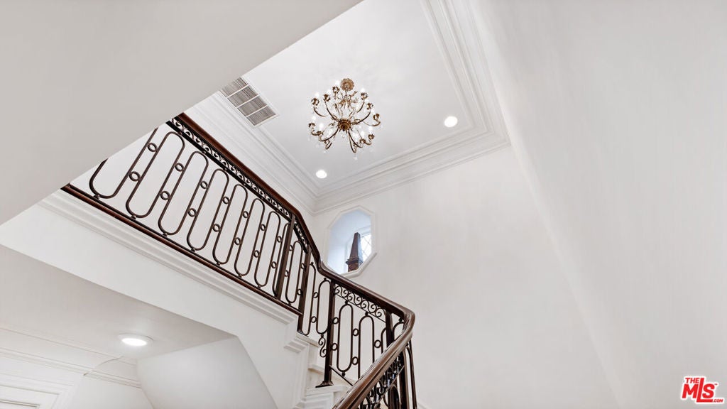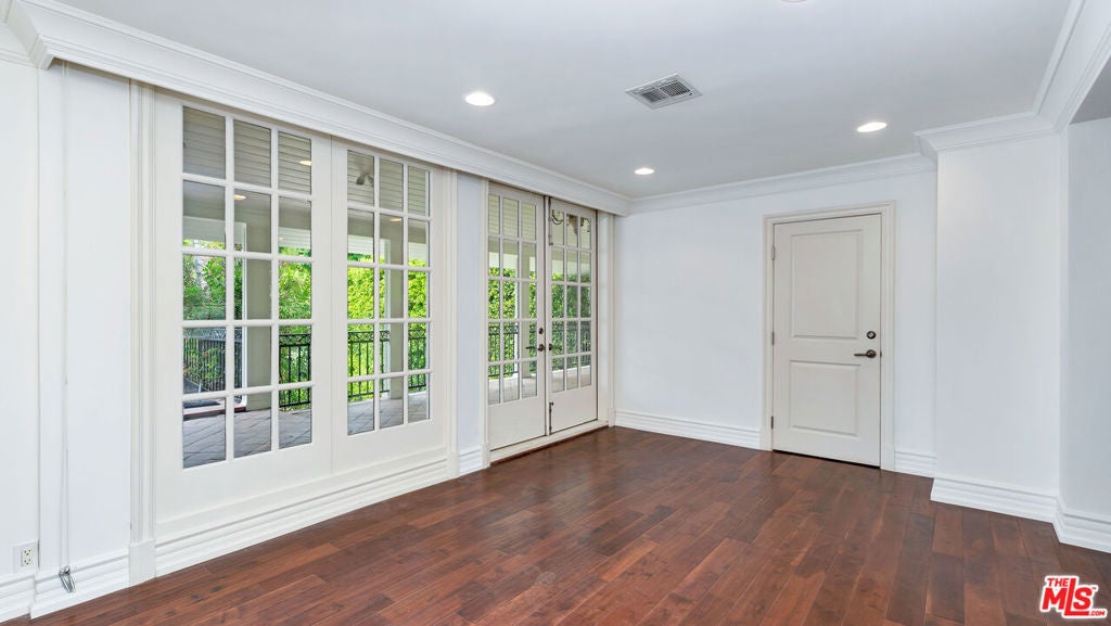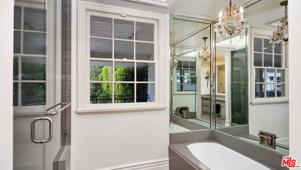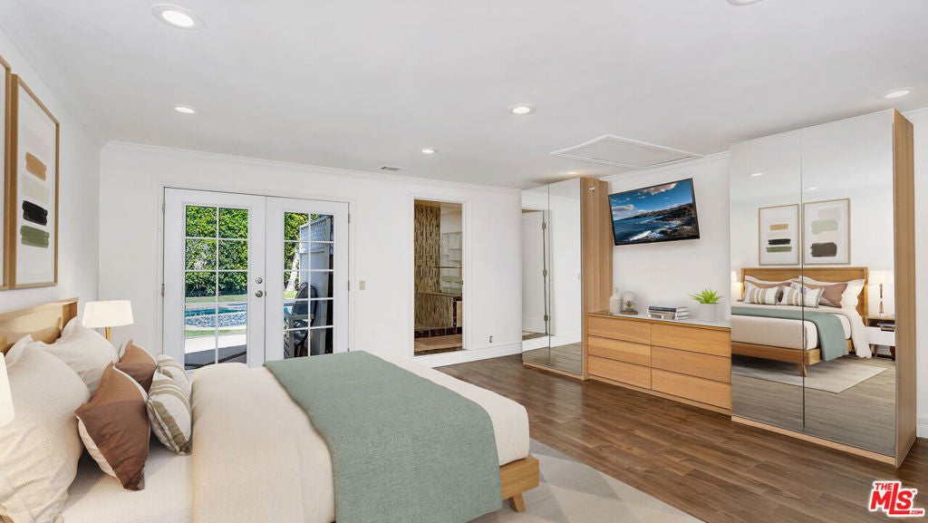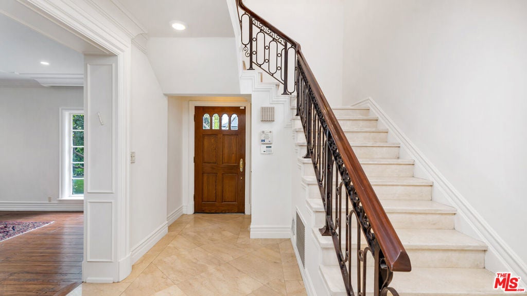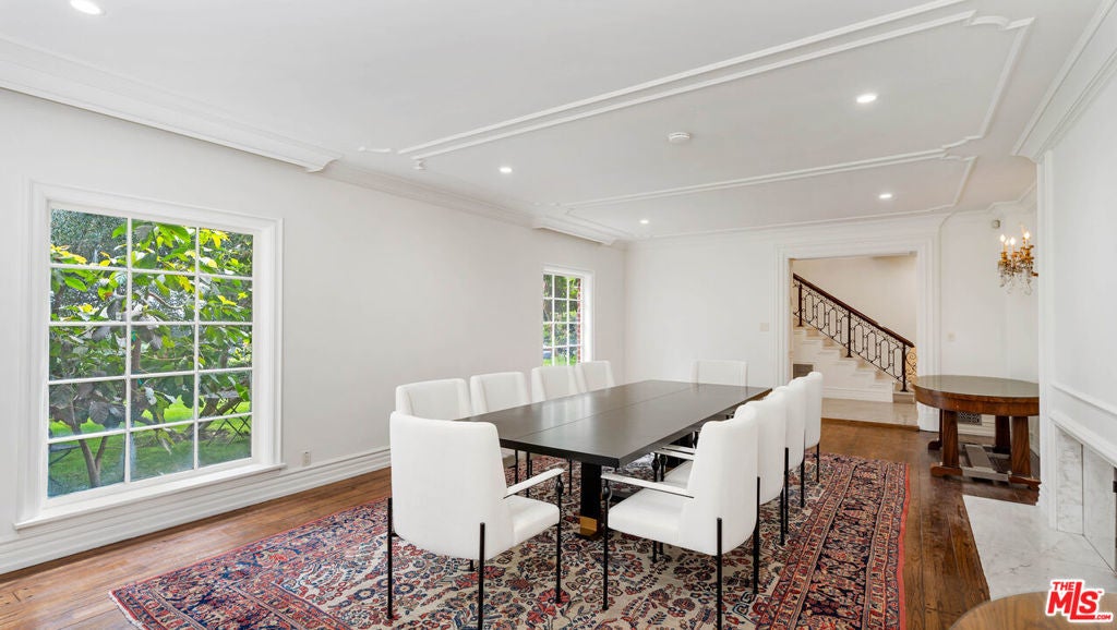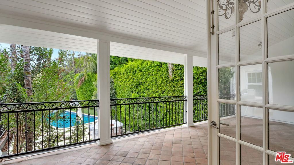 An extraordinary opportunity to live in a Beverly Hills Flats estate, perfectly situated just moments from the iconic Waldorf Astoria and Rodeo Drive. Set on a generous flat lot, this private property offers an impressive combination of scale, quality, and comfort across a main residence and a fully equipped back house totaling 7 bedrooms and 6.5 baths. Step inside the two story foyer and experience timeless elegance highlighted by mahogany doors and windows, hardwood flooring, and beautifully crafted architectural details, with sunlight pouring through the windows to create a bright and inviting ambiance throughout the home. The kitchen opens directly to a warm and spacious living area anchored by a classic fireplace, ideal for everyday enjoyment or hosting guests. Upstairs, you will find four ensuite bedrooms including a refined primary suite featuring a gorgeous fireplace, a large private balcony overlooking the lush grounds, dual walk in closets, and a spa inspired bathroom with dual vanities, a soaking tub, and an oversized shower. The lower level is thoughtfully designed for entertainment and versatility, offering a generous media and lounge area, a dedicated office, one bedroom, a full bathroom, a powder room, and abundant storage. The backyard feels like a resort, complete with a pool and spa, beautifully landscaped gardens, and a detached guest house with two bedrooms, two baths, its own kitchen, and a built in bar, perfect for guests, long term stays, creative use, or staff accommodations. Mature landscaping surrounds the property, creating a serene setting ideal for relaxation and entertaining.