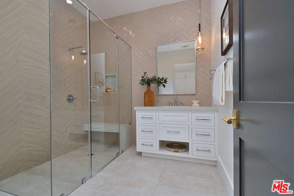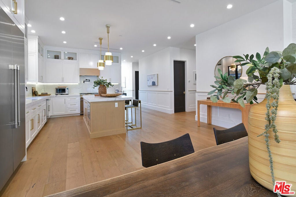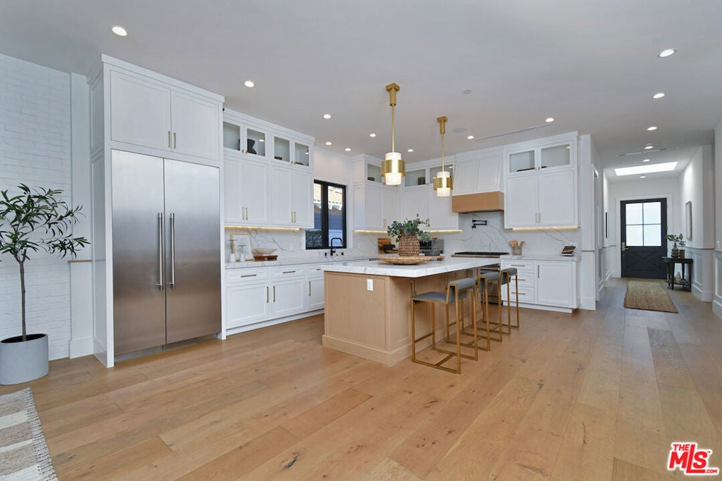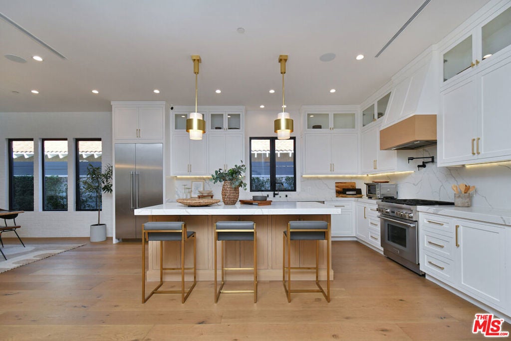 Welcome to this exceptional newer custom-built modern traditional home, designed with a focus on refined comfort and everyday ease. Located south of Ventura Blvd. behind a private gated entrance, this single-story residence features high ceilings, wide-plank hardwood floors, and an open layout that feels fresh and inviting from the moment you step into the entry foyer. The island kitchen anchors the home with custom cabinetry, a walk-in food pantry, and connection to the dining and living spaces. The formal dining area includes a built-in buffet and wine storage, offering both function and style. The adjoining living room provides a warm gathering space with built-in cabinetry, simple modern shelving, and a wood-detailed feature wall. A full wall of floor-to-ceiling sliding glass doors fills the room with natural light and opens to the backyard for easy indoor/outdoor living. All four bedrooms include their own en-suite bathrooms, and the large primary suite offers a generous retreat with a high beamed ceiling, walk-in closet, and a luxurious bath with a soaking tub and glass shower. The backyard is finished for relaxed enjoyment, complete with a heated pool and spa, patio area for dining, and a built-in BBQ island. Additional features include an indoor side-by-side laundry room and a finished two-car garage with direct entry. Thoughtful woodwork, custom hardware, and quality craftsmanship contribute to the clean, modern feel throughout. With its 2020 build/renovation, this home offers the comfort and appeal of new construction in a desirable Encino location close to shops, dining, and neighborhood amenities.