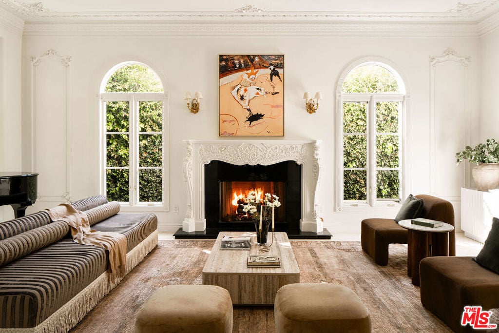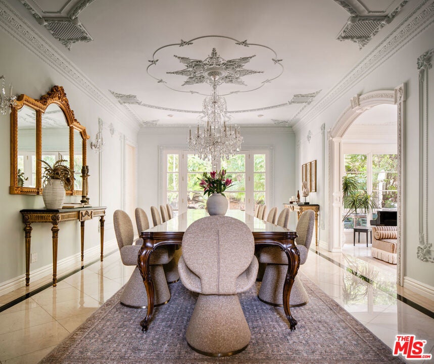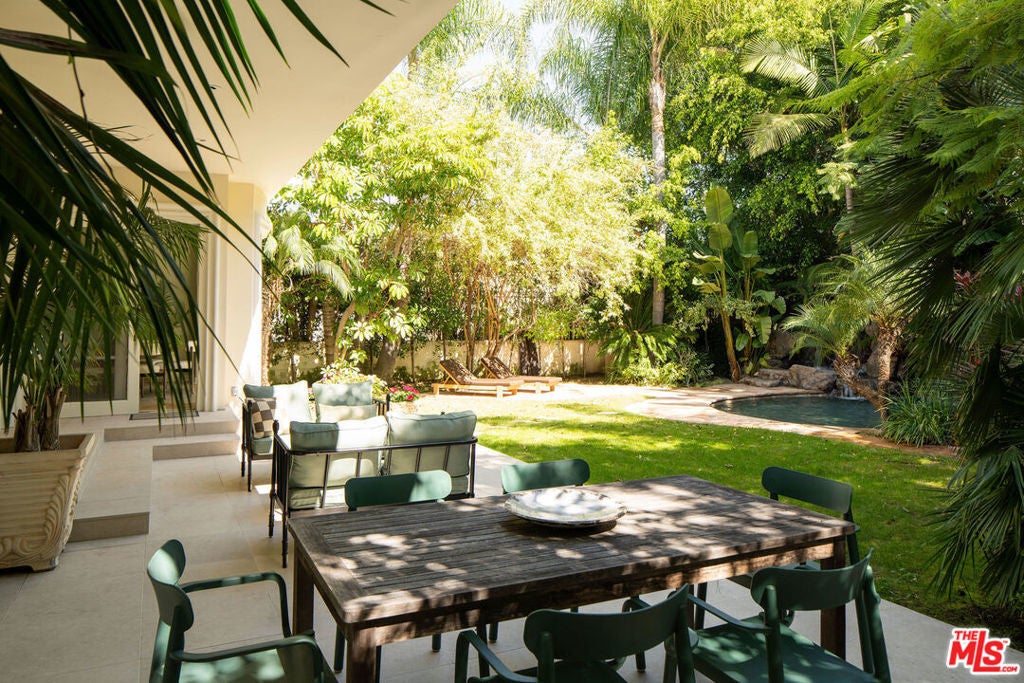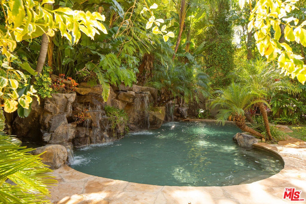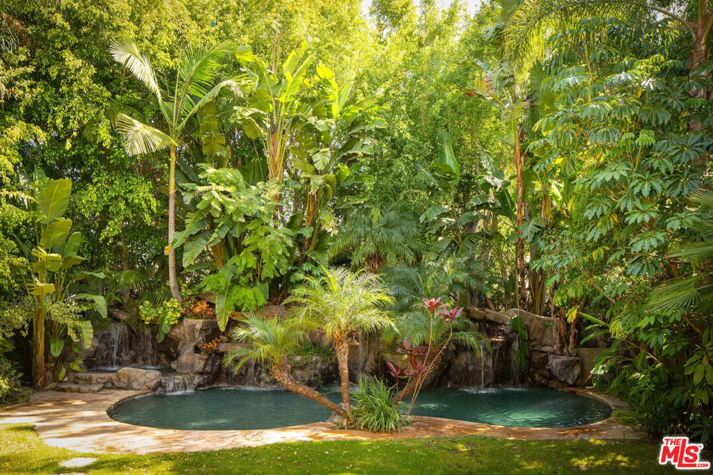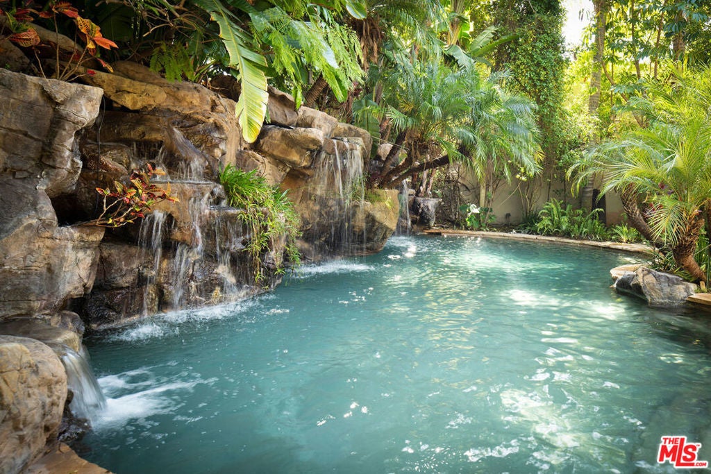 French Neoclassic Striking Prime Hancock Park Custom Home built from-the-ground-up in 2001 with 5 bedrooms + 5.5 baths, an amazing center hall plan with expansive rooms, high ceilings, intricate millwork, and lush grounds. Grand statement entry with 20 ft high ceilings, 10 ft high double front doors, dramatic double curved staircase with motorized sparkling crystal chandelier looks through dining room straight out to lush tropical backyard with palm trees, waterfalls, resort pool. Oversized formal dining room with architectural ornate molding opens with double doors to outdoor patio with pool, sun drenched formal living room with gas fireplace on one side, and kitchen/breakfast room on the other. Kitchen with center island, double sinks, double ovens, warming drawer, Sub Zero fridge/freezer has a breakfast room with beautiful windows to backyard with pool. The spacious elegant breakfast room overlooks the pool with radiused windows, and opens with doors to a newly tiled Jerusalem stone outdoor deck with built-in bbq. The yard with pool, built in 2004 and remote controlled, is an oasis with waterfalls, lush landscaping, spa, lounge deck. The living room has a grand piano and a roaring gas fireplace. The great big family room has built-in bookcases and TV, and a full wet bar. Powder room and laundry room down. One bedroom suite downstairs currently staged as an office. Upstairs, the grand oversized primary bedroom has new white oak floors, statement fireplace, large deck overlooking the pools and waterfalls, 5 closets, and a large en-suite bath with toilet closet +walk-in shower + sunken spa tub + skylight + double vanity with sinks. Three secondary bedroom suites upstairs with generous closets and full baths. Thoughtful storage space includes double deep storage closets under each staircase, coat closet, and an upstairs hallway closet for storage. 10 ft hi ceilings downstairs and 9 ft upstairs, Pella double paned windows, three zones HVAC - 1 downstairs, 1 primary bedroom, 1 rest of the upstairs, smart alarm system, new industrial hot water heater, 8 foot high solid interior doors throughout. Built by an esteemed Hancock Park family for themselves and true pride of ownership!