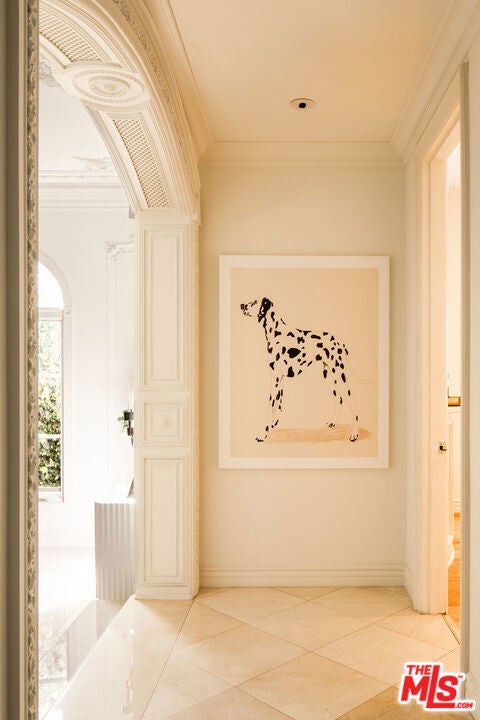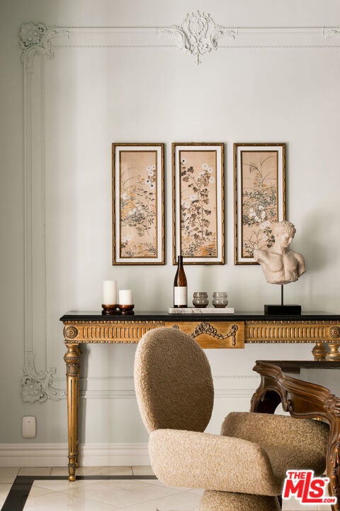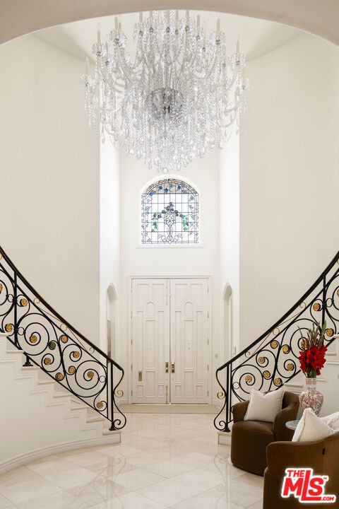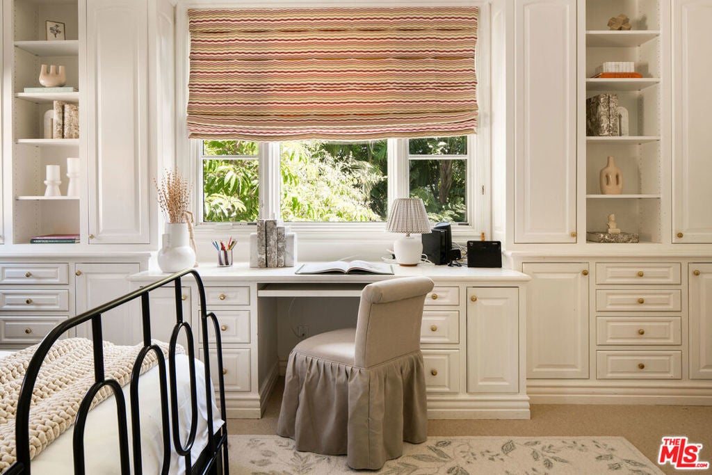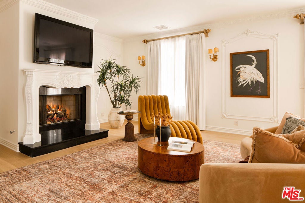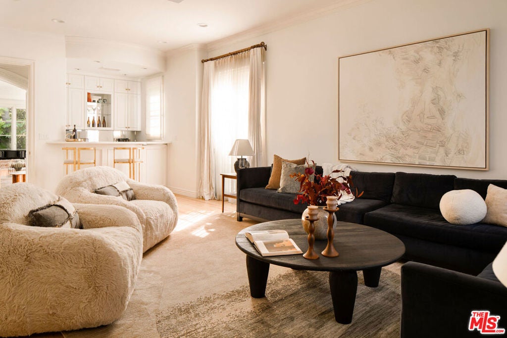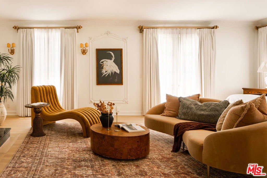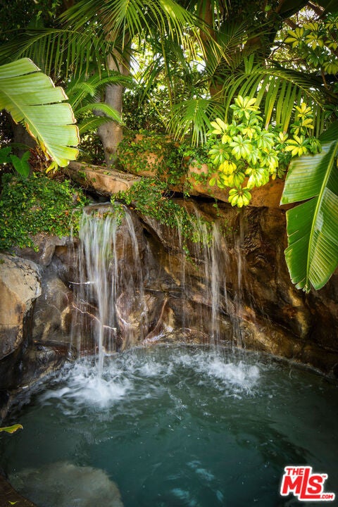 French Neoclassic Striking Prime Hancock Park Custom Home built from-the-ground-up in 2001 with 5 bedrooms + 5.5 baths, an amazing center hall plan with expansive rooms, high ceilings, intricate millwork, and lush grounds. Grand statement entry with 20 ft high ceilings, 10 ft high double front doors, dramatic double curved staircase with motorized sparkling crystal chandelier looks through dining room straight out to lush tropical backyard with palm trees, waterfalls, resort pool. Oversized formal dining room with architectural ornate molding opens with double doors to outdoor patio with pool, sun drenched formal living room with gas fireplace on one side, and kitchen/breakfast room on the other. Kitchen with center island, double sinks, double ovens, warming drawer, Sub Zero fridge/freezer has a breakfast room with beautiful windows to backyard with pool. The spacious elegant breakfast room overlooks the pool with radiused windows, and opens with doors to a newly tiled Jerusalem stone outdoor deck with built-in bbq. The yard with pool, built in 2004 and remote controlled, is an oasis with waterfalls, lush landscaping, spa, lounge deck. The living room has a grand piano and a roaring gas fireplace. The great big family room has built-in bookcases and TV, and a full wet bar. Powder room and laundry room down. One bedroom suite downstairs currently staged as an office. Upstairs, the grand oversized primary bedroom has new white oak floors, statement fireplace, large deck overlooking the pools and waterfalls, 5 closets, and a large en-suite bath with toilet closet +walk-in shower + sunken spa tub + skylight + double vanity with sinks. Three secondary bedroom suites upstairs with generous closets and full baths. Thoughtful storage space includes double deep storage closets under each staircase, coat closet, and an upstairs hallway closet for storage. 10 ft hi ceilings downstairs and 9 ft upstairs, Pella double paned windows, three zones HVAC - 1 downstairs, 1 primary bedroom, 1 rest of the upstairs, smart alarm system, new industrial hot water heater, 8 foot high solid interior doors throughout. Built by an esteemed Hancock Park family for themselves and true pride of ownership!