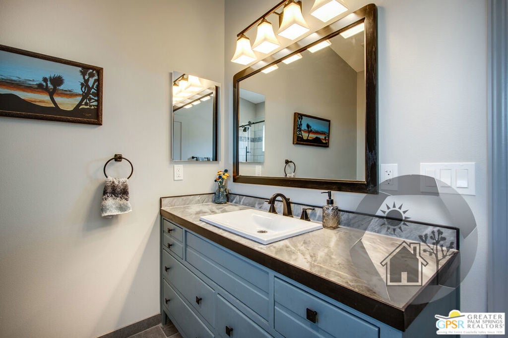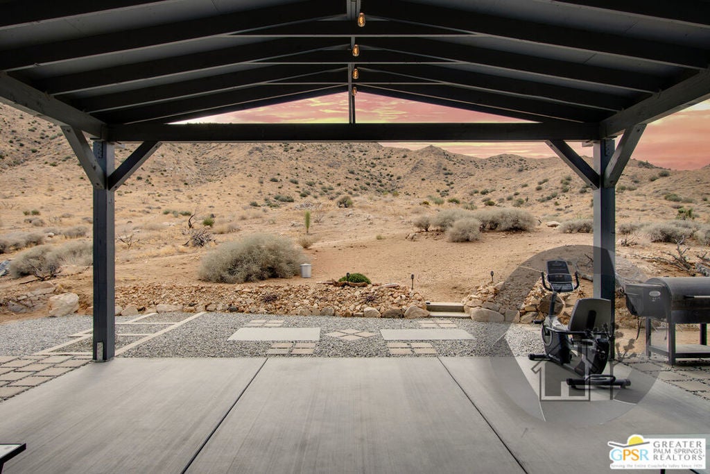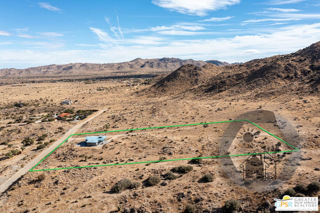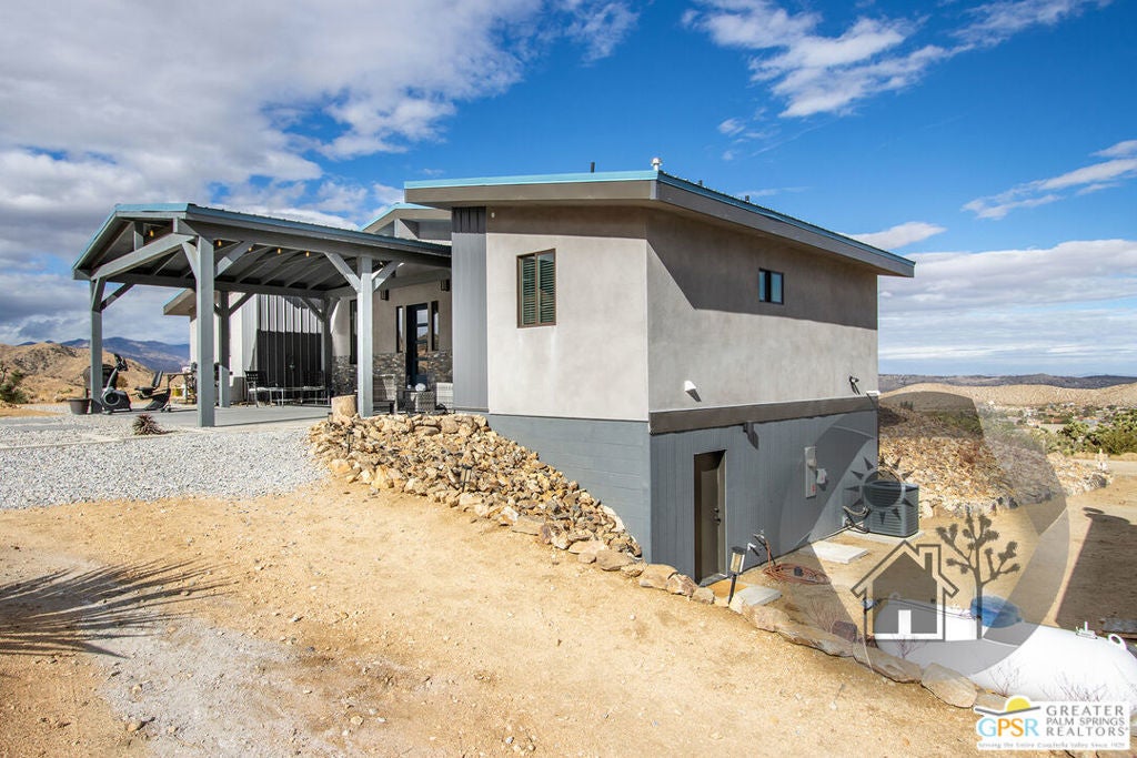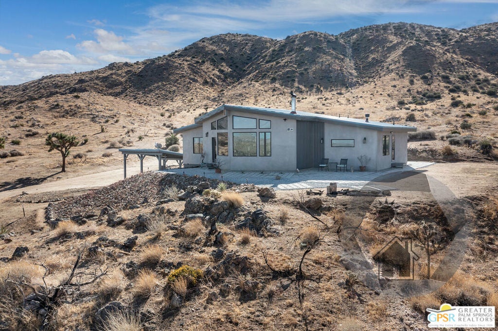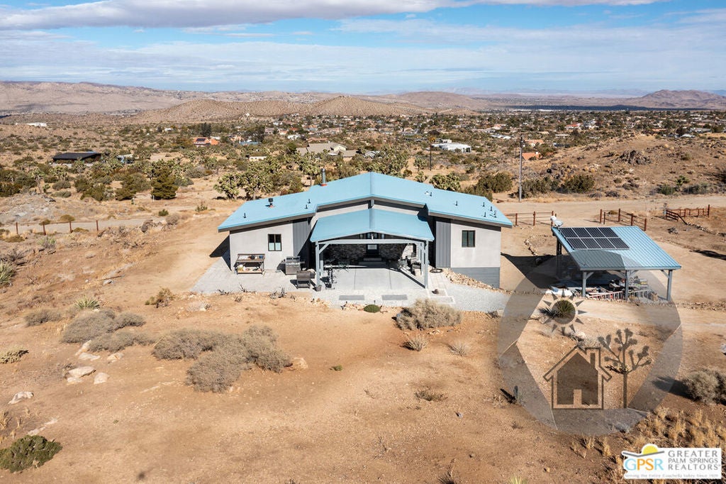 A Truly Exceptional property with Spectacular views overlooking Yucca Valley and beyond! This Custom home was lovingly designed and built in 2021 with the unparalleled views in mind! Nestled in the south side hills of Yucca Valley at an elevation of about 3800 feet, this home offers the best of what the rural desert experience has to offer while still being just 3.5 miles from the center of town with all it's great restaurants and quaint shops! Whether you are looking for a full-time residence with land that provides you privacy, peace and quiet, or as a vacation home to get away from it all, this is the gem you've been dreaming of! The Joshua Tree Natl Park hills are even located very close to the back of this 5 Acres, so for nature lovers, this is the place for you to enjoy sightings of Gambel's Quail, Roadrunners, and other species of birds plus the Cottontails and Jackrabbits and an occasional Coyote, Mule Deer and other beautiful animals! This modern layout also includes a partial basement with almost another 400 SF now used for storage and workshop but would be great Guest Quarters! The Front door is facing the private South hills with 18x22 Gorgeous patio entry to this beauty! The outdoor areas on 3 sides with custom doors provide views and relaxation areas. The home features Stone, Glass, Metal and Stucco exterior and the Great Room is breathtaking as you enter! You can see forever in the expansive almost floor to ceiling windows! Custom light fixtures are amazing, vaulted beamed great room and the kitchen is so special! Gorgeous custom cabinets, huge quartz island and breakfast bar and large dining area by those windows! Built in Coffee/Wine bar and also great reading nook. Custom live edge wood shelves in several areas. The home has two wings, each with a bedroom and bath. Master retreat is stunning with gorgeous view windows, it's own gas stove for cozy nights, and large gorgeous custom master bath with large walk in closet, large marble walk in shower and lovely vanity area. The guest room is great and bath is custom marble as well. Large laundry and pantry room with loads of cabinets. Upgraded appliances all stay too, Stainless steel. Has RO water and an instant hot water at the kitchen sink. This kitchen is a dream, with Wall oven and microwave, large gas range top and huge island with gorgeous cabinets. Once you get in this home, you honestly won't want to leave! You will feel like you are on top of the world! Custom fireplace in the living room has insert to heat over 2000 SF house. This home also has an owned solar system as well! Pictures don't do it full justice - Come see it for yourself! Truly one of a kind! Located only 2 hours from LA or San Diego with easy commute. Easy access but you feel like you are in complete privacy.