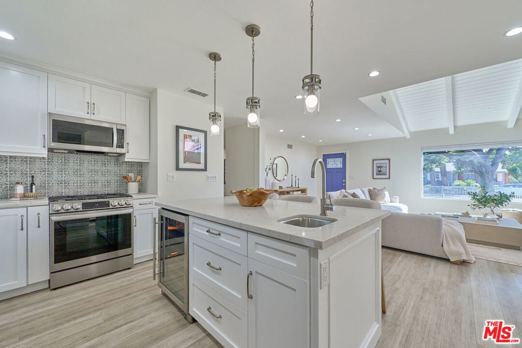 Completely reimagined and impeccably upgraded, this exquisite residence is nestled in the highly coveted Toluca Woods neighborhood. The show-stopping chef's kitchen features a statement island with integrated sink, custom frameless shaker cabinetry, and elegant Carrera quartz countertops, complemented by a full suite of top-of-the-line appliances including a counter-depth, three-door Wi-Fi enabled refrigerator, dishwasher, range, microwave, and dedicated wine refrigerator. Sophisticated flooring flows seamlessly throughout the home, enhanced by newer windows and designer recessed lighting. The expansive primary suite offers a true retreat, highlighted by dual skylights and a private spa-inspired bath. For added convenience, a washer and dryer are discreetly located within a nearby closet. The attached garage has been tastefully updated with a door, fresh drywall, and sleek epoxy flooring. Ideally positioned on the border of Burbank and Toluca Lake, you're just moments from premier dining, upscale boutiques, and entertainment. Warner Bros., Disney Studios, and Warner Bros. Ranch are all just a short drive away. Placing the very best of the industry and lifestyle at your doorstep.