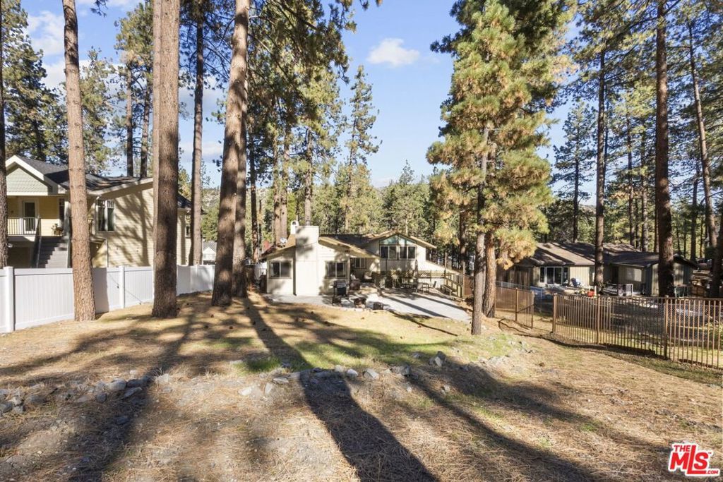 Gorgeous Wrightwood retreat located just minutes from the Country Club, the Village, and Mountain High Ski Resort. Situated on an expansive 16,500 sq ft tree-filled lot, this updated 2,474 sq ft home offers 4 bedrooms, 2.5 baths, and multiple living spaces ideal for relaxing or entertaining. The open floor plan features a bright living room, a family/dining room with a wood-burning fireplace insert, and a beautifully updated kitchen with granite counters, newer stainless steel appliances, under-cabinet lighting, and a large peninsula bar. The living room showcases recessed lighting, upgraded windows, a dining nook, and a sliding door leading to the sunny backyard deck. The primary suite includes vaulted ceilings, tree views, and an electric color-changing fireplace heater, plus an updated bath with separate tub and shower. Additional highlights include spacious secondary bedrooms (one with backyard access), laminate & tile flooring throughout, a whole-house fan, and a 2-car tandem garage with front and back doors. With its spacious layout, prime location, and serene lot, this property offers excellent potential as a secondary home, mountain retreat, or short-term rental. A rare opportunity this home is truly one of a kind