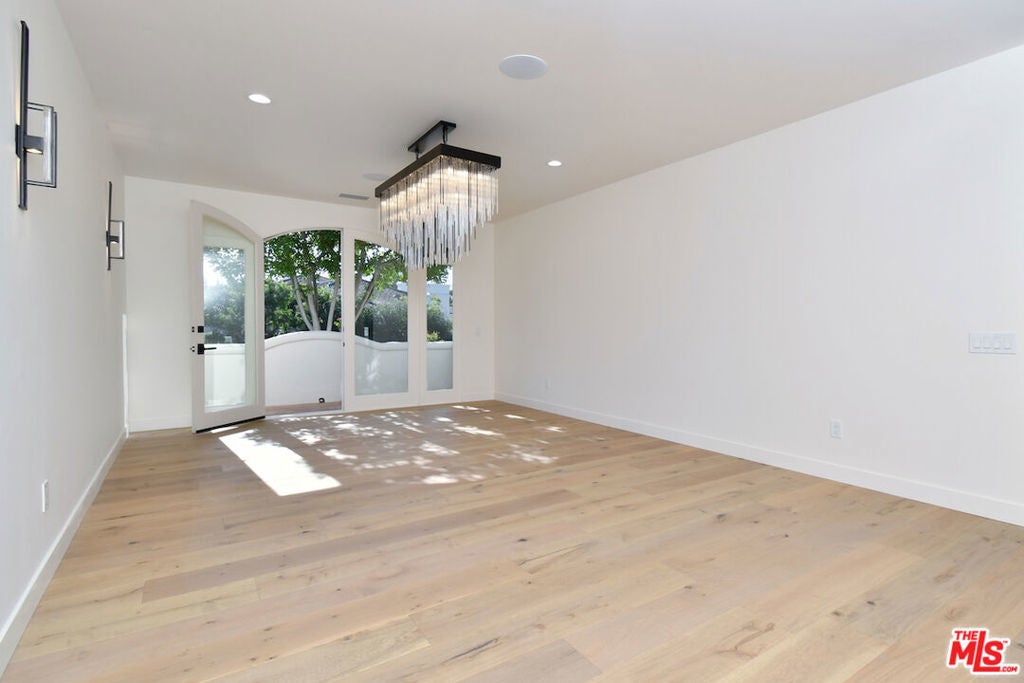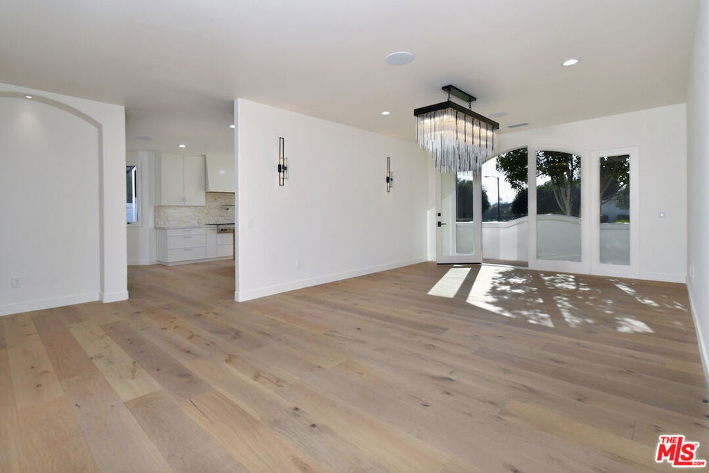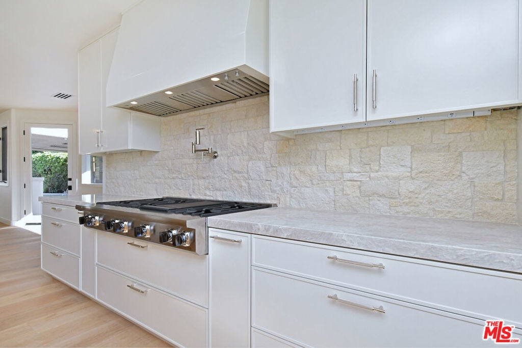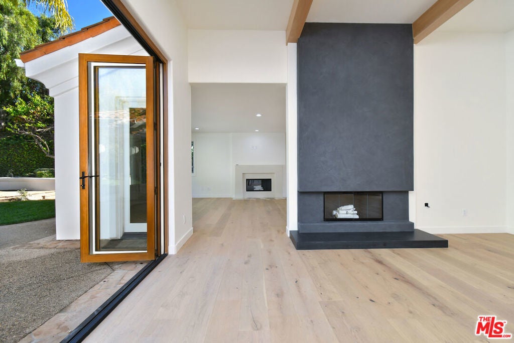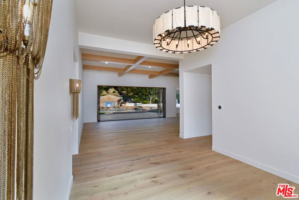 Absolutely stunning single-story residence tucked away on a quiet cul-de-sac within the prestigious 24-hour guard-gated Mountain View Estates in prime Calabasas. This newly renovated approx. 4,750 sq ft home offers 5 bedrooms and 6 baths on an expansive 18,300 sq ft corner lot, seamlessly blending modern luxury with quintessential California indoor-outdoor living. A dramatic pivot entry door opens to a light-filled showplace featuring soaring ceilings, wide-plank hardwood floors, and oversized retractable doors that create effortless flow to the outdoors. The expansive chef's kitchen is the heart of the home, showcasing a large center island, Taj Mahal quartzite countertops, custom cabinetry, brand-new Viking appliances, designer lighting, and an inviting dining area. The kitchen opens to a spacious family room with a custom wet bar, ice maker, beverage refrigerator, chic fireplace, and picturesque oversized window. Designed for entertaining, the formal dining room comfortably hosts large gatherings and holiday celebrations, while the formal living room exudes organic modern elegance with wood-beamed ceilings, a sleek Venetian plaster fireplace, and direct access to the lush backyard. The primary suite is a private retreat featuring a marble fireplace, spa-inspired bath with glass-enclosed shower, freestanding soaking tub, electric toilet, and dual walk-in closets. Three additional bedrooms are generously sized and ensuite. The oversized fifth bedroom offers flexibility as a bonus room, media room, or in-law suite. Additional highlights include a large utility room and 3-car garage with epoxy flooring and custom lighting. The resort-style backyard is designed for year-round enjoyment, featuring a covered outdoor dining pavilion with large-screen TV, serving area, beverage refrigerator, and beer tap. The redesigned pool and spa with Baja shelf, fire and water features, built-in BBQ, grassy play areas, and multiple entertaining zones complete this exceptional property. A rare opportunity to own a turnkey, one-story estate that truly checks every box; style, function, and setting.