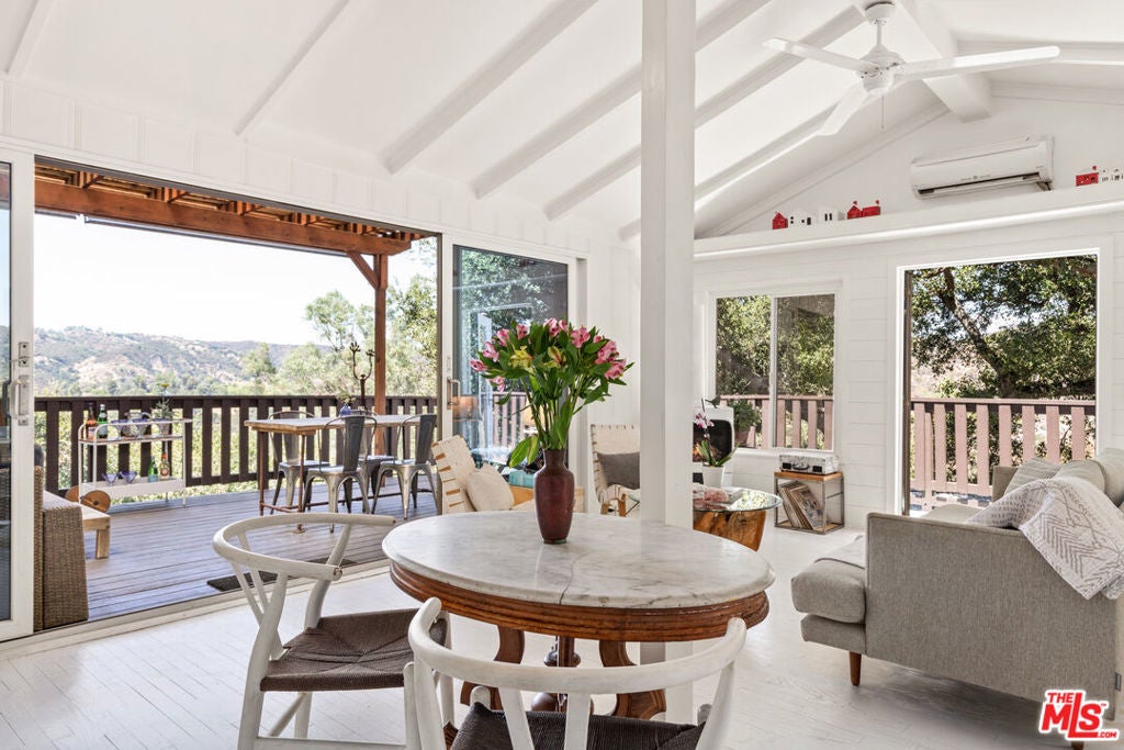 Welcome to your peaceful hideaway in the heart of Topanga. This 1925 storybook cottage, originally built as a hunter's cabin, has been lovingly transformed into a charming retreat nestled in the Santa Monica Mountains. This two-bedroom, one-bath home is move-in ready, featuring updated appliances and a warm, inviting ambiance. Step inside to an open kitchen with high-beam ceilings and a cozy living room anchored by a fireplace. The deck extends the living space outdoors, inviting you to immerse yourself in nature and take in the surrounding views. Birds, majestic oaks, and sun-kissed canyon hills are your closest neighbors. Downstairs, you'll find two cozy bedrooms and an updated bathroom with a soaking tub/shower. A storage shed on the property offers potential for an art studio, workshop, or private office. Additional highlights include fruit trees and an outdoor shower. Endless hiking trails and Topanga State Park are just moments away. Tucked into the private Sylvia Park neighborhood, yet only a short drive to the Valley or the PCH, this home offers the perfect balance of seclusion and convenience. Move right in or continue its success as a dream rental income opportunity. Two Assessor Parcel Numbers: 4442-016-037 & 047