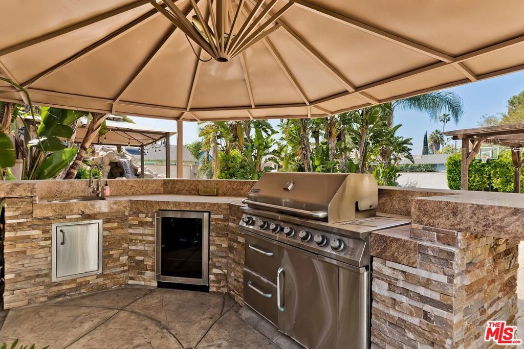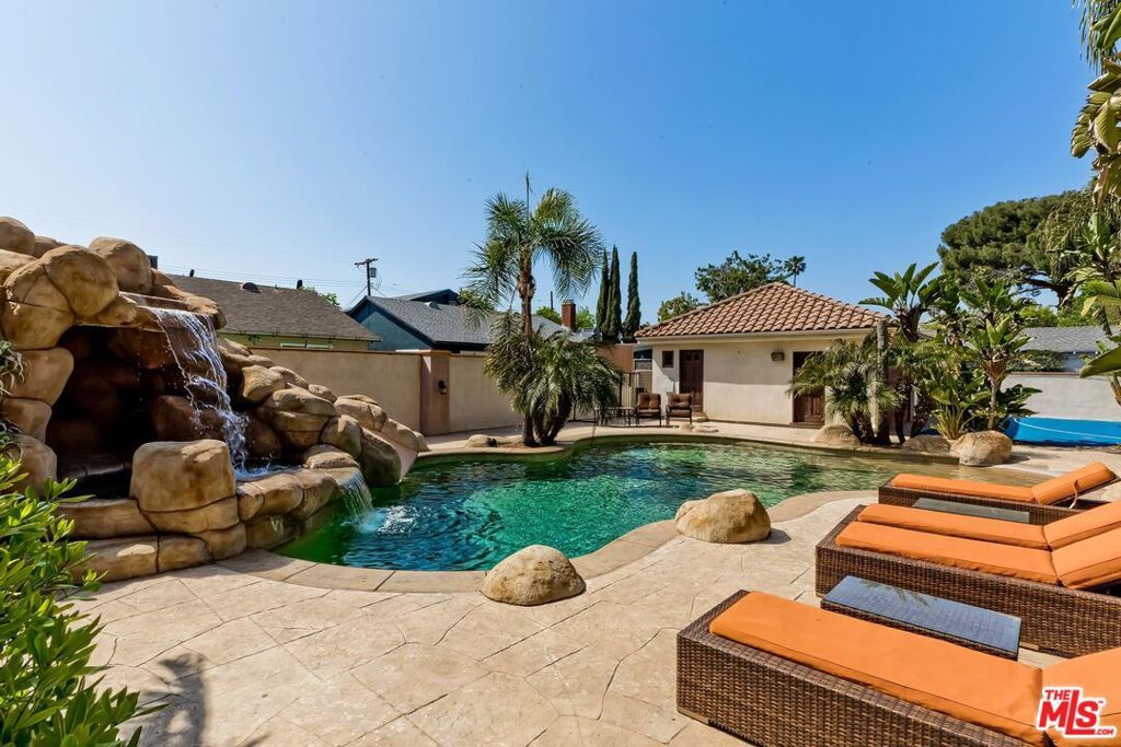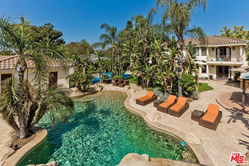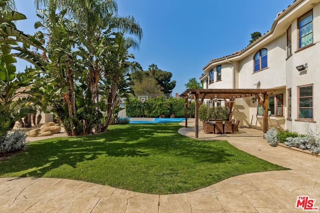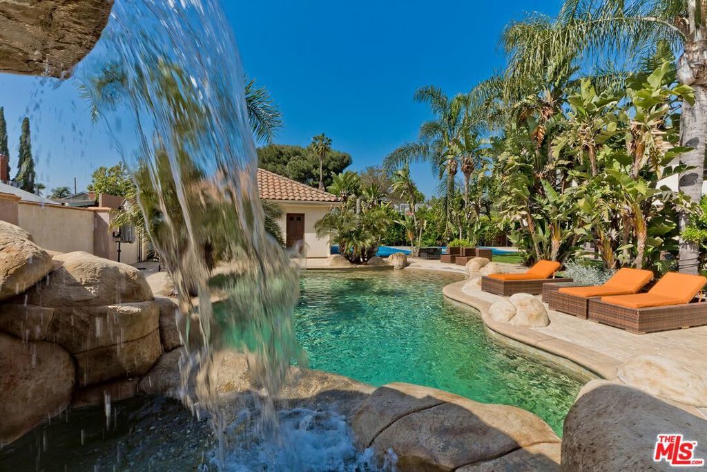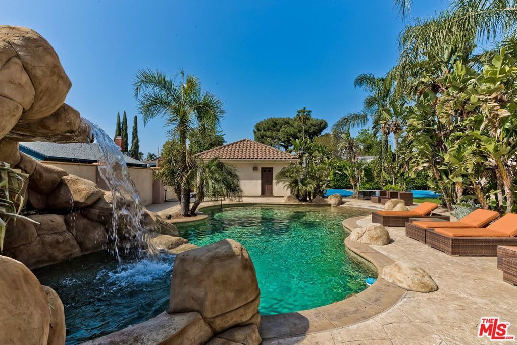 A luxurious & unique Fully Furnished Mediterranean Estate with a touch of modern living, unlike any other, with top-of-the-line privacy and security throughout. A sweeping staircase with ultra-high ceilings, a mix of wood & stone floors welcome you to the warm formal living room with a custom fireplace adjacent to a beautiful dining room with large picture windows for ample natural light. Beautiful stone floors guide you to a warm & modern family room with fireplace and wooden built-ins. Across is the awe-inspiring kitchen with a beautiful island and breakfast bar, designer stainless steel appliances, breakfast nook, and all conveniences for the gourmet chef. Upstairs, the primary suite showcases a fireplace, incredible closets, and a large balcony with views of the backyard oasis. The large spa-like master bath boasts soaring ceilings, large rain shower, dual vanity, and a soaking tub. The sprawling grounds feature a sparkling pool, spa with waterfall, BBQ center, Sports Court, spacious entertainment area and a pool cabana. Close to houses of worship, NOHO WEST shopping center, dining and freeway accessible near 170 and 101. A true one-of-a-kind estate. Don't let this one get away!