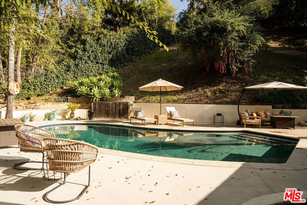 Tucked away at the end of a storybook cul-de-sac, this home is a true sanctuary where privacy meets effortless elegance. Beyond the gates, a tranquil oasis unfolds, offering a sense of calm and retreat from the moment you arrive. Sunlight pours into the open living spaces, highlighting light wide plank wood floors and soaring vaulted ceilings that create an inviting, airy atmosphere suited to both everyday living and special gatherings. Designed with entertaining in mind, the thoughtfully open floor plan and walls of windows flood the home with natural light. Sliding glass doors from both the primary bedroom and dining area open to a backyard that feels like a private resort. A sparkling pool, intimate seating areas gathered around a fire-pit, and a lush hillside backdrop provide complete serenity and privacy, creating an ideal setting for relaxed afternoons, meaningful conversations, and evenings under the stars. The kitchen and dining area form the heart of the home, blending thoughtful design and functionality with high end appliances, a spacious breakfast bar, and generous dining space perfect for hosting everything from casual meals to elegant dinner parties. A substantial pantry closet offers exceptional storage while maintaining a clean and refined aesthetic. The primary suite is a retreat unto itself, exuding sophistication and warmth. Deep green Venetian plaster walls, velvet drapery, and French doors leading directly to the outdoors create a space that feels both dramatic and deeply restorative. A chic sitting area completes the suite, inviting moments of rest and reflection. The 2 additional bedrooms and hallway bath add to the perfect flow and generous living quarters this home provides. A spacious bonus room just off the kitchen provides exceptional flexibility and can serve as a guest suite, home office, wellness studio, or creative space, complete with a three quarter bath. A beautifully designed laundry room adds ease and comfort to daily living. Located in prime Studio City and moments from everything the neighborhood has to offer, including the highly sought after Carpenter Elementary School, this home offers a rare balance of luxury, lifestyle, and location. A place designed to be lived in, loved, and truly enjoyed.