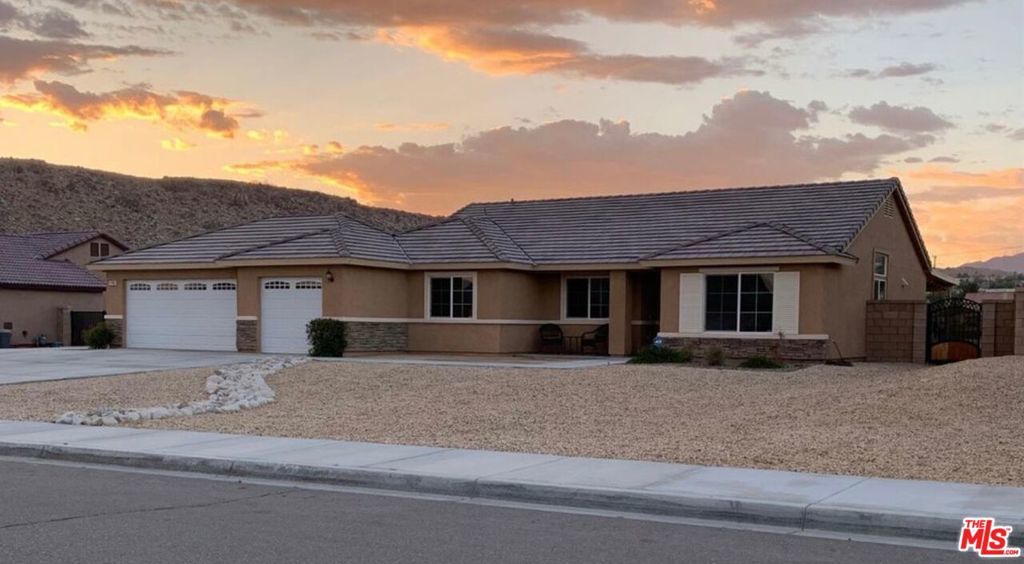 Welcome to this stunning 4-bedroom, 2-bath home in the tranquil, and highly desirable community of Desert Knolls in Apple Valley! With the upcoming Brightline West high-speed rail line project connecting Southern California to Las Vegas, with a stop in Apple Valley, this location is set to become even more accessible and desirable. Nestled on a spacious 11,000+ sq ft lot, this 2006 SF home combines luxury and comfort. As you step inside, you're greeted by a spacious living room with high 9-foot+ ceilings, creating an open and airy atmosphere. The living room flows seamlessly into the separate dining area, ideal for entertaining guests. A bonus room just off the entry door serves as a perfect office or fitness room. The gourmet kitchen, a true highlight, features elegant quartz countertops, modern cabinetry, and top-of-the-line appliances. The primary bedroom offers a peaceful retreat with a walk-in closet and a large, serene bathroom complete with a separate tub and shower. Step outside to discover a vinyl lined saline pool and a covered patio, perfect for alfresco dining and relaxation. The attached 3-car garage provides access directly to the house, and you will also have plenty of space for your RV on the property, accessible through the custom gate. Plus, there are no HOA dues, and the sewer system is conveniently in the street. Enjoy breathtaking scenic desert views all around. Don't miss the opportunity to call this exquisite property your own.