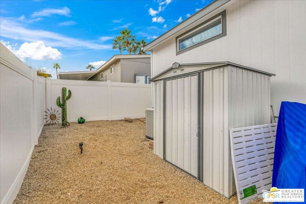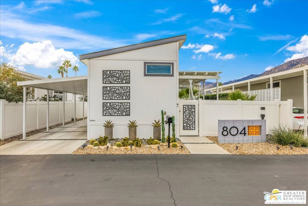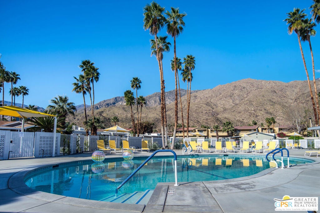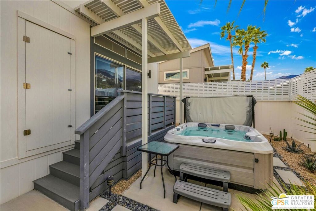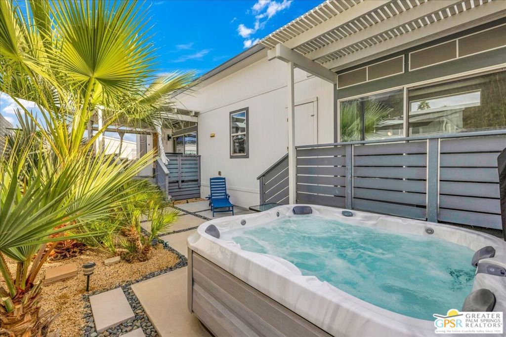 Welcome to the good life in **Palm Canyon Mobile Club**, one of Palm Springs' most desirable gated manufactured home communities, ideally located in sought-after South Palm Springs and surrounded by some of the area's finest neighborhoods. Situated on a quiet street and one of the larger lots in the community, this beautifully maintained two-bedroom, two-bath home offers space, privacy, and effortless desert living. The open-concept living area features nine-foot ceilings and clerestory windows, flooding the home with natural light while framing stunning west-facing mountain views of the San Jacinto range. The modern galley kitchen is both stylish and functional, complete with stainless steel appliances (including a dishwasher), quartz countertops, generous white cabinetry, and a full-size stackable washer and dryer, everything thoughtfully designed for everyday living and entertaining. The split-bedroom layout provides ideal separation and privacy. The primary suite features two mirrored closets, a full en-suite bath with walk-in shower, and a sliding door that opens to a private deck, the perfect place to wake up to mountain views each morning. From the living room, open the sliders to an expansive west-facing deck, ideal for sunset cocktails, morning coffee, or simply soaking in the desert scenery. Outdoor curtains allow you to manage sun exposure year-round, keeping the home cool in summer and bright in winter. The fully enclosed, gated yard offers rare outdoor space and privacy, complete with a stamped concrete patio, your own private Jacuzzi hot tub, and plenty of room for entertaining, lounging, or letting your fur baby roam freely -yes, there's even a doggie door for easy outdoor access. A storage shed,, and an EV car charger add extra convenience. The space rent includes access to exceptional community amenities just a short stroll away: a stylish clubhouse, fitness center, sparkling pool and spa, shuffleboard court, and two dog parks. Palm Canyon Mobile Club offers a vibrant, connected lifestyle, with an active social calendar that brings neighbors together for potlucks, bingo nights, shuffleboard tournaments, and more, along with a strong neighborhood watch that adds to the sense of community, comfort, and peace of mind. With its unbeatable South Palm Springs location, generous lot size, mountain views, and indoor-outdoor lifestyle, this home truly represents one of the best-kept secrets in Palm Springs. Come see it and start living the Palm Springs lifestyle you've been dreaming about.