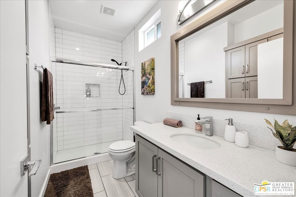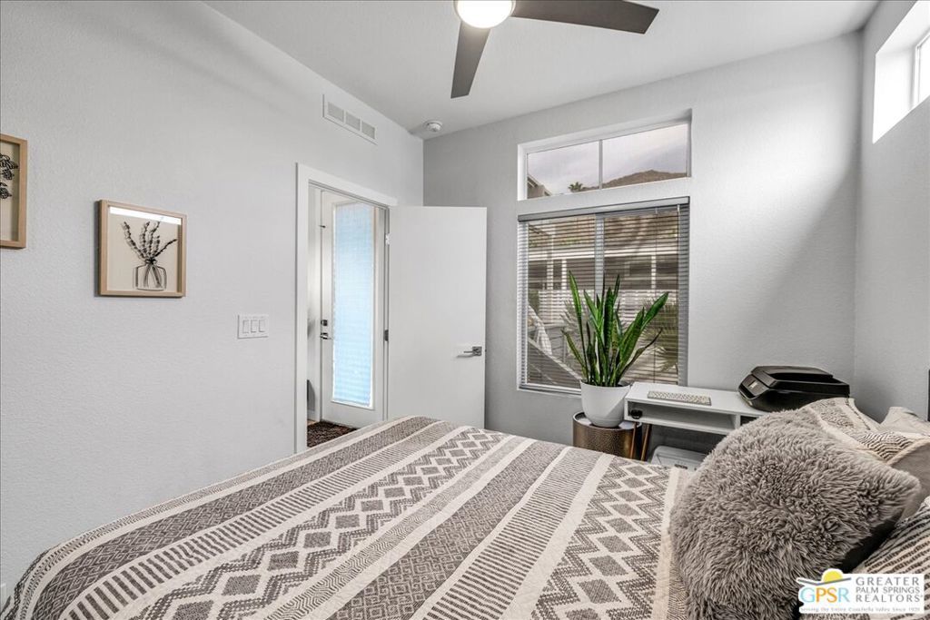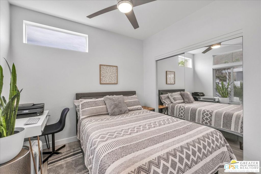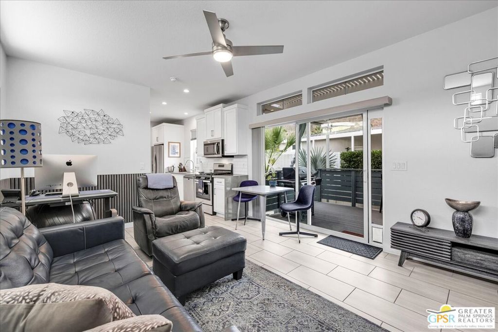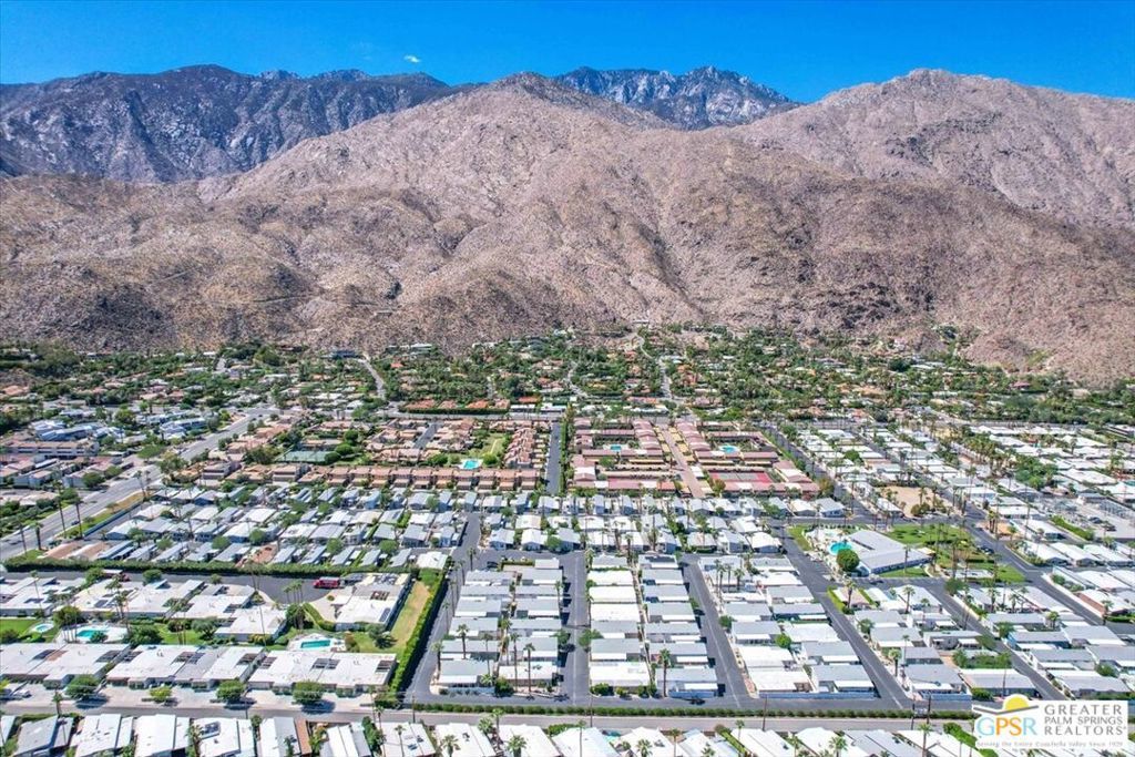Welcome to the good life in **Palm Canyon Mobile Club**, one of Palm Springs' most desirable gated manufactured home communities, ideally located in sought-after South Palm Springs and surrounded by some of the area's finest neighborhoods. Situated on a quiet street and one of the larger lots in the community, this beautifully maintained two-bedroom, two-bath home offers space, privacy, and effortless desert living. The open-concept living area features nine-foot ceilings and clerestory windows, flooding the home with natural light while framing stunning west-facing mountain views of the San Jacinto range. The modern galley kitchen is both stylish and functional, complete with stainless steel appliances (including a dishwasher), quartz countertops, generous white cabinetry, and a full-size stackable washer and dryer, everything thoughtfully designed for everyday living and entertaining. The split-bedroom layout provides ideal separation and privacy. The primary suite features two mirrored closets, a full en-suite bath with walk-in shower, and a sliding door that opens to a private deck, the perfect place to wake up to mountain views each morning. From the living room, open the sliders to an expansive west-facing deck, ideal for sunset cocktails, morning coffee, or simply soaking in the desert scenery. Outdoor curtains allow you to manage sun exposure year-round, keeping the home cool in summer and bright in winter. The fully enclosed, gated yard offers rare outdoor space and privacy, complete with a stamped concrete patio, your own private Jacuzzi hot tub, and plenty of room for entertaining, lounging, or letting your fur baby roam freely -yes, there's even a doggie door for easy outdoor access. A storage shed,, and an EV car charger add extra convenience. The space rent includes access to exceptional community amenities just a short stroll away: a stylish clubhouse, fitness center, sparkling pool and spa, shuffleboard court, and two dog parks. Palm Canyon Mobile Club offers a vibrant, connected lifestyle, with an active social calendar that brings neighbors together for potlucks, bingo nights, shuffleboard tournaments, and more, along with a strong neighborhood watch that adds to the sense of community, comfort, and peace of mind. With its unbeatable South Palm Springs location, generous lot size, mountain views, and indoor-outdoor lifestyle, this home truly represents one of the best-kept secrets in Palm Springs. Come see it and start living the Palm Springs lifestyle you've been dreaming about.