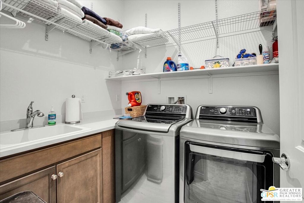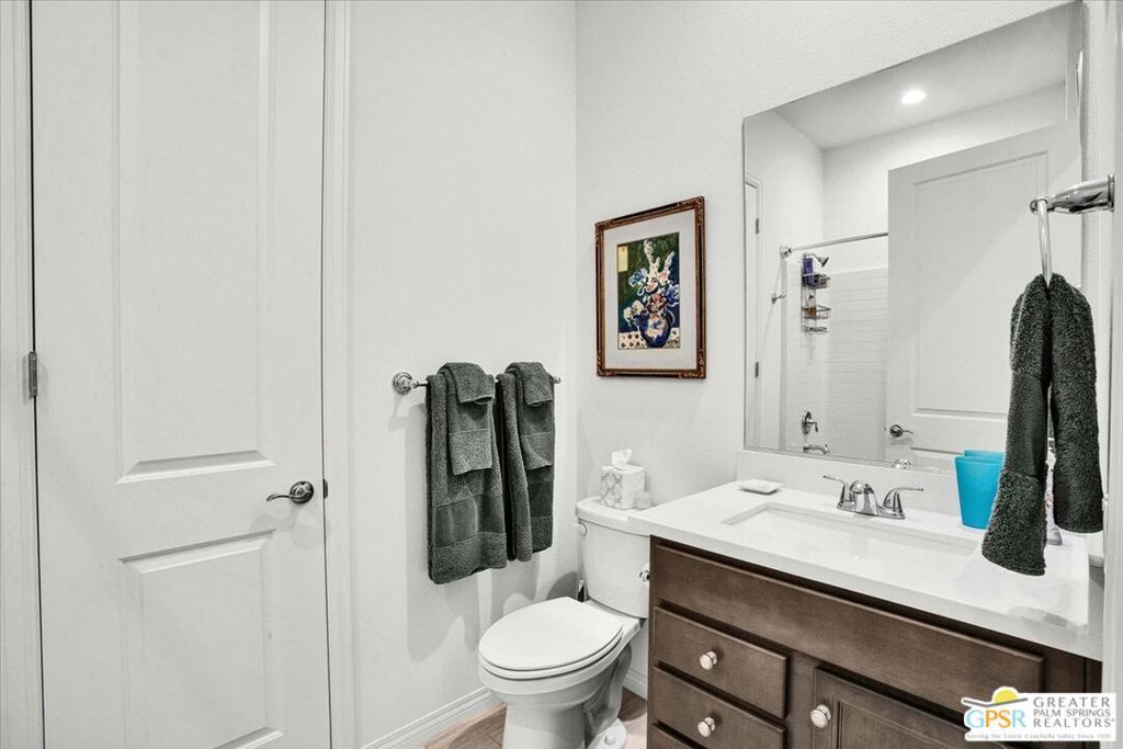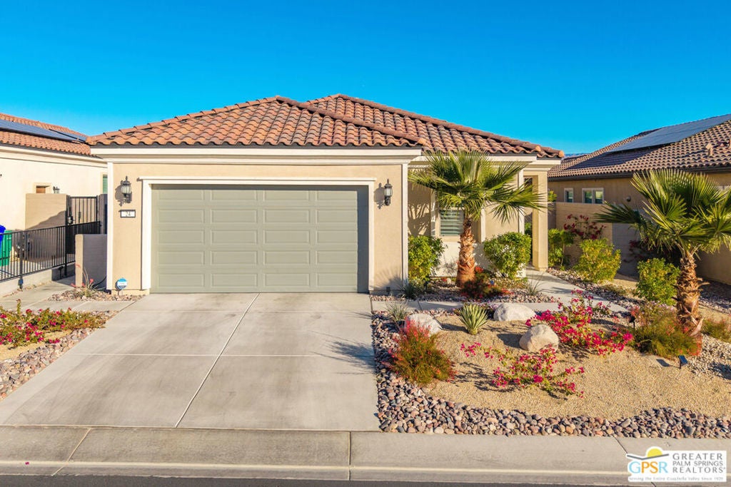 Welcome to luxury living at Del Webb Rancho Mirage's 55+ community! Nestled in phase 6, this upgraded Expedition Model Home offers a truly exceptional living experience. Step into this stunning one-level home built in 2023 and be greeted by 10-foot ceilings and panoramic mountain views. This spacious, 1770 square foot residence features two large bedrooms, two baths, and a den, providing ample space for living, relaxation and entertainment. The interior of the home was completely repainted in April of 2025. The primary bedroom boasts a large walk-in closet, dual vanities in the bath and a linen closet. The second bedroom also offers a walk-in closet, providing extra storage space. The private den offers the perfect office or reading room, located in the front of the home. With an open floor plan seamlessly connecting the kitchen, dining, and living areas, this home is perfect for hosting gatherings or enjoying quiet nights in. This home offers a spacious kitchen with ample cabinetry, a large center island and great storage with a walk-in pantry. The laundry room includes a sink for added convenience and additional shelving above. Custom finish upgrades were made during construction, including prewiring for LVR surround sound, custom tile floors throughout, wood shutters for privacy and sun protection, and owned Solar system! The backyard of this home is completely landscaped to be an entertainer's dream and low maintenance. It offers a covered patio and multiple seating areas. It's the perfect setting for hosting outdoor gatherings or simply relaxing in the sunshine. Living at Del Webb Rancho Mirage means access to an array of exceptional amenities. The 20,000 square-foot clubhouse offers a modern fitness center, aerobics studio, golf simulator, a wine room and an outdoor fireplace. The ballroom is perfect for special events and entertainment. Outdoor enthusiasts will appreciate the large pool and smaller covered pool, as well as the large spa for ultimate relaxation. Stay active with 8 Pickleball courts, 4 tennis courts, 3 bocce courts, a putting green, and six miles of walking trails. There are also dedicated dog areas for your furry friends. At Del Webb Rancho Mirage, residents can enjoy a well-organized and endless variety of activities and events tailored to their interests. It's the perfect place to create lasting memories and forge new friendships.