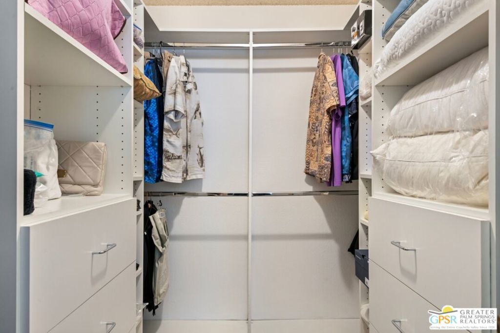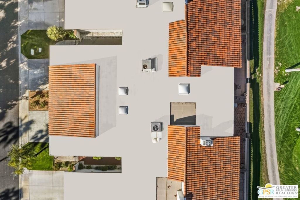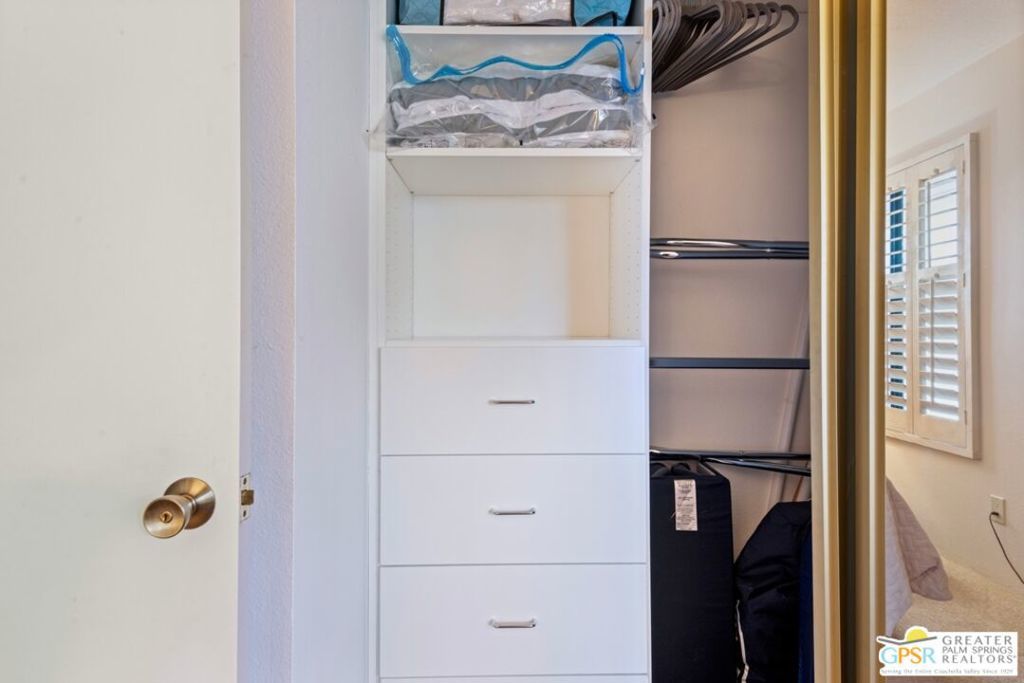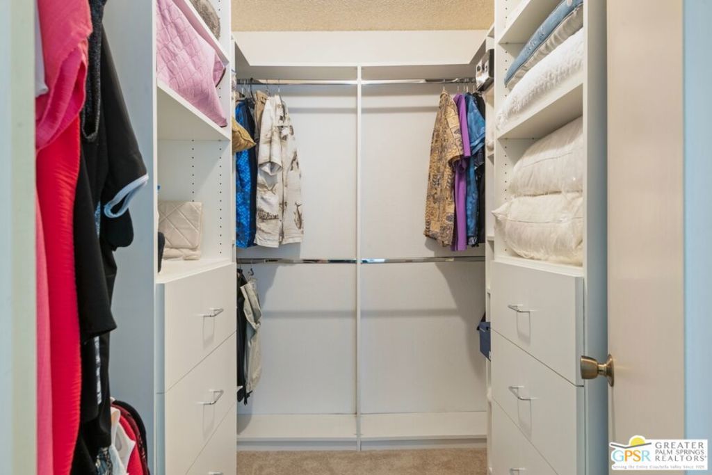 Welcome to this desirable southwest-themed home in the sought-after Rancho Las Palmas Country Club community. This spacious condo features a large, open floor plan with vaulted ceilings in both the living and dining rooms, creating an airy, inviting atmosphere. The updated kitchen boasts beautiful granite countertops, new flooring and opens to the main living areas. Enjoy stunning golf course views from your large private patio, perfect for morning coffee or evening relaxation.The primary suite includes a walk-in closet with two nice built-ins for exceptional storage. The second bedroom also features a closet with built-in dresser, providing thoughtful organization throughout. Cozy up by the gas fireplace on cooler evenings, and enjoy year-round comfort with the HVAC heat pump system replaced in January 2024. Modern conveniences include a web-friendly programmable door lock and thermostat for easy remote access. The deep 2.5-car garage features vaulted ceilings and includes two secure storage lockers (removable upon request). Located in a quiet cul-de-sac with mature orange, grapefruit, and lemon trees, this home is just steps from the community pool & spa. Southwest-themed decor is included, adding instant charm and character. Don't miss this opportunity!