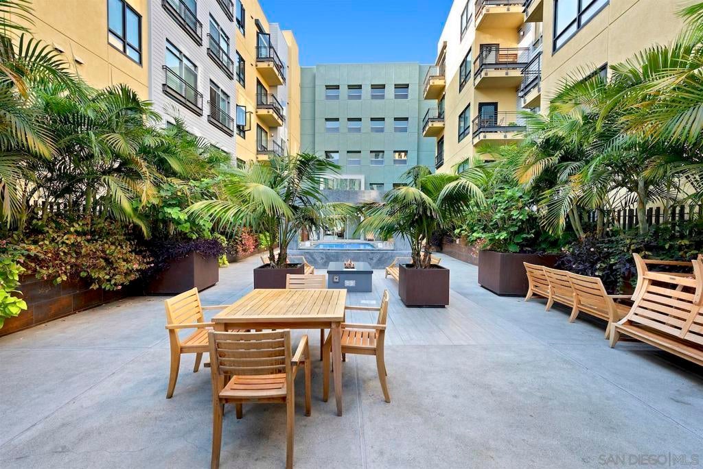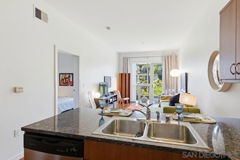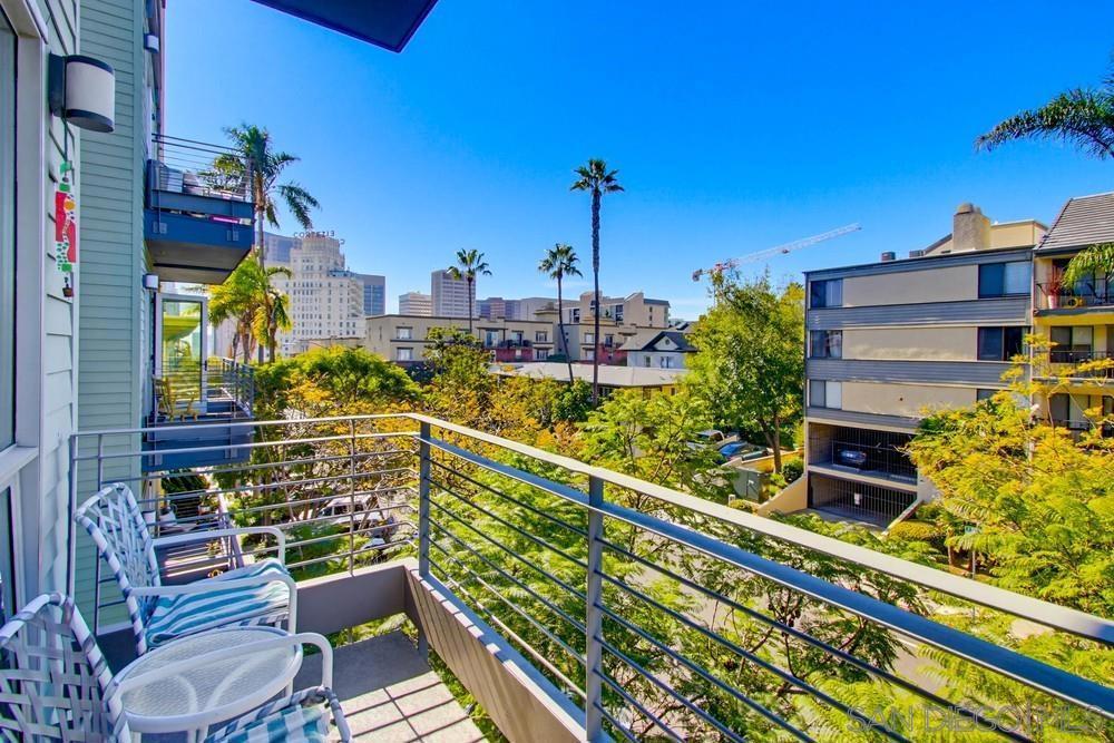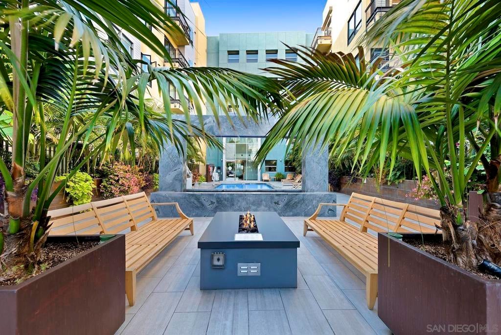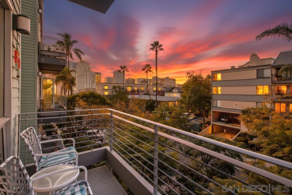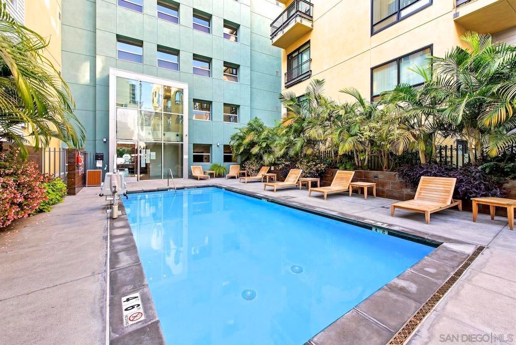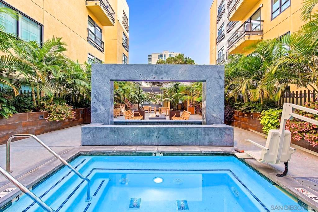 Live in the quaint Cortez Hill neighborhood in this beautiful, turn-key 1-bedroom residence. The open-concept layout is enhanced by high ceilings and luxury laminate plank flooring throughout. Enjoy sunsets from your private west-facing balcony overlooking the city. The kitchen features granite countertops and a breakfast bar. Additional highlights include central air conditioning and an in-unit laundry closet with washer and dryer, and 1 deeded parking space in underground garage. The building amenities include a pool, spa, gym,fire pit sitting area, BBQ area, and concierge staff 7 days a week. Easy freeway access. Walk to Little Italy, Gaslamp & Balboa Park from this central location.