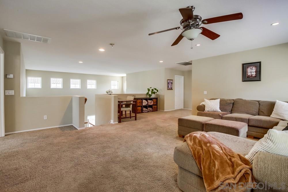 Stunning home in the highly sought-after Santa Fe Hills community, tucked away on a quiet cul-de-sac, offering a bright open floor plan with soaring ceilings and abundant natural light. The spacious layout includes a large upstairs bonus loft for flexible living space, along with a full bedroom and bathroom on the main level ideal for guests or a private home office. The kitchen features generous cabinetry and ample counter space and opens to an inviting family room with a cozy fireplace. Upstairs are three additional bedrooms, including a spacious primary suite with dual walk-in closets and a well-appointed bathroom with dual vanities, while front bedrooms enjoy distant ocean views. Additional highlights include an upstairs laundry room with sink, a three-car garage, and an extended driveway for extra parking. The private backyard is beautifully hardscaped and designed for low-maintenance outdoor living with a fire pit and dog run. Conveniently located near parks, top-rated schools, shopping, dining, Palomar College, CSU San Marcos, and with easy access to Highway 78. Move-in ready and a must-see. Stunning home in the highly sought-after Santa Fe Hills community, tucked away on a quiet cul-de-sac, offering a bright open floor plan with soaring ceilings and abundant natural light. The spacious layout includes a large upstairs bonus loft for flexible living space, along with a full bedroom and bathroom on the main level ideal for guests or a private home office. The kitchen features generous cabinetry and ample counter space and opens to an inviting family room with a cozy fireplace. Upstairs are three additional bedrooms, including a spacious primary suite with dual walk-in closets and a well-appointed bathroom with dual vanities, while front bedrooms enjoy distant ocean views. Additional highlights include an upstairs laundry room with sink, a three-car garage, and an extended driveway for extra parking. The private backyard is beautifully hardscaped and designed for low-maintenance outdoor living with a fire pit and dog run. Conveniently located near parks, top-rated schools, shopping, dining, Palomar College, CSU San Marcos, and with easy access to Highway 78. Move-in ready and a must-see.