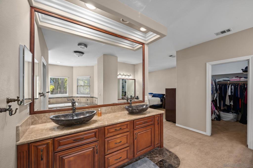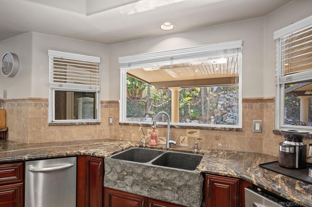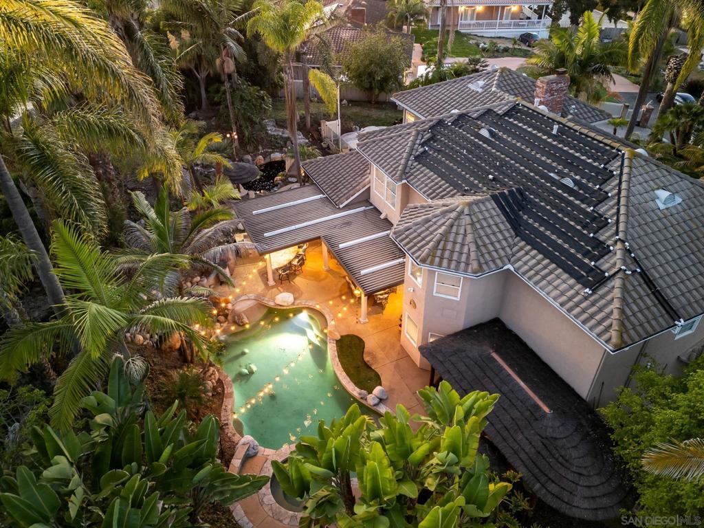 Tucked away on a private cul-de-sac, this extraordinary 3,943 sq. ft. custom estate in Vista captures the essence of luxury Southern California living. Set on over half an acre with room for an ADU and elevated panoramic views, the home’s refined design features travertine and hardwood flooring, a chef’s kitchen with Wolf range and hood, a whole-stone granite sink, and rich granite slab counters. Entertain in style with a dedicated wine room, elegant fireplaces, and a private music studio with full bath above the garage(could be another huge bedroom). The expansive primary suite offers a walk-in closet and peaceful garden views. Outdoors, enjoy a resort-inspired setting with a sparkling pool and spa, two cascading waterfalls, fire pit, koi pond with bridge, and lush fruit trees including apple, lemon, lime, tangerine, blueberry, and grape. Pig pit and garden areas with bird aviary top the lot off. Over 800 sqft. of covered space hosts a full granite outdoor kitchen, grill, ovens, bar seating, and lounge areas amid stunning landscaped grounds.