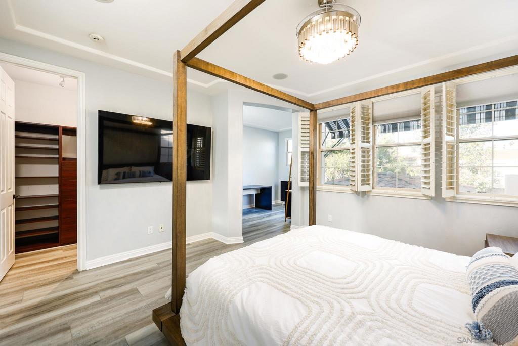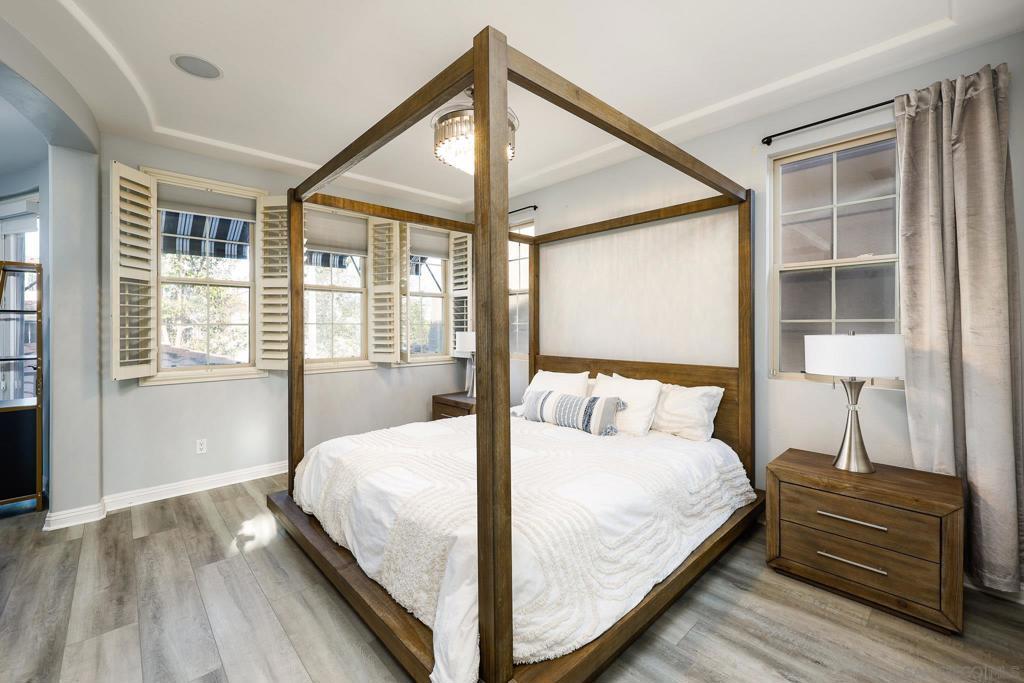 Rarely available, turn-key 3-bedroom, 3-bath home with a third-floor loft featuring a 10-foot movie screen, located on one of Liberty Station’s most private, low-traffic streets. This spacious residence has been thoughtfully upgraded with vinyl wood plank flooring, custom blinds, updated light fixtures, and a brand-new HVAC system. Additional highlights include a private enclosed courtyard at the entry, solar, a water softening system, and a Tesla charger in the attached two-car garage with overhead storage. Situated within the master-planned Liberty Station community, this home appeals to a variety of lifestyles and is designed for comfortable everyday living. Enjoy a low HOA, an unbeatable central location minutes to the airport, and close proximity to dining, arts, entertainment, schools, and convenient retail.