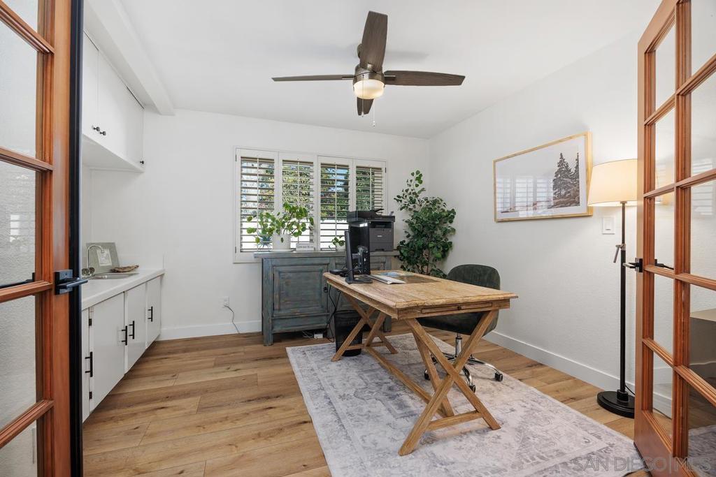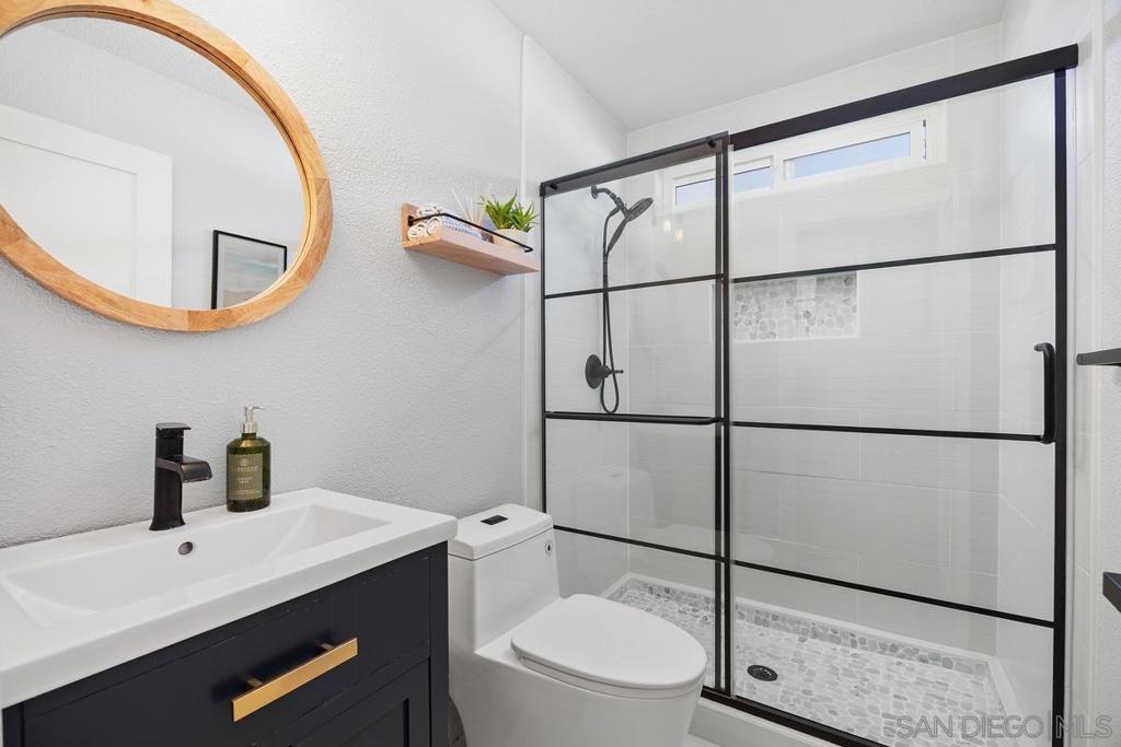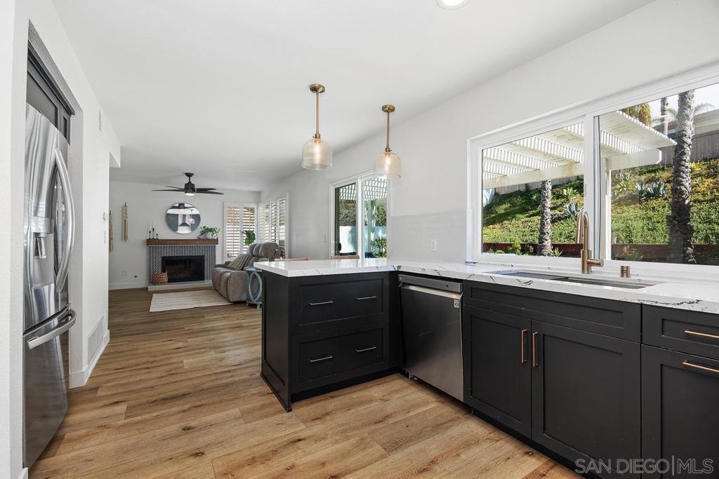 Discover modern luxury in this beautifully reimagined 4 bedroom, 3 bath, 2 story single family home, where every detail has been meticulously updated featuring custom built cabinets, quartz countertops, stainless steel LG appliances all purchased new in 2023, and designer sourced hardware. Luxury Vinyl Wood Plank flooring, contemporary 5.5 inch modern baseboards, and a striking resurfaced fireplace paired with a substantial wooden mantle. Complemented by all new designer light fixtures, a stunning mid- century pendant chandelier and elegant sconces. Each bathroom has been completely transformed with high-end design for a spa like retreat. An elegant traditional wood French door separates the study from the living area enhancing the open concept feel. Paid for solar to enhance energy efficiency and reduce costs. Situated on a quiet cul-de-sac on a .26 acre lot that offers the perfect blend of privacy and convenience. The yard is a true highlight featuring a spacious covered patio perfect for outdoor gatherings. The generous lawn provides ample space for recreation or additions such as a pool or pickleball court. Minutes from high end grocery shopping, premium fitness centers, upscale retail and in the award-winning Encinitas Union school district. Enjoy proximity to championship golf courses, the renowned Omni La Costa Resort & Spa, Batiquitos Lagoon, and one of Carlsbad's most picturesque beaches just under 3.5 miles away for effortless coastal living. Don't miss this rare opportunity to own a fully updated gem in one of Carlsbad's most sought after neighborhoods