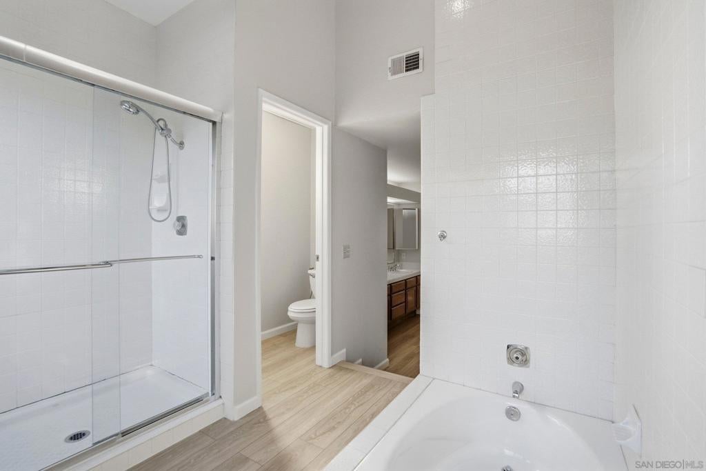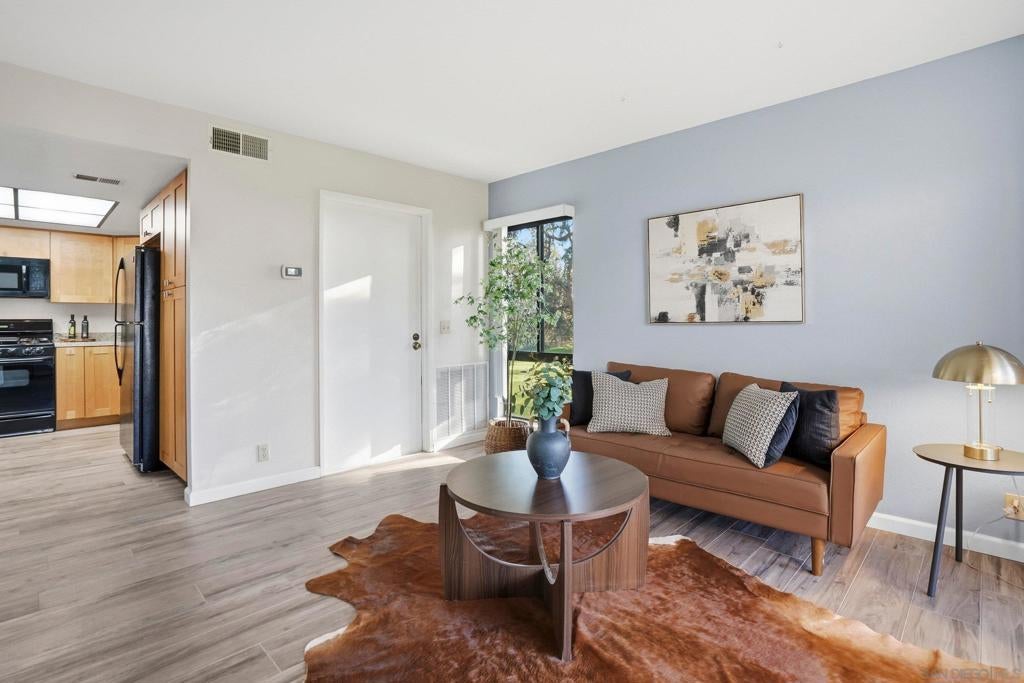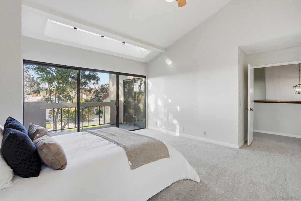Discover modern elegance in this beautifully updated 1,913 sq. ft. residence located in the desirable Villa Dominique View Homes of Tierrasanta. Featuring 2 bedrooms, plus loft, and 2.5 bathrooms, this home has been mindfully maintained with a newer roof, fresh paint, and a gourmet kitchen remodel completed in 2020 featuring granite counters, new cabinetry, and stainless steel appliances. The interior makes a striking impression with 20ft high ceilings and an open-flow design highlighted by a stacked stone fireplace and wood-look porcelain tile flooring. A versatile primary suite includes an additional vaulted ceiling and a dedicated loft/office space, a wet bar, and a private balcony, while the main level opens to a patio off the family room for seamless indoor-outdoor living and a striking Westerly view. High-end details abound, including brand-new carpet, elegant chandeliers, and a reverse osmosis water filtration system. This FHA and VA-approved property offers the security of a 2-car attached garage with direct entry and access to a community pool and spa. Situated in a quiet building of only four units, this turnkey home perfectly balances architectural character with contemporary luxury in a prime San Diego location with access to 8000 acres of Mission Trails Region Park just steps from the front door.