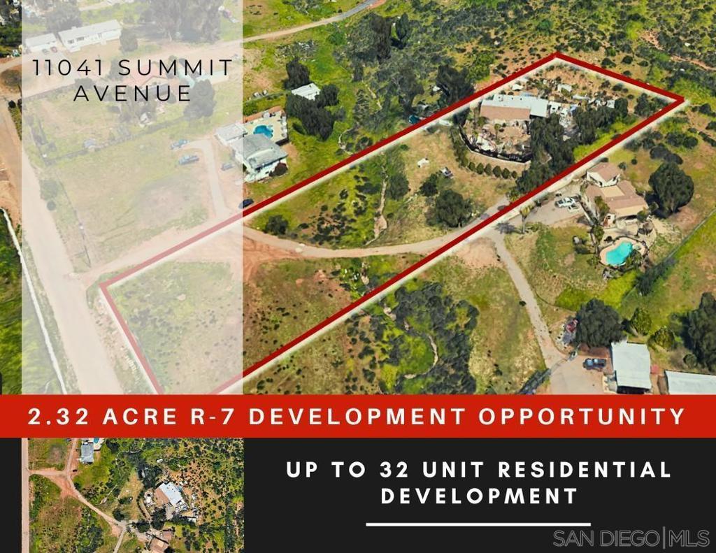 Price Range: $1,749,999 - $1,950,000. R-7 Zoning! Up to 32 Unit Development Opportunity on this 2.32 Acre Property. This property is the absolute best of both worlds, live in a country-esque environment while only being minutes away from shopping centers and freeways. Fell good knowing you can make this home exactly how you want with your own touches all while knowing you have an incredible growing value in the land you live on. Property features fully owned solar, upgraded electrical panel and new roof on main house, all only 2-3 years old. Home is extremely spacious with interior dimensions measuring approximately 2589 sqft. Property shows as 2 units on tax records. Parcel was approved for up-zoning to R-7 by the City of Santee as part of the 6th Cycle Housing Element. R-7 Zoning allows for 7 to 14 units per gross acre. It is a Medium Density Residential General Plan designation. Per the city's zoning code, the R-7 zone "is intended for a wide range of multiple family residential development types including detached units in planned residential development at the lower end of the density range and attached units at the higher end of the density range." Maximum lot coverage is 55%, maximum height is 35 feet/three stories, and there is no minimum lot size. Price Range: $1,749,999 - $1,950,000. Home is extremely spacious with interior dimensions measuring approximately 2589 sqft. Property shows as 2 units on tax records. Parcel was approved for up-zoning to R-7 by the City of Santee as part of the 6th Cycle Housing Element. R-7 Zoning allows for 7 to 14 units per gross acre. It is a Medium Density Residential General Plan designation. Per the city's zoning code, the R-7 zone "is intended for a wide range of multiple family residential development types including detached units in planned residential development at the lower end of the density range and attached units at the higher end of the density range." Maximum lot coverage is 55%, maximum height is 35 feet/three stories, and there is no minimum lot size.