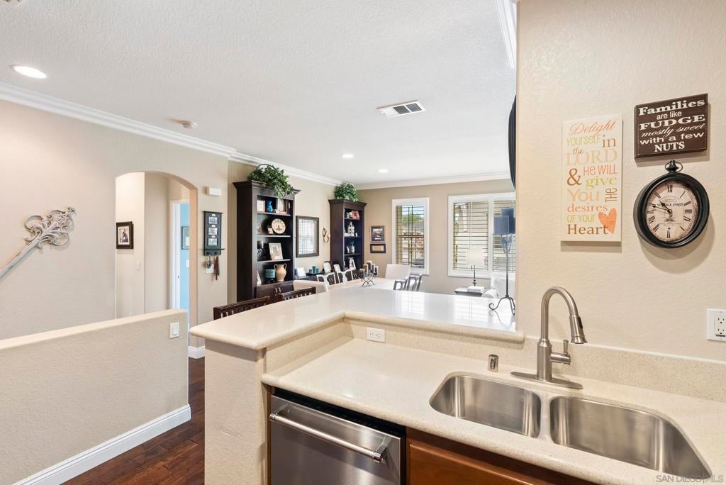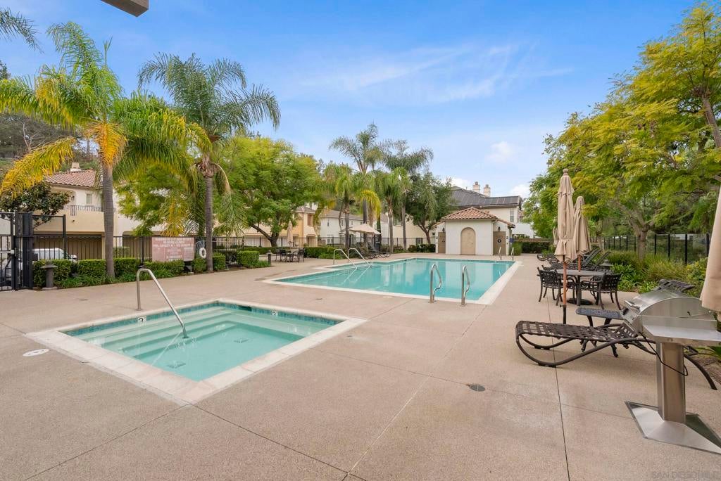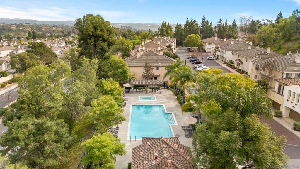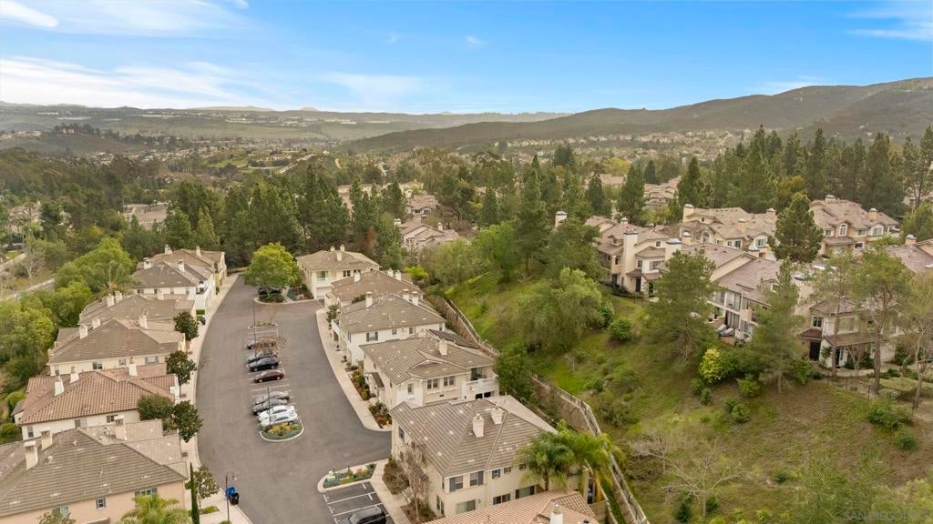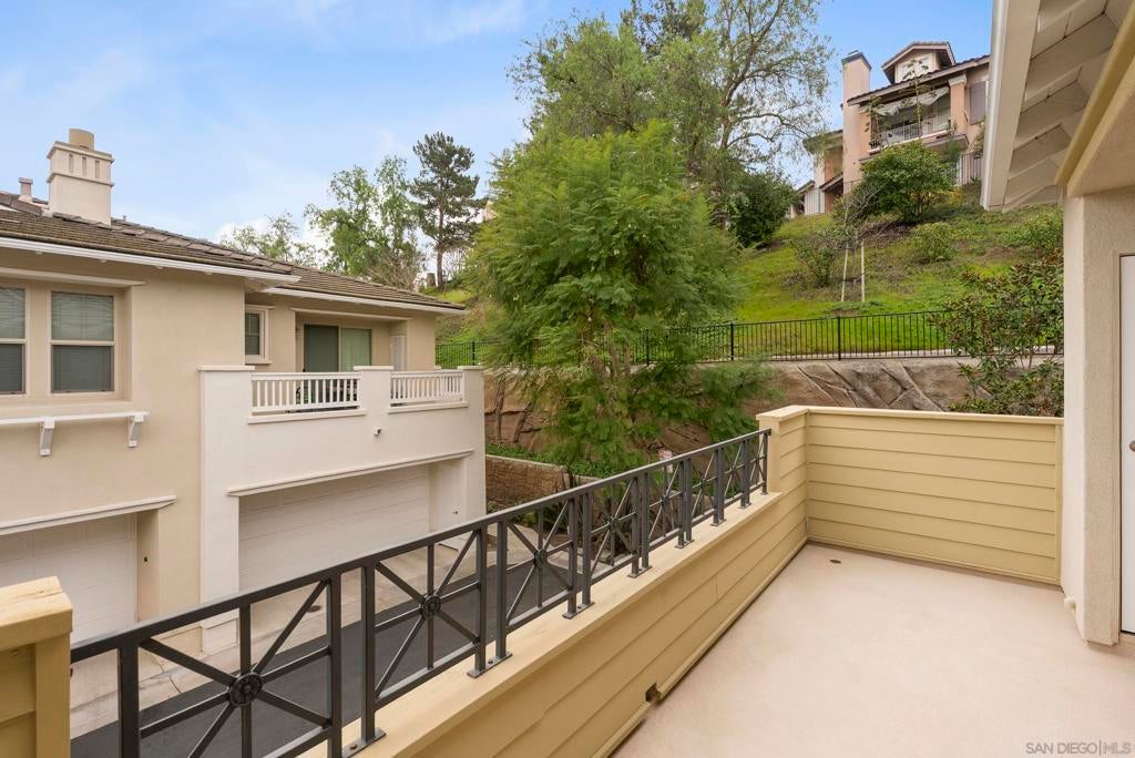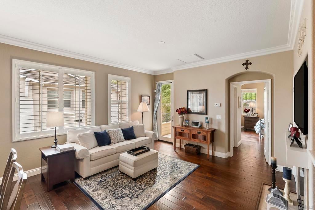 Impeccably maintained 2-bedroom, 2-bath residence in the sought-after Cypress Greens community of Carmel Mountain Ranch. Built by Shea Homes in 2008 and owned by the original buyer, this top-story end unit is positioned above the garages with no units below and windows on three sides, creating exceptional privacy, natural light, and a layout that truly lives more like a single-family home. Inside, the thoughtfully upgraded living space features hand-scraped distressed engineered hardwood flooring (see suppl) throughout the main living areas, bedrooms, and kitchen. The kitchen is both stylish and functional with stainless steel appliances, including a recently installed quiet-run dishwasher and microwave, quartz countertops, and a convenient two-seat eat-at bar. A custom built-in storage and shelving feature adds character and smart functionality to the dining area. The living room is anchored by a wall of southeast-facing windows, dressed with plantation shutters that flood the space with beautiful morning light, while the fireplace creates a cozy place to unwind in the evenings. Step outside to your private patio, with direct access from both the family room and the primary suite—ideal for relaxing or entertaining. Additional highlights include a direct-access one-car garage with storage racks, plus a deeded surface parking space, offering two total parking spots. Ideally located directly across from the community pool, spa, and outdoor gathering areas, this home also enjoys NO Mello-Roos taxes, easy access to shopping, dining, and major commuter routes, and all the benefits of Carmel Mountain Ranch living.