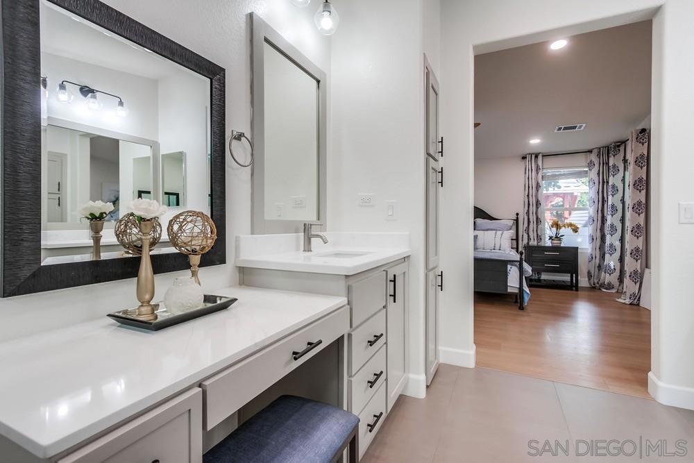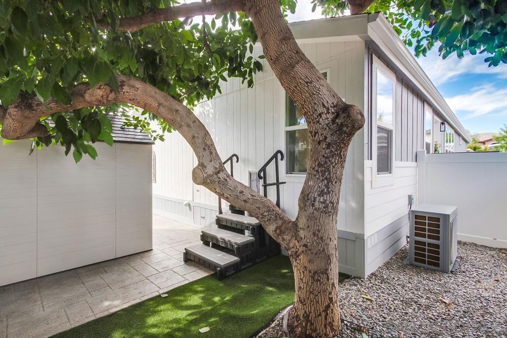 This is the one you have been waiting for in Madrid Manor where you OWN the LAND! 1 year old house with 3 bedrooms, 2 bath, open concept living, custom flooring thru out including Luxury Vinyl Plank, tiled bathrooms and indoor laundry room. (no carpet) kitchen with marble backsplash, Touch faucet, reverse osmosis system, lots of storage with cabinets upgraded with pull outs, walk in pantry, upgraded stainless steel appliances and new wine fridge. Wine and coffee area, center island with custom porcelain countertop, hard surface countertops thru out. Fireplace with custom surround and plug for tv above, spacious master suite with walk in closet with closet organizers and cabinetry, tiled shower, double vanities and custom make up area. Upgraded lighting in baths, dining and exterior. Front spare bedrooms with hall office area and French doors into spare. Custom ceiling fans in each room and many additional ceiling lights thru out home. Exterior painted in light grey and white, large private outdoor space with stamped concrete that looks like pavers, vinyl fenced large yard, new shed. Ring camera, Low maintenance landscape on automated drip system and to top it off a great Avacado tree! Home is 15 months New! Home located in the esteemed 55+ Madrid Manor community in San Marcos. YOU OWN THE LAND!! Madrid Manor has many amenities, including a pool, spa, clubhouse, tennis/pickleball courts, billiard room, card/game room, and library, in addition to numerous social events. The manufactured home has a 433 A permanent foundation.