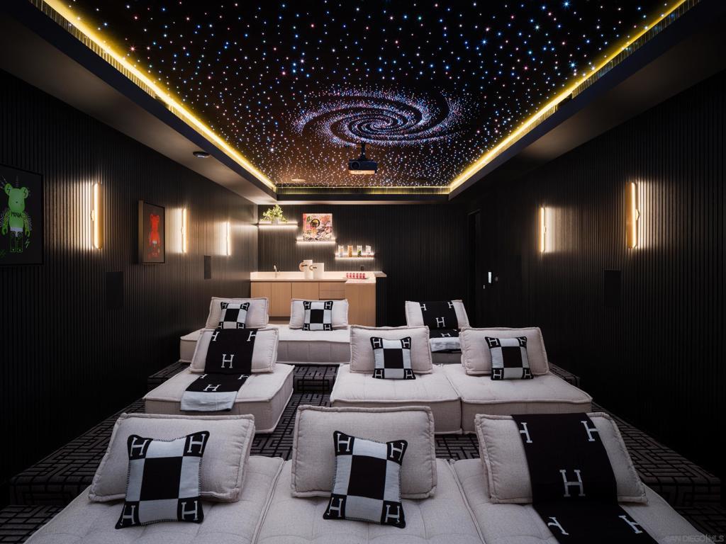 Perched in the heart of the esteemed Muirlands, this fully double gated estate built for privacy and security, features custom aluminum modern gates that open to a double courtyard motor court with custom glass doors and oversize garages, adding a touch of exclusivity to this architectural marvel. This one of a kind residence stands as a bold testament to architectural brilliance and luxury living. A true masterpiece of modern design featuring soft tones, soaring ceilings, and a flawless fusion of sleek lines and warm natural accents. This is more than a home; it is an unparalleled expression of contemporary elegance and timeless sophistication, setting a new standard for opulent living in San Diego. At first glance, the scale of the residence is awe-inspiring, with towering 19-foot ceilings that amplify the sense of space and light throughout. A grand courtyard entry sets the tone, featuring a tranquil reflecting pond, stainless steel sculpture, and a stunning 26-foot water feature adorned with travertine slabs—an exquisite welcome that encapsulates the home's commitment to timeless design. Inside, 11-foot glass pocket doors and clear story windows effortlessly blend indoor and outdoor spaces, inviting natural light to play across sleek, modern interiors. The Southern exposure bathes each room in warmth, complemented by cantilevered steel beam construction that spans the entire length of the residence, showcasing a harmony of form and function rarely seen. The main level epitomizes luxury with its maid quarters, three en-suite guest bedrooms, and a primary suite complete with a designer closet that exudes spaciousness and elegance. White oak floors and Italian Kitchen-designed cabinets underscore the home's commitment to quality craftsmanship, while a double travertine island and top-of-the-line Miele appliances grace the expansive main kitchen along with a Thermador professional grade prep and catering kitchen, ensuring culinary excellence at every turn. Designed with entertainment in mind, the lower level is a haven for leisure and recreation, featuring a state-of-the-artFull Swing Golf and Sports simulator, a 12-person movie theater, temperature controlled wine cellar and display, and a full-sized gym complimented by a dry sauna and steam room. A bar and billiards room offers a sophisticated space for gatherings, while the adjacent flat, usable yard beckons families with its potential for outdoor activities and additional amenities like a sports court. Outside, the 60 ft pool stands as a focal point of the main level amenities, with its brilliant pure white finish, baja shelf and spa. The custom swim-up bar features a full kitchen, complete with a U-shaped wraparound travertine slab bar and full outdoor kitchen and fireplace. The ambiance continues to enchant with a one bedroom guest house, complete with its own kitchenette and living area. Tropical landscaping surrounds the majestic pool, outlined by beautiful olive trees, walls of lush green hedges that guarantee total privacy. Ascending to the top level reveals a staircase adorned with a remarkable 300-year-old olive tree, guiding residents to a spacious office or art studio, accompanied by a versatile flex room ideal for a library, music room, or lounge area. Evenings come alive in the outdoor movie theater with a 148" YOLO outdoor television, complemented by an additional outdoor kitchen and fireplace, perfect for hosting unforgettable gatherings under the stars. The property features a smart home full automation RTI system inclusive of 32 security cameras and Doorbird gate systems, 79 surround sound speaker system, Lutron lighting system, pre-wired for custom blinds, complete VRF multizone Daikin HVAC system, and touch screen capabilities from Ipads throughout the property as well as your personal mobile device for remote access. With a doublewide and double height garage on each of side of the house the garage has the capability of becoming a 4 car garage on bot...